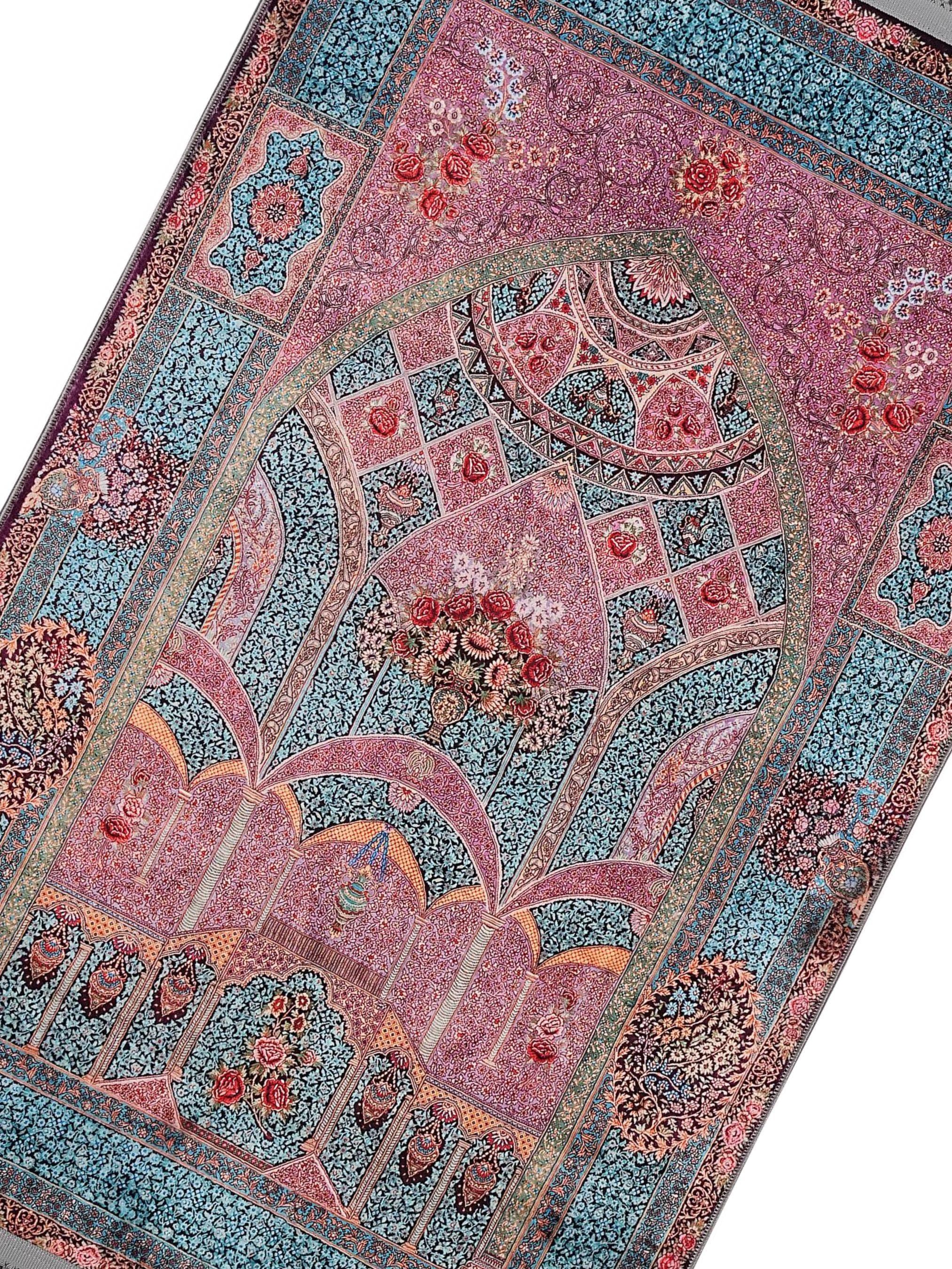 🧕 Soft Pink & Blue Islamic Prayer Rug – Elegant Sejadah Mat with a pile‑textured surface, perfect for Muslim home décor, daily salah, and meaningful gifts for Mom, Dad, Teacher, or Boss. Ideal for both mosque and home use.