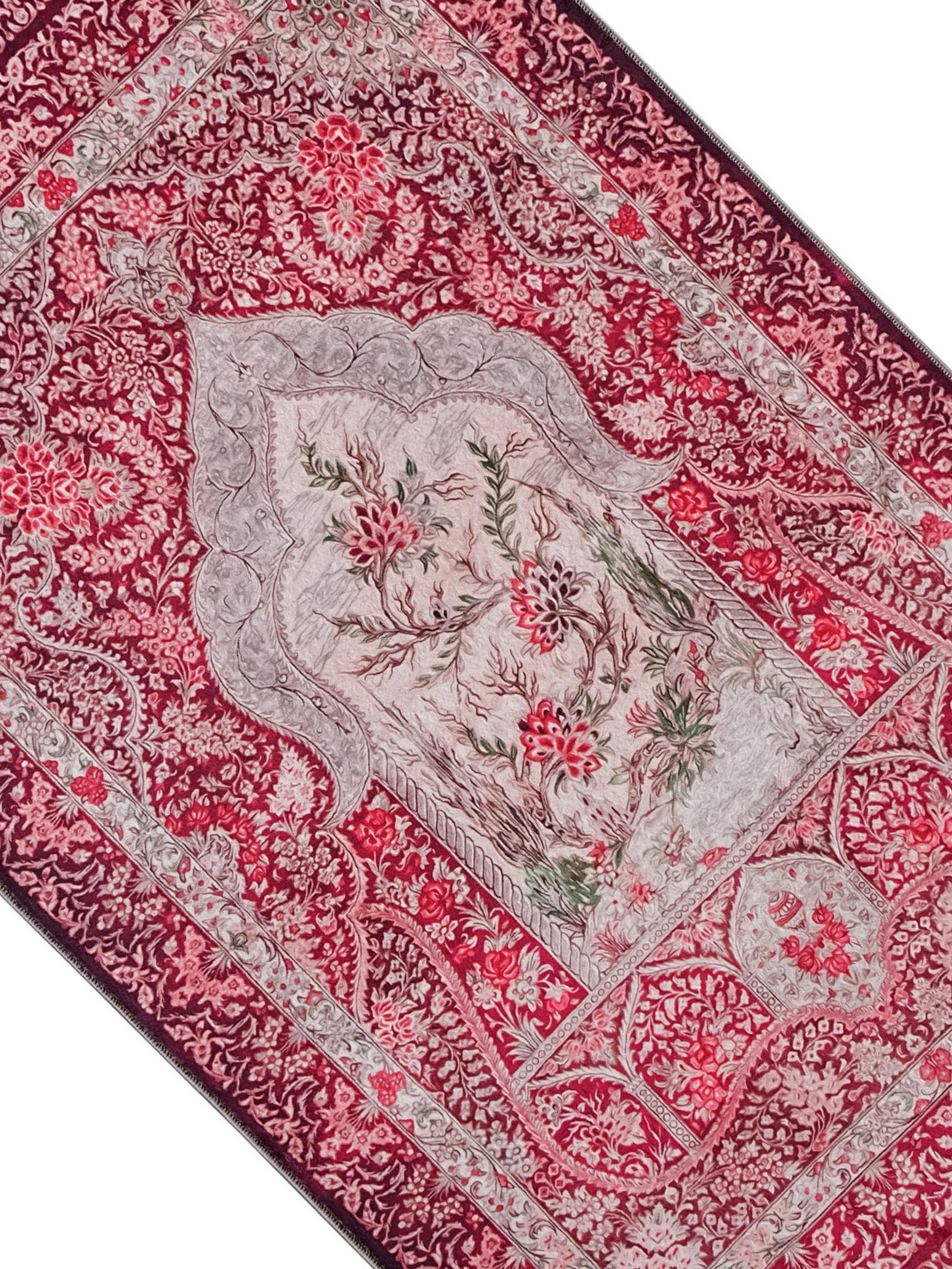 This Turkish Prayer Rug features a breathtaking Ottoman floral medallion pattern in rich red and grey hues. The floral mihrab frame echoes classical Islamic artistry, perfect for those seeking both serenity and visual harmony.