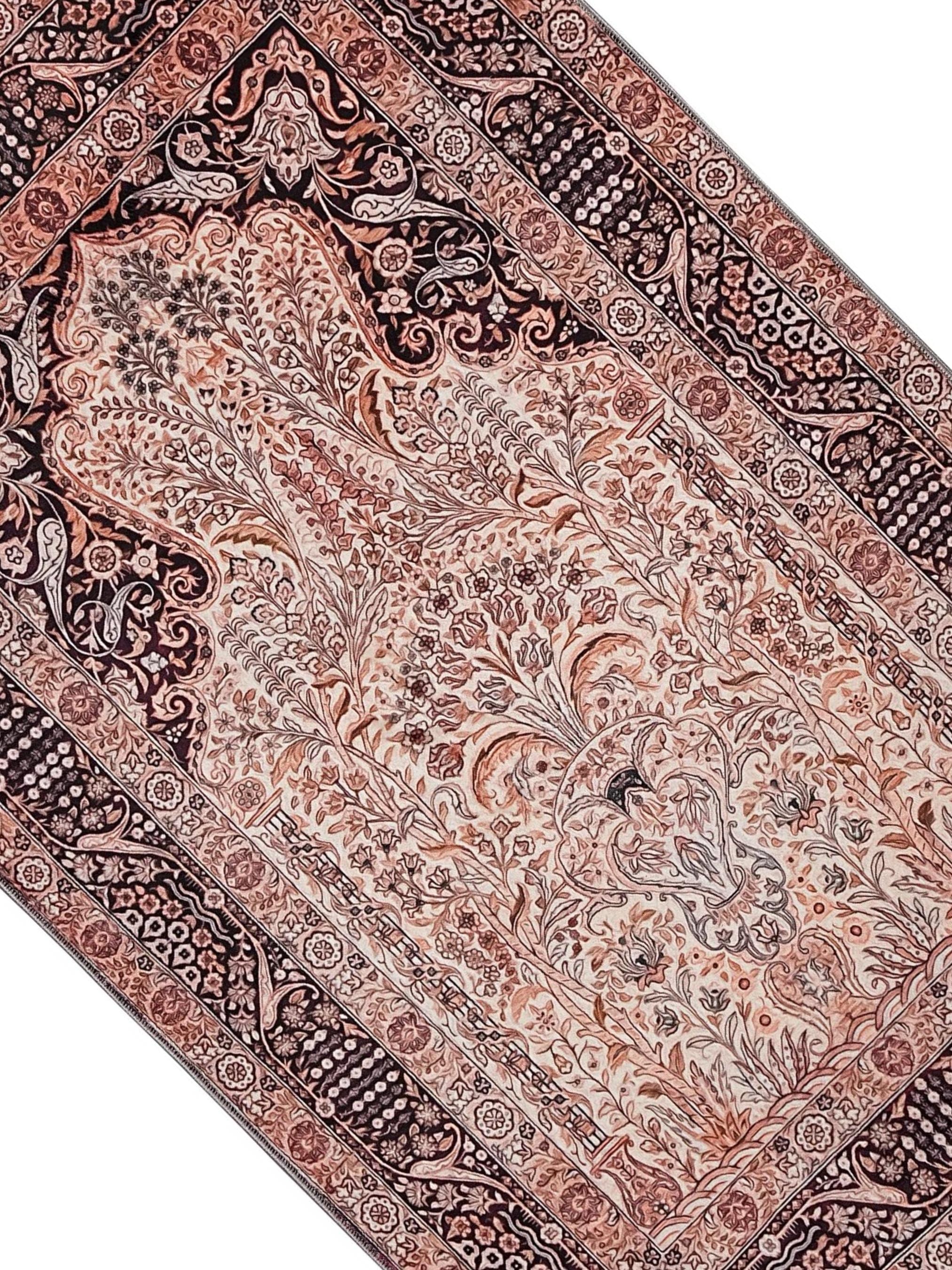 This elegant Islamic prayer rug features an intricate brown and cream floral pattern, inspired by traditional Turkish motifs. The detailed botanical layout adds sophistication to any prayer area while ensuring comfort and softness during daily use.