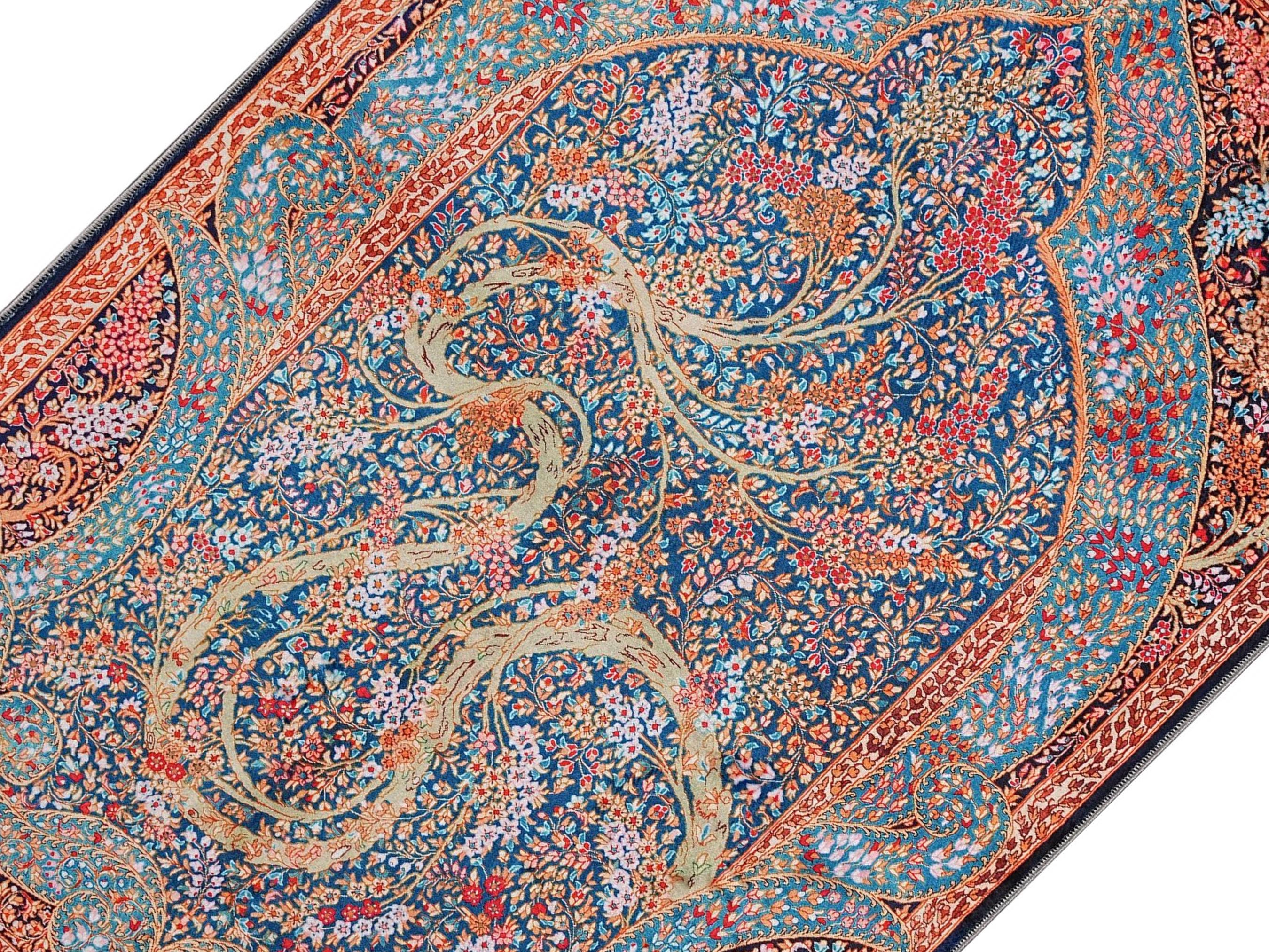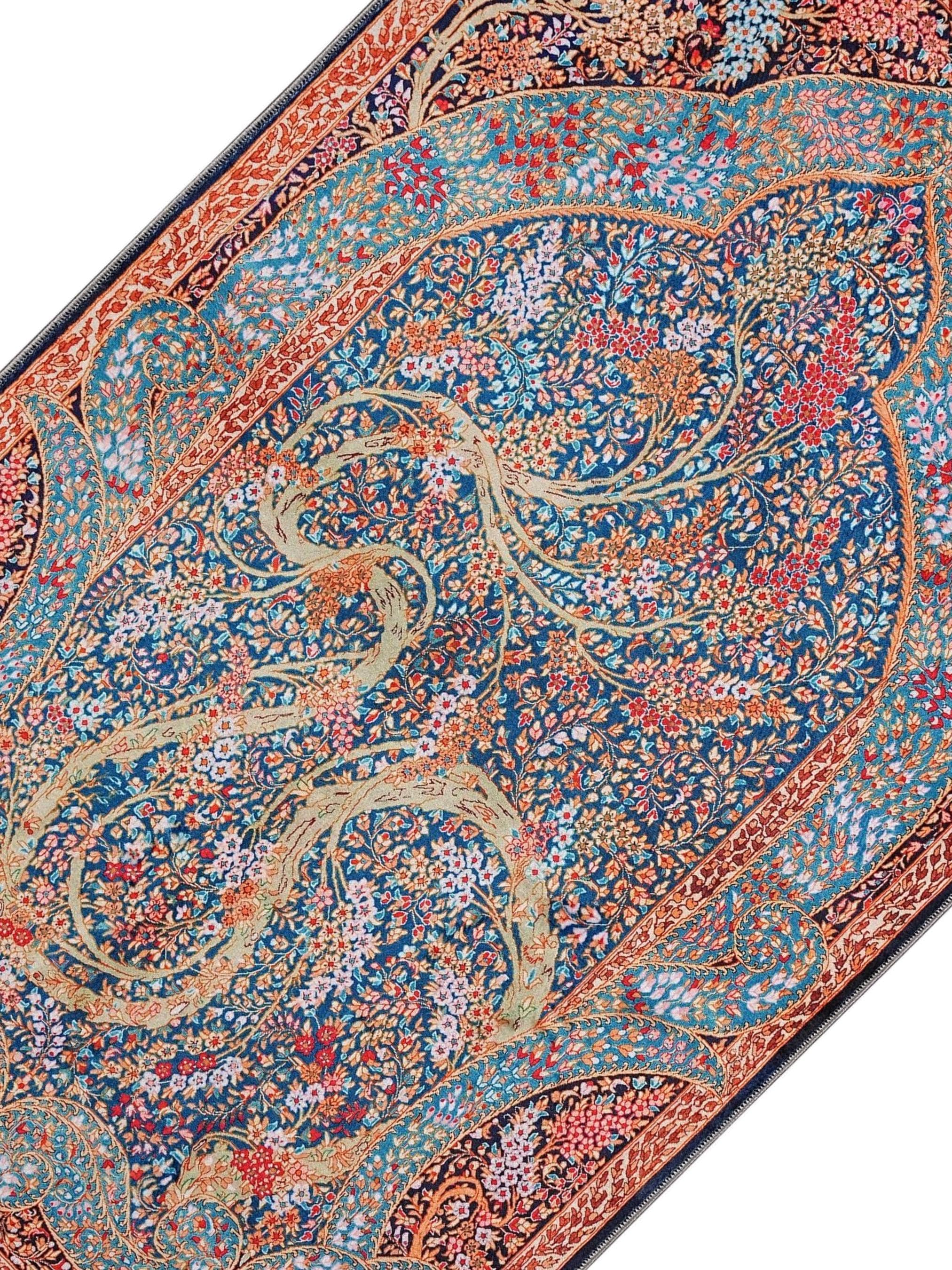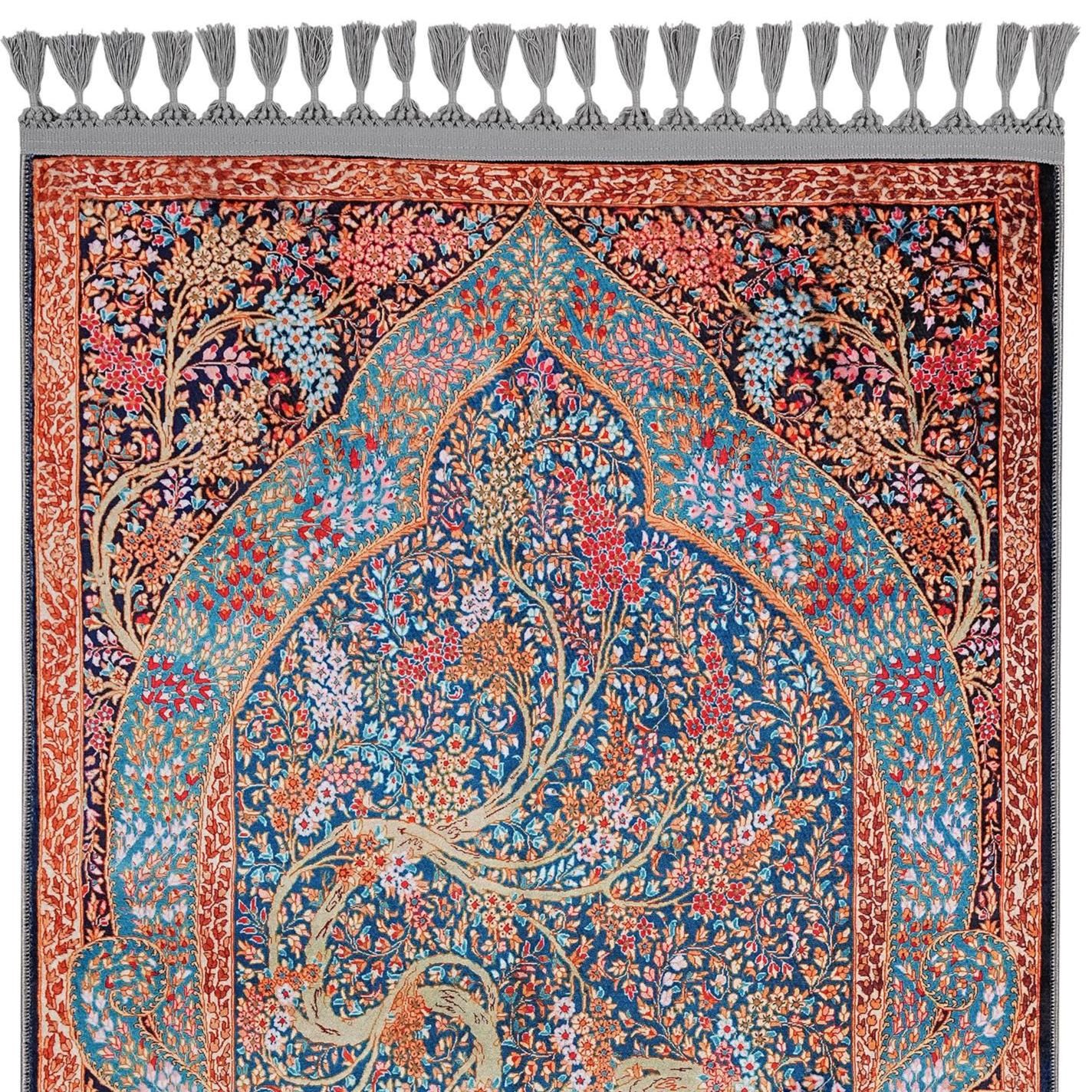 This breathtaking Islamic prayer rug features an intricate blue and red floral motif inspired by the tree of life, symbolizing spiritual growth and connection. Its detailed composition reflects deep cultural heritage and sacred geometry, making it ideal for your prayer space or as an elegant Islamic wall hanging.