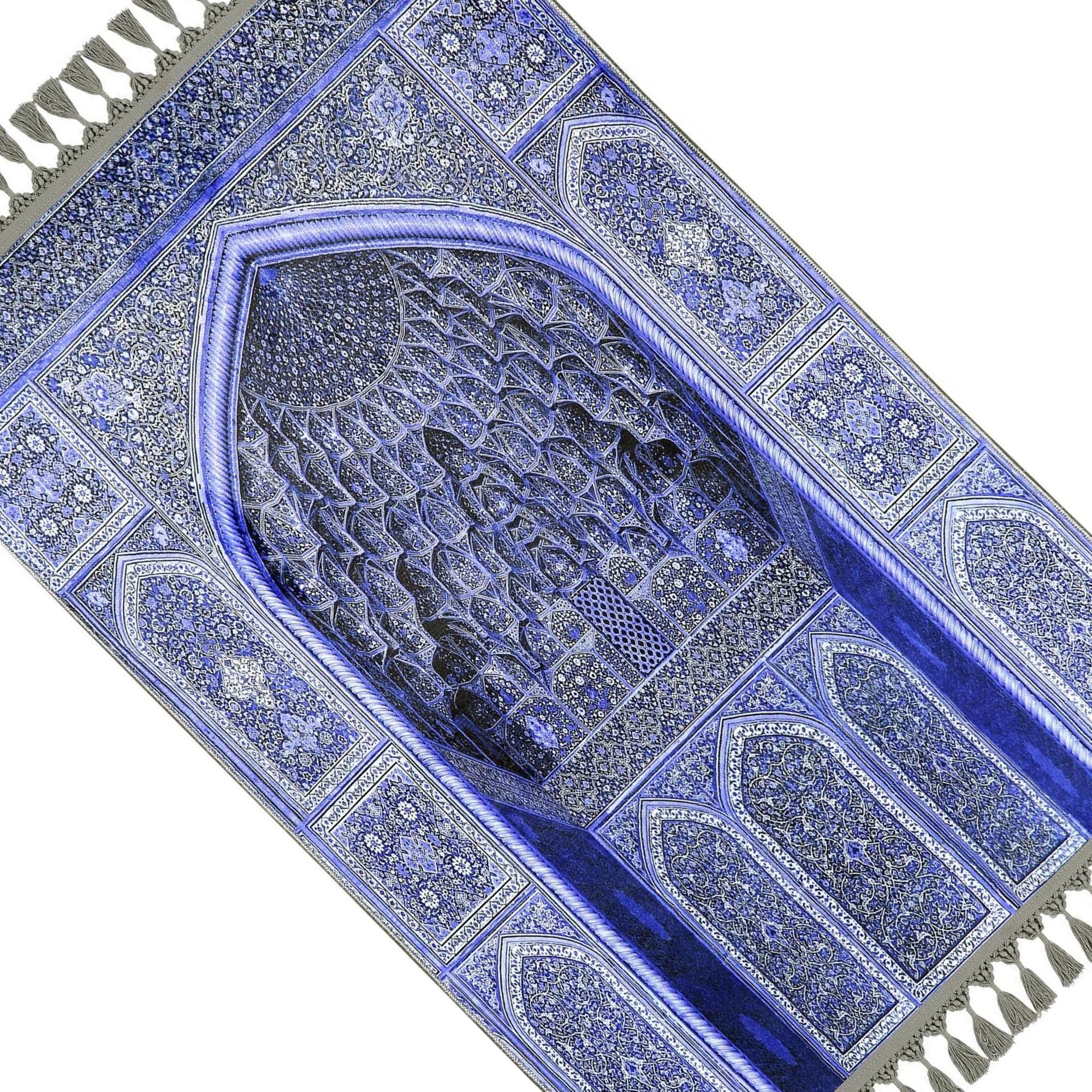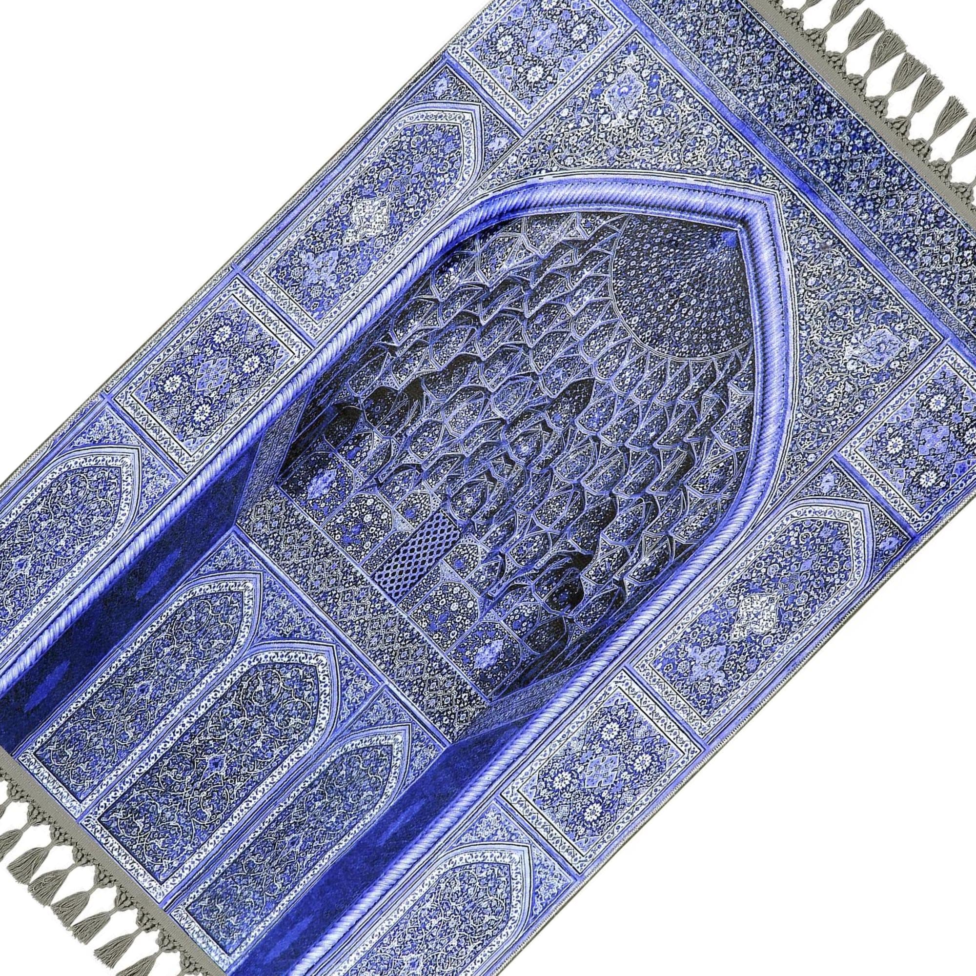 This Velvet Padded Islamic Prayer Mat features a magnificent Blue Mosque Mihrab and Qibla design, created to bring serenity and beauty to your prayer space. The rich shades of blue combine Ottoman aesthetics with soft velvet comfort, adding depth and elegance to any environment.