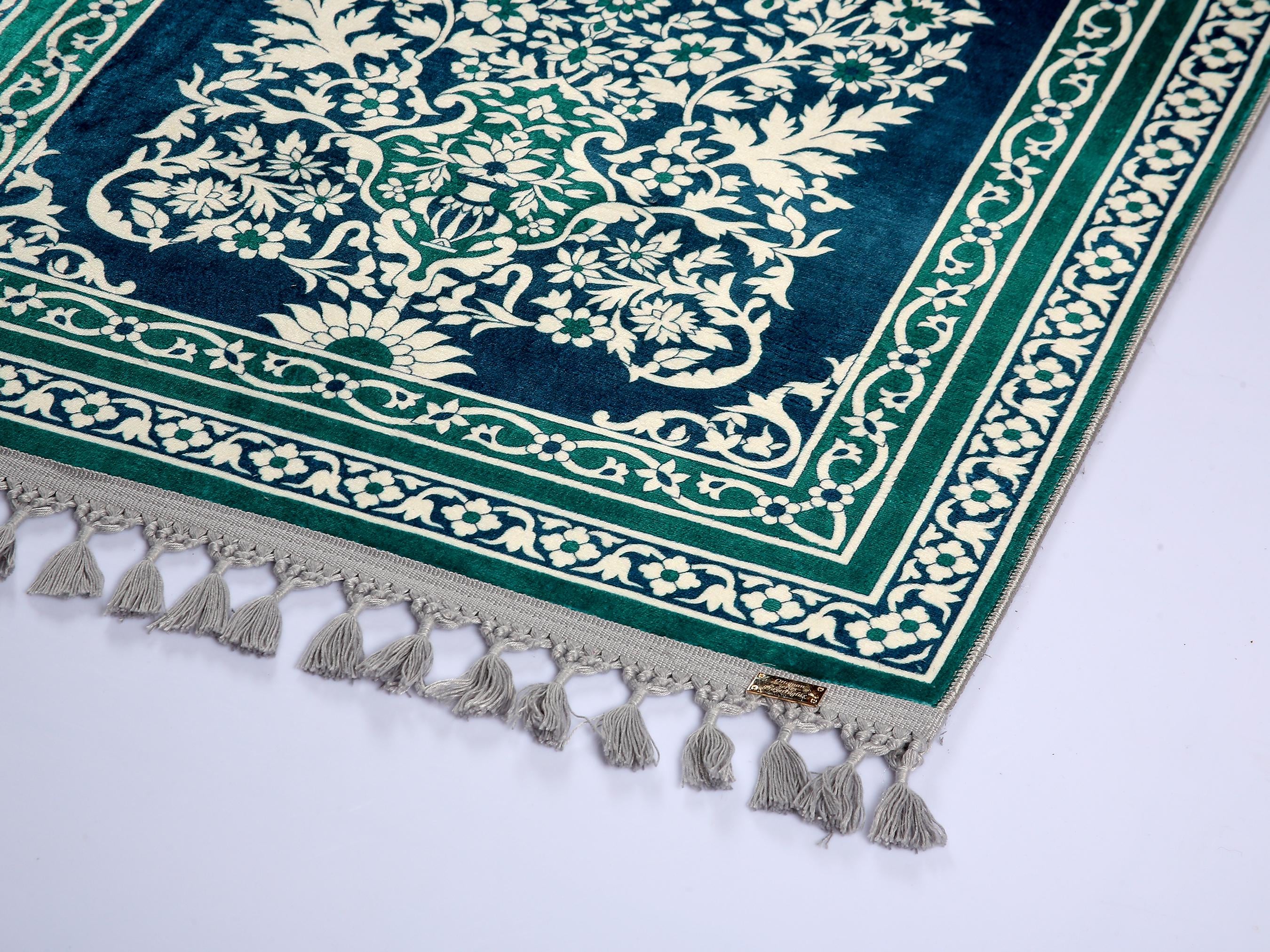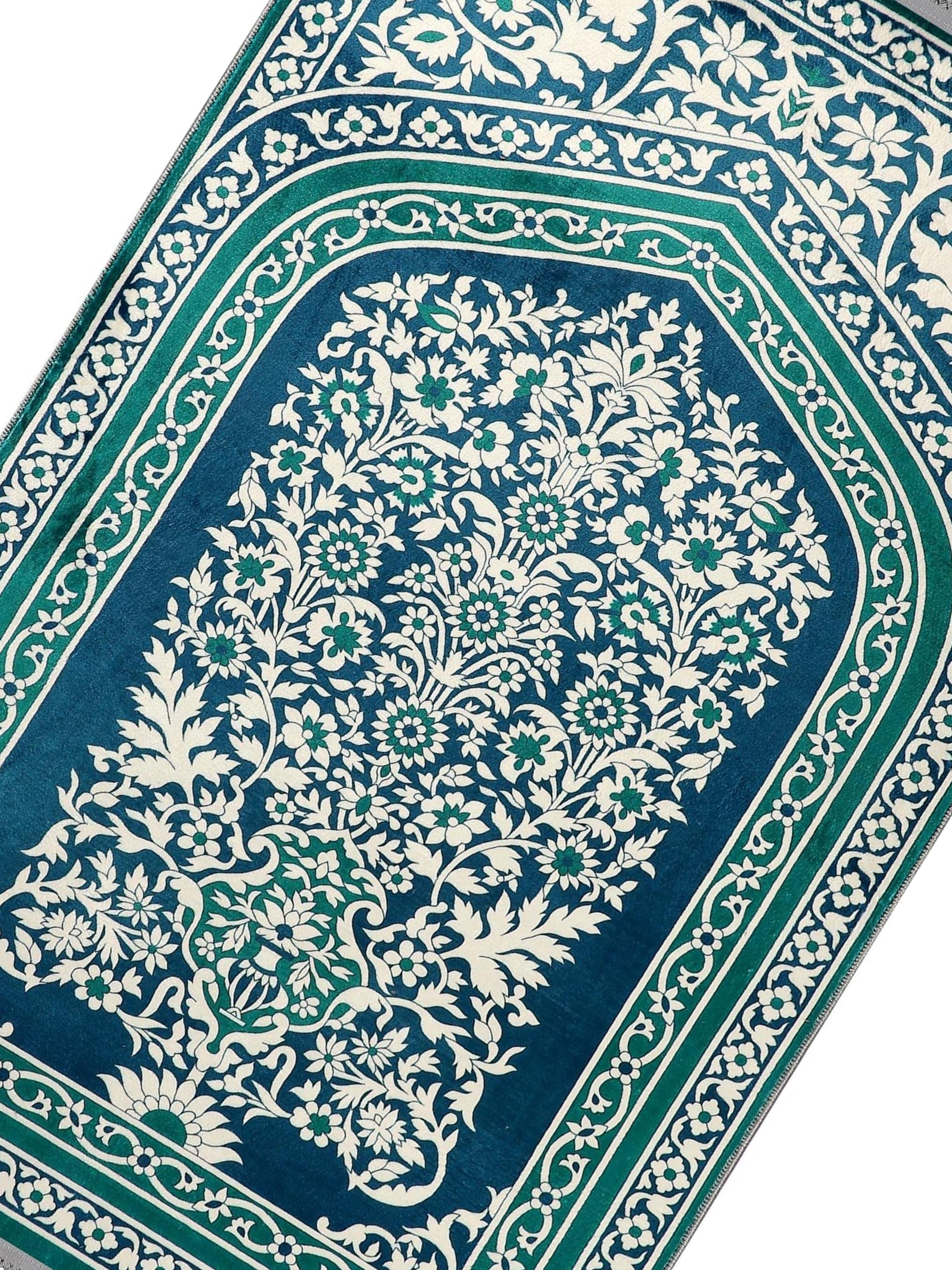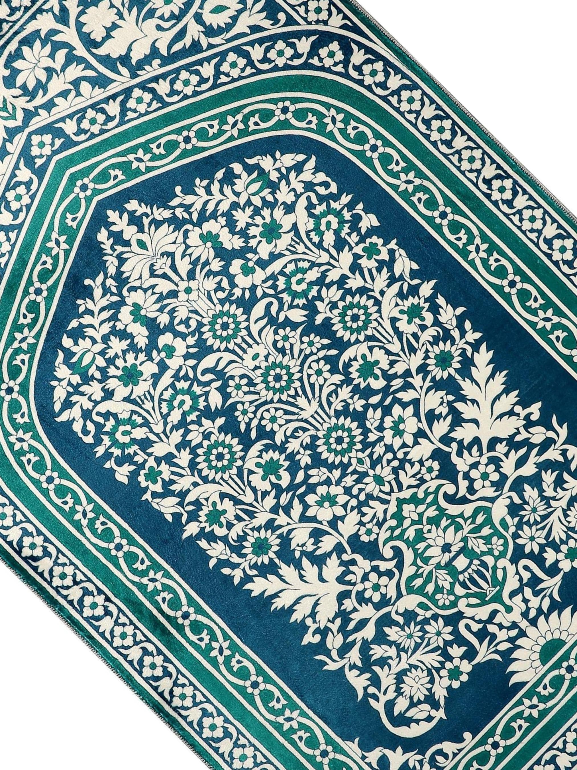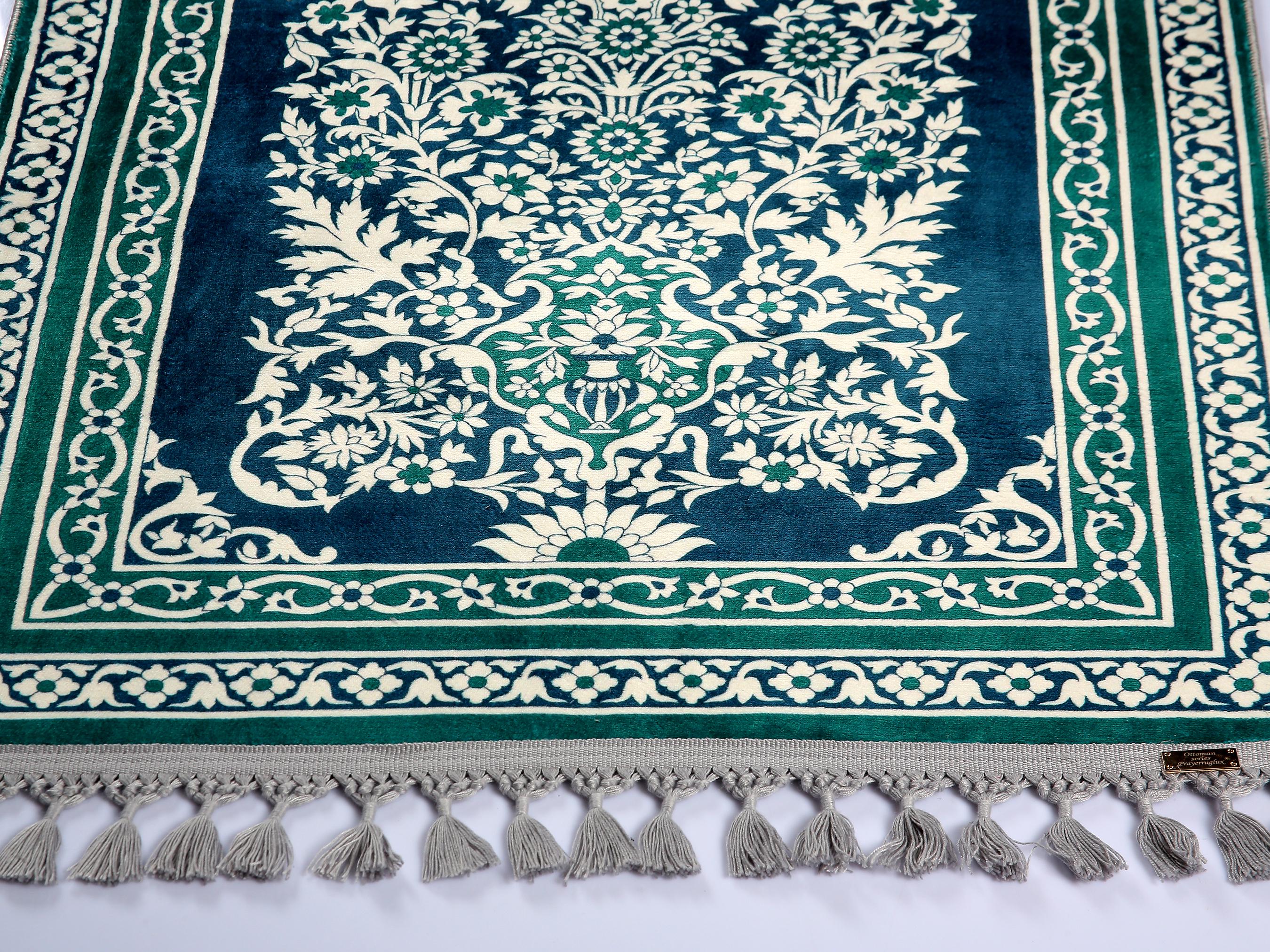 🤲 Luxury Prayer Rug – Green Blue Floral Turkish Carpet for Elegant Muslim Homes