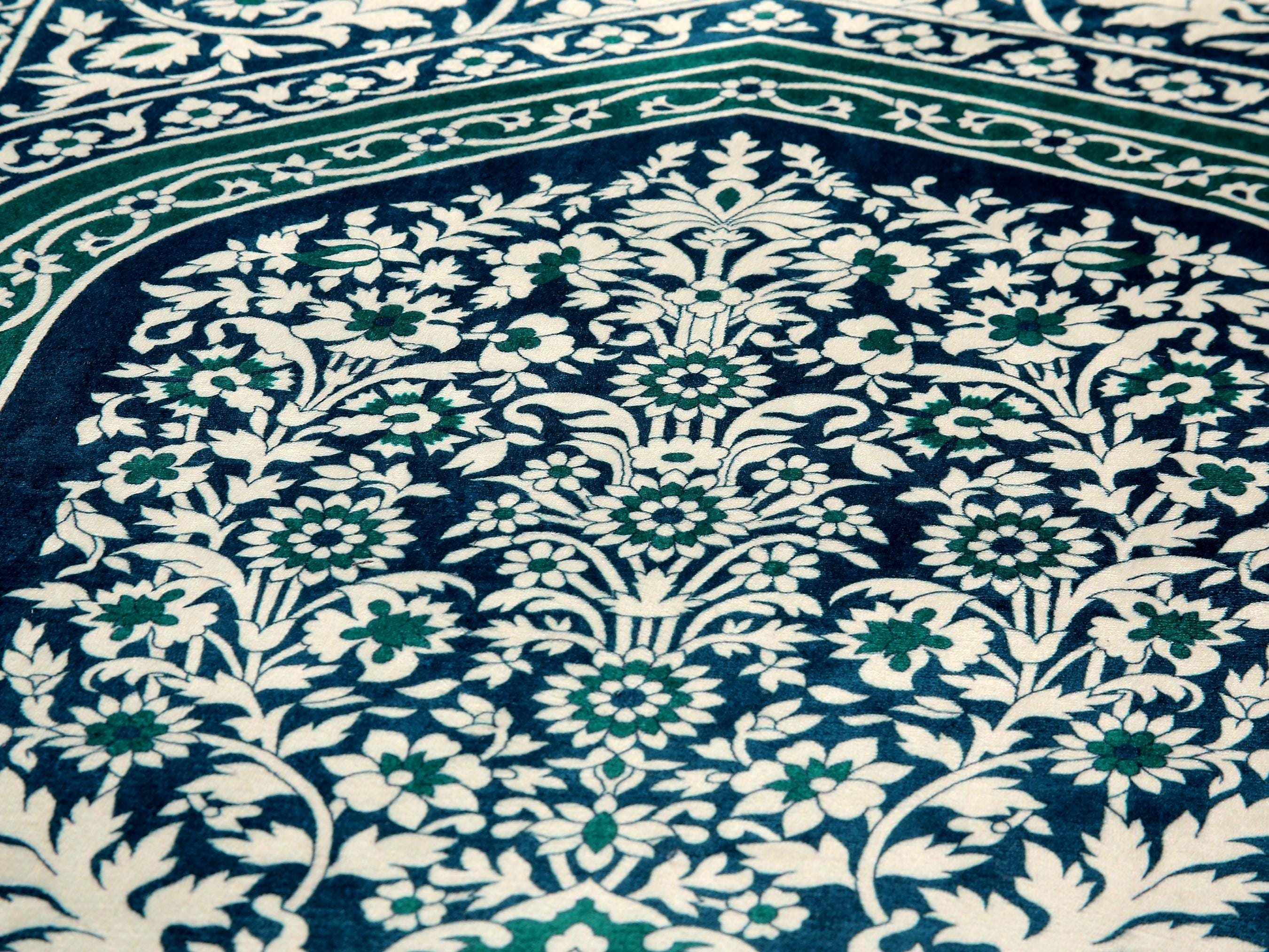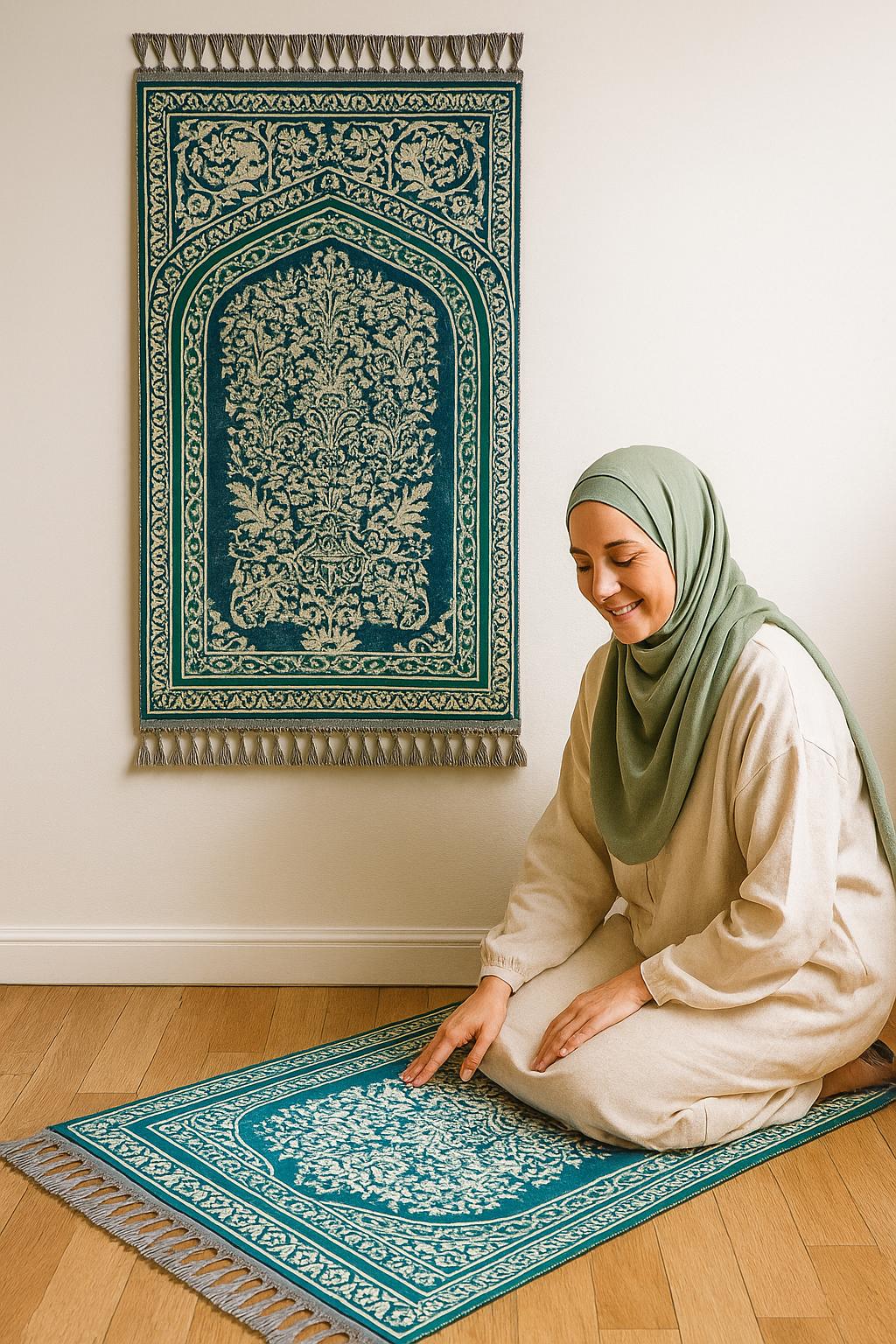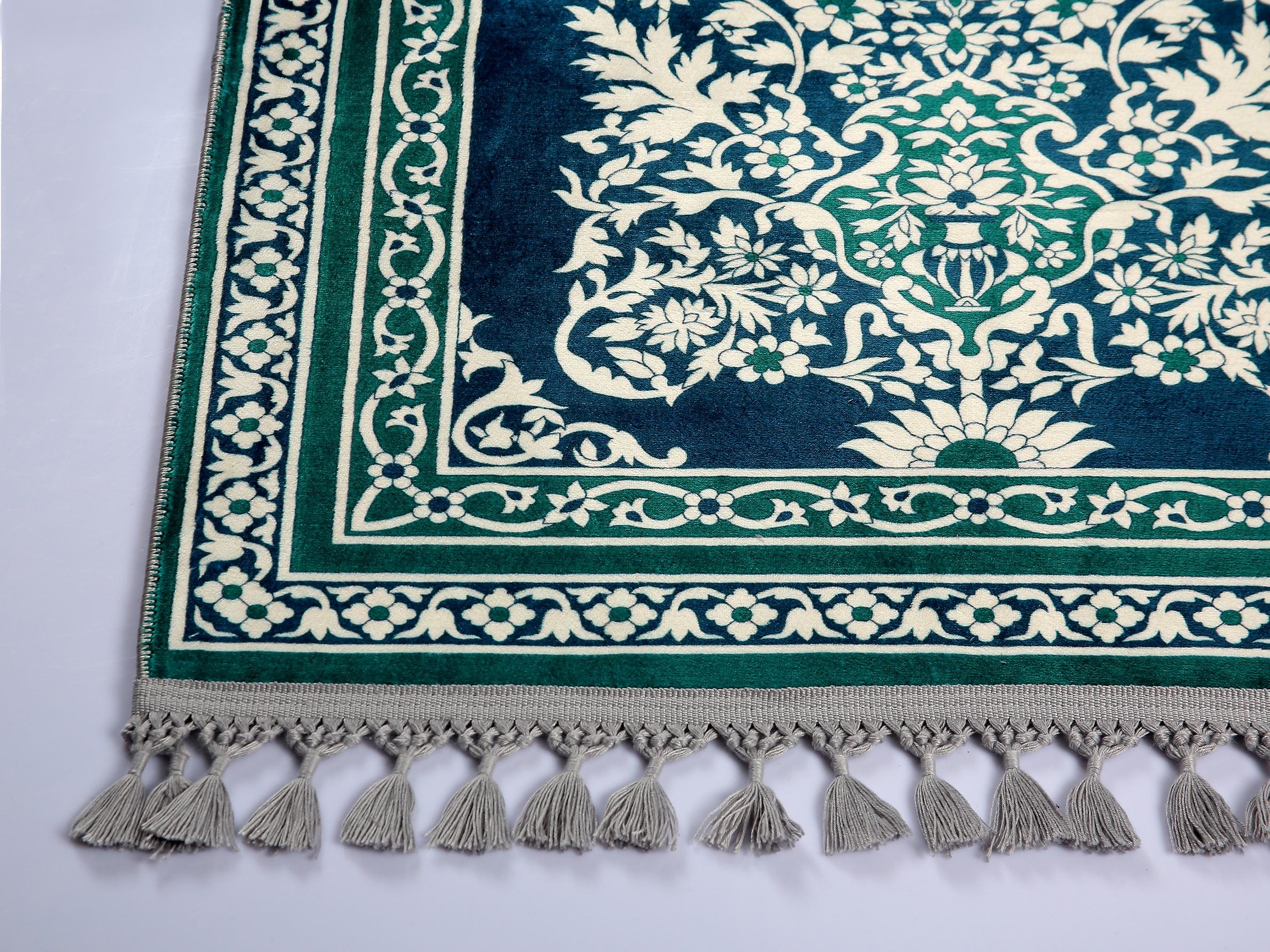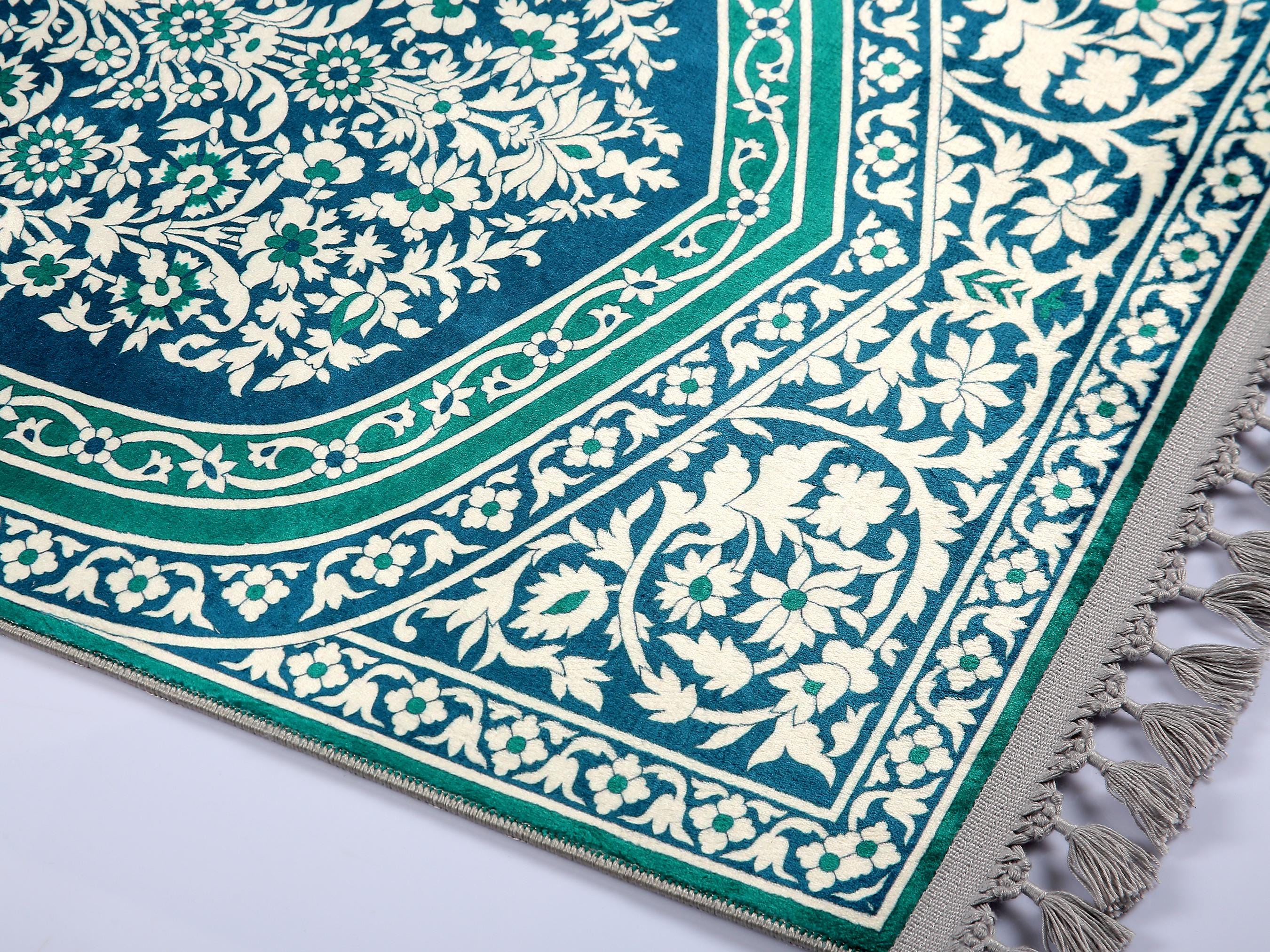 🤲 Luxury Prayer Rug – Green Blue Floral Turkish Carpet for Elegant Muslim Homes