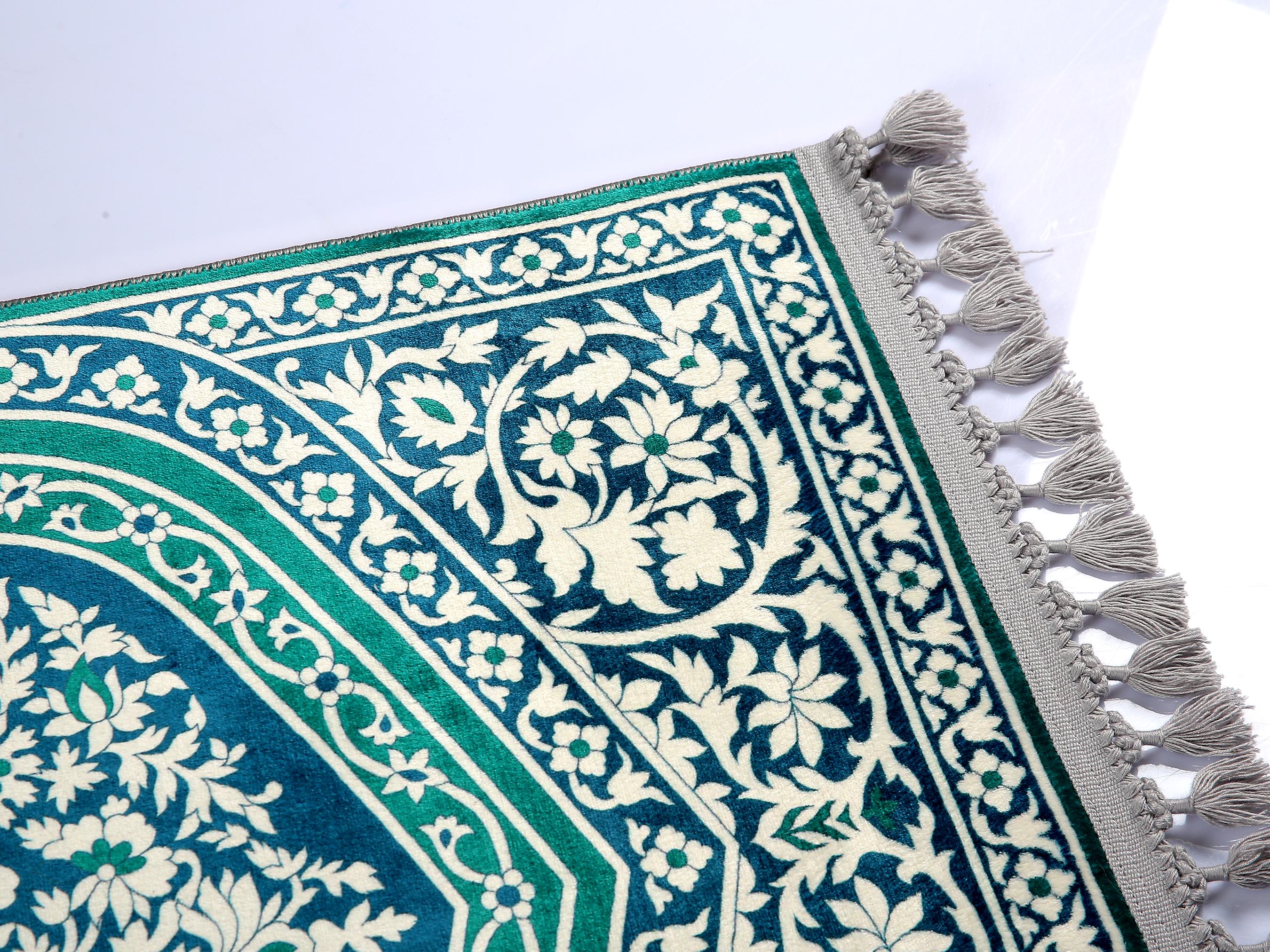 Experience timeless elegance with this green and blue Islamic prayer rug featuring delicate floral motifs inspired by Ottoman design. The calming tones and intricate patterns transform your prayer space into a sanctuary of peace. Its silky soft surface provides maximum comfort and support – perfect for daily prayers without knee discomfort.