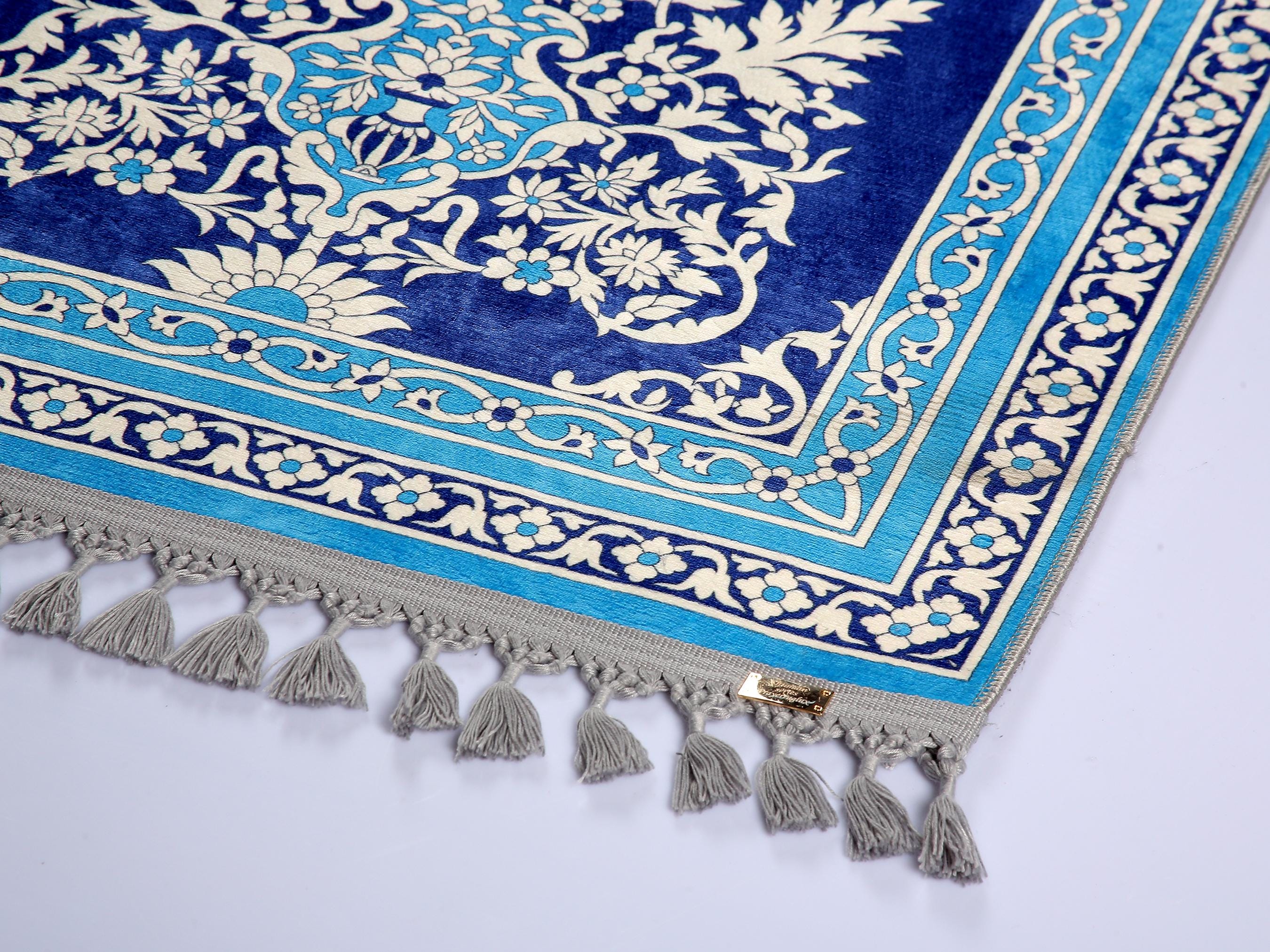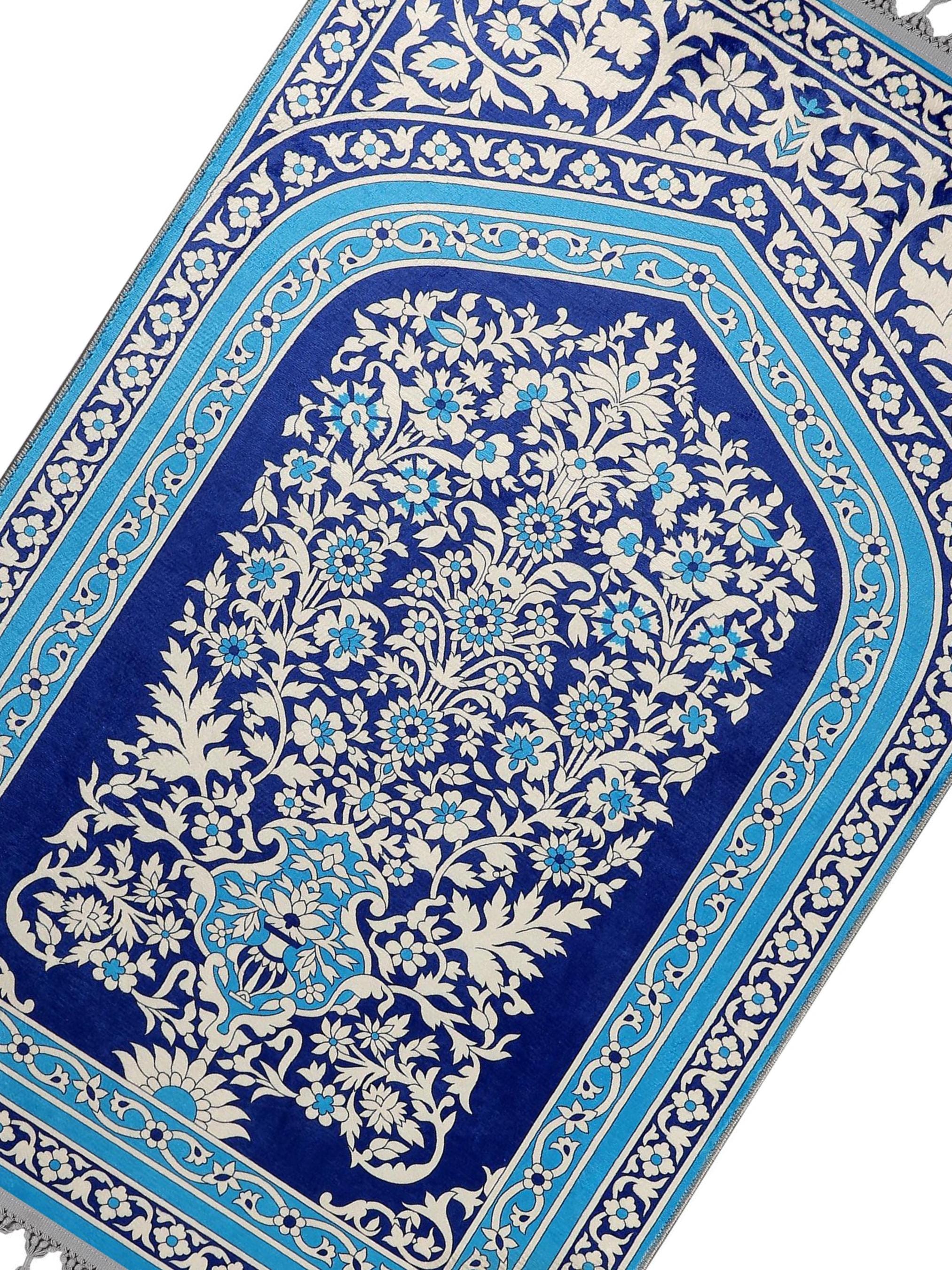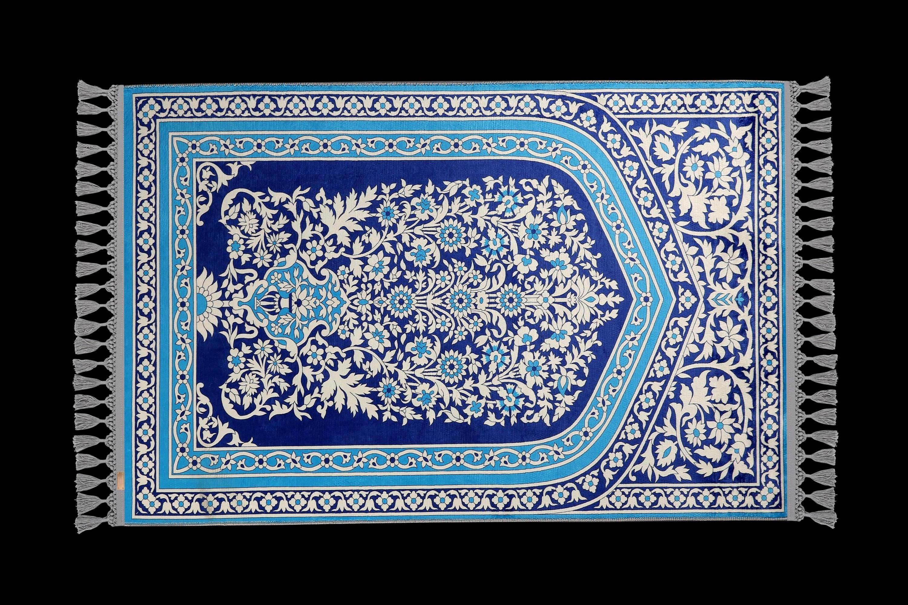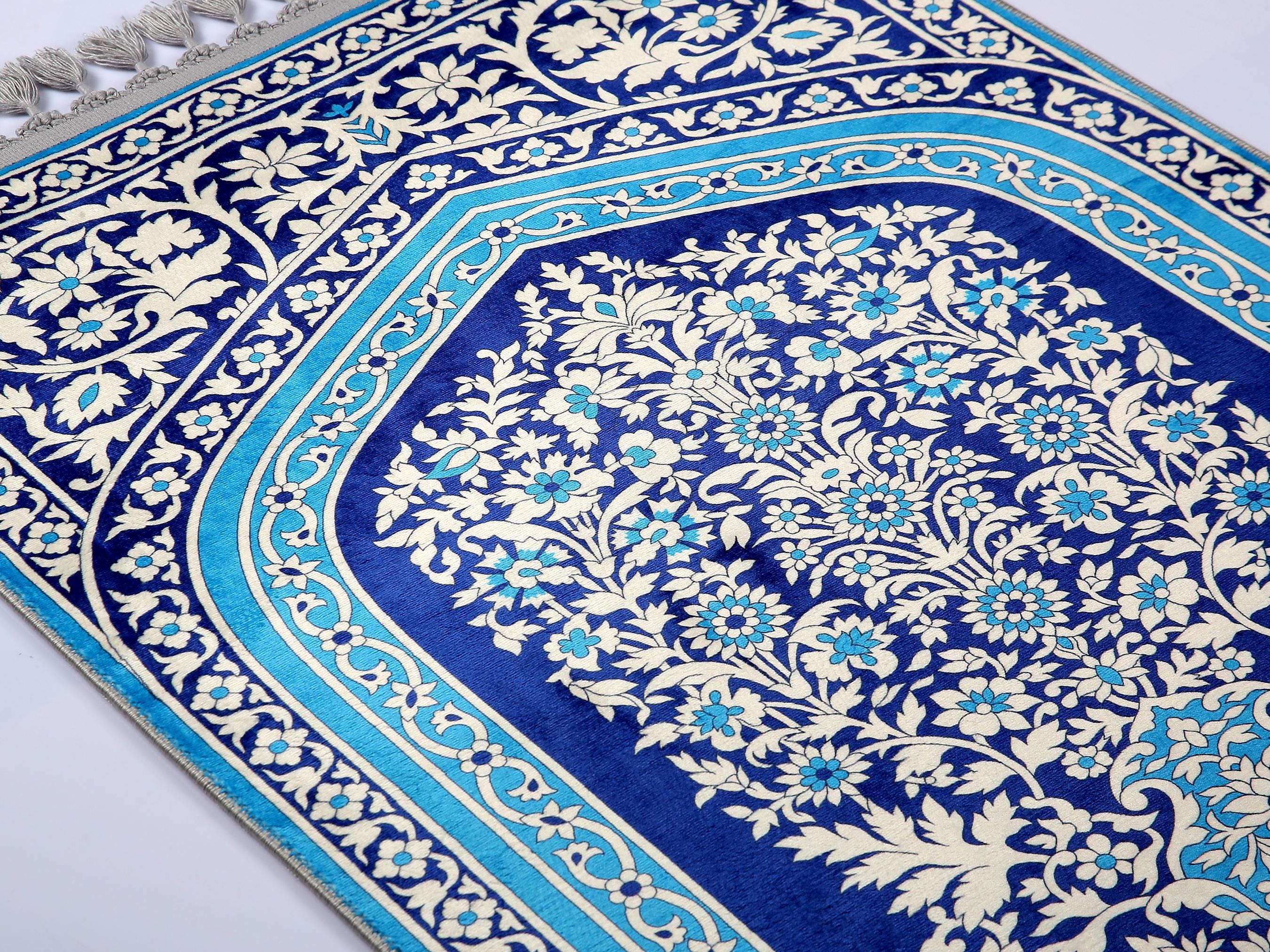 This luxurious blue Islamic prayer rug features an elegant mihrab design with intricate floral patterns, inspired by Ottoman art. The rich blue tones bring a serene atmosphere to your prayer room or living space, while the soft and silky texture provides comfort and support – perfect for daily prayers without knee discomfort.