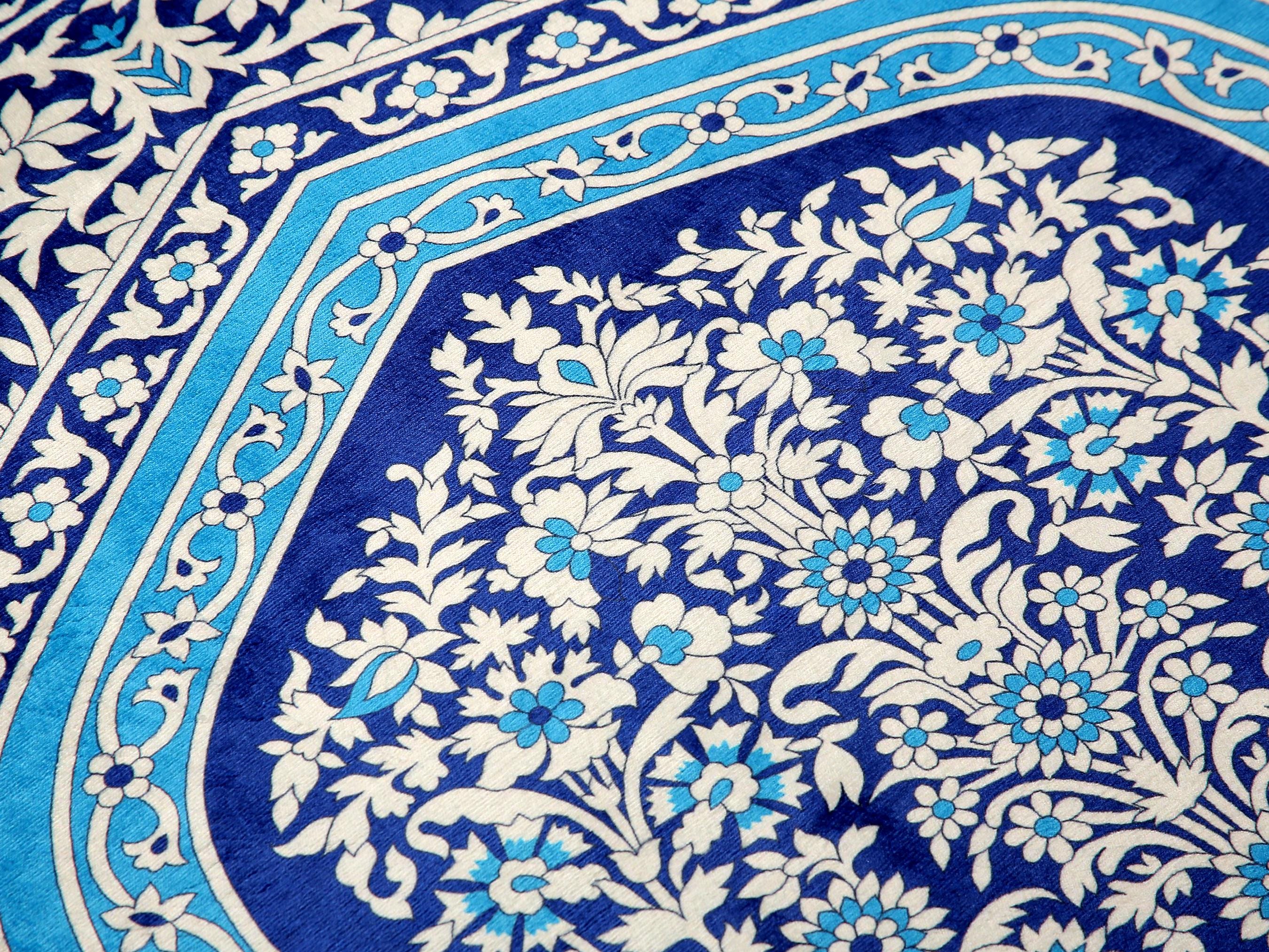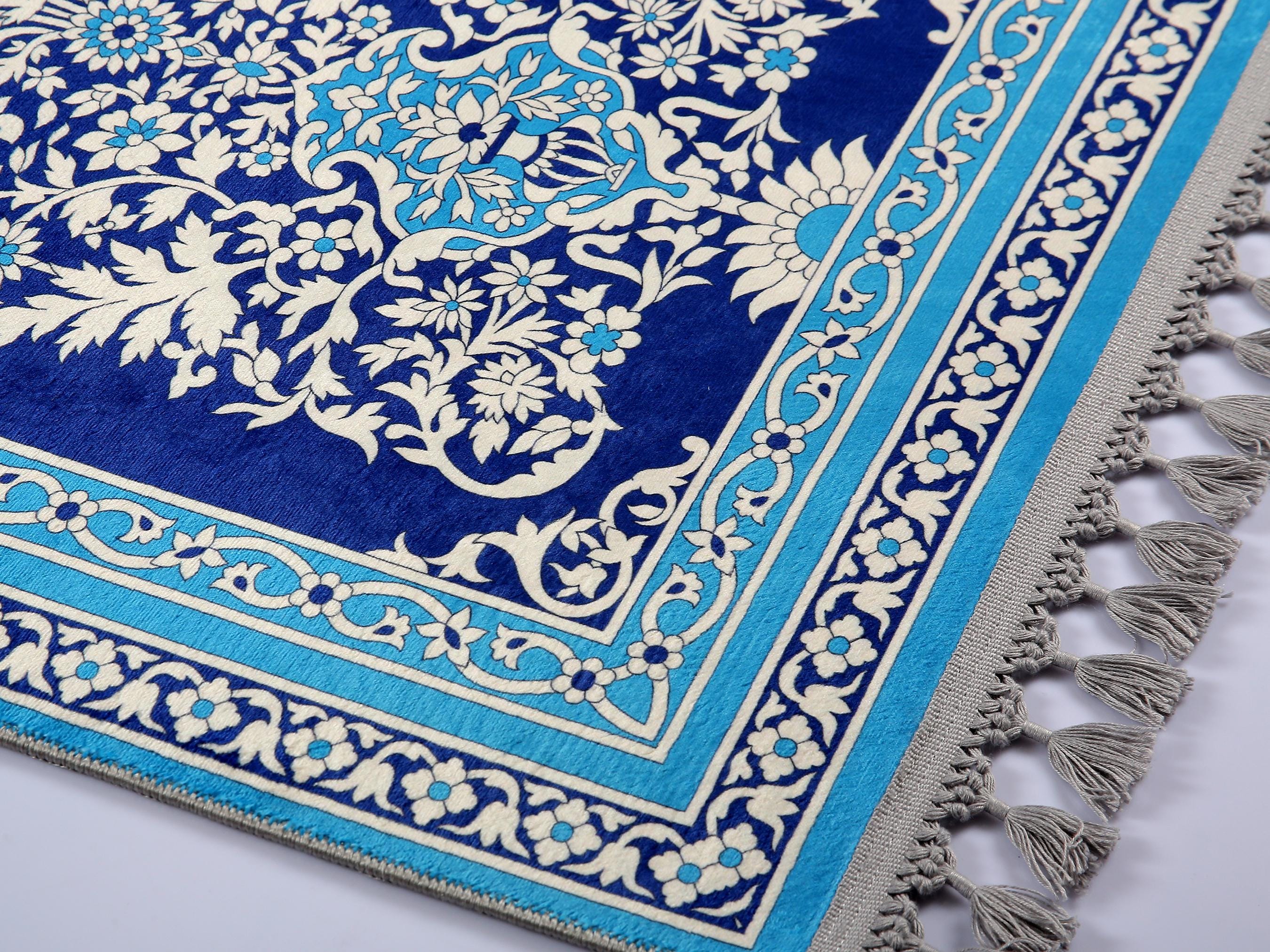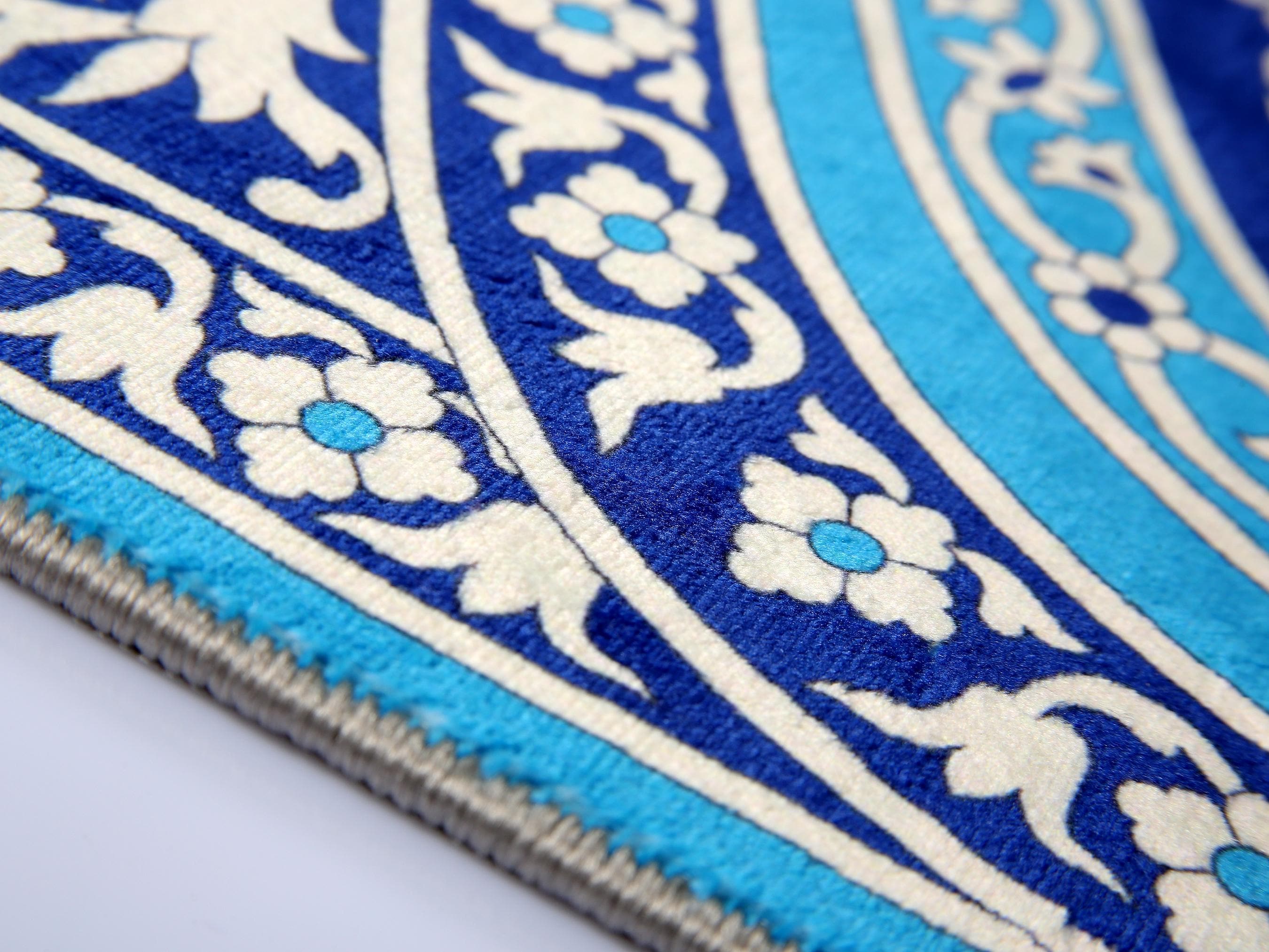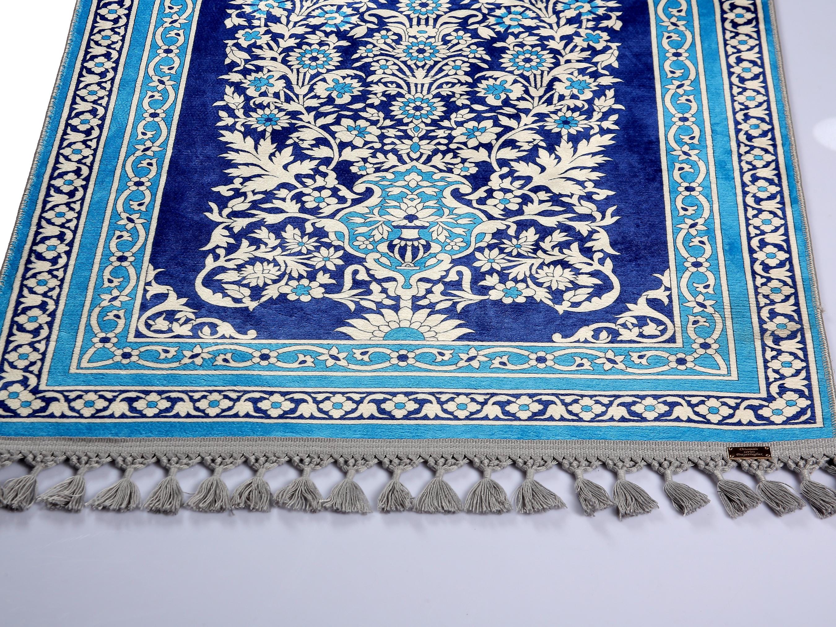 This luxurious blue Islamic prayer rug features an elegant mihrab design with intricate floral patterns, inspired by Ottoman art. The rich blue tones bring a serene atmosphere to your prayer room or living space, while the soft and silky texture provides comfort and support – perfect for daily prayers without knee discomfort.