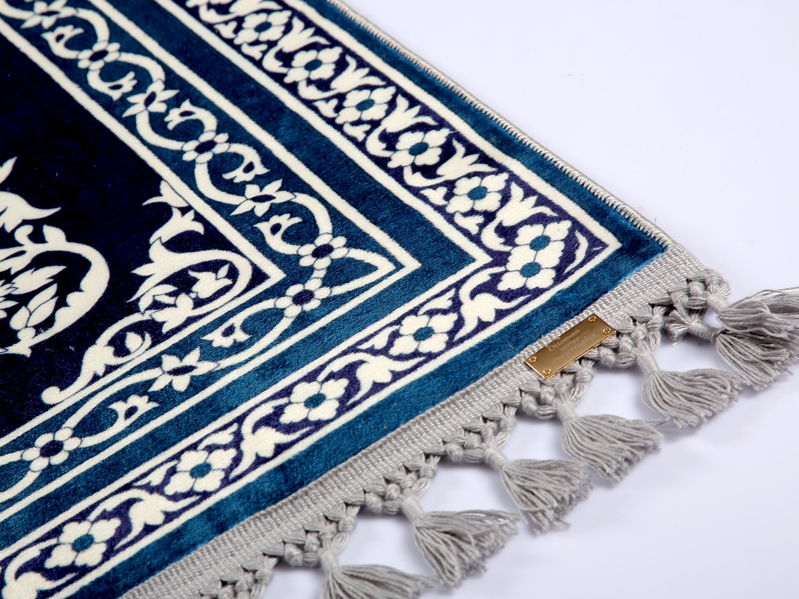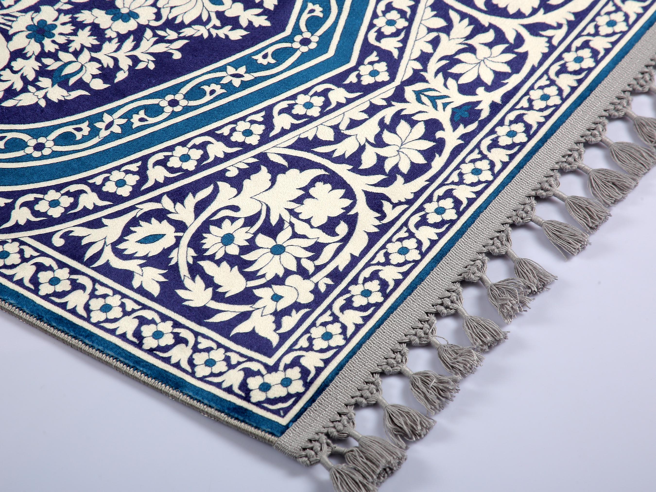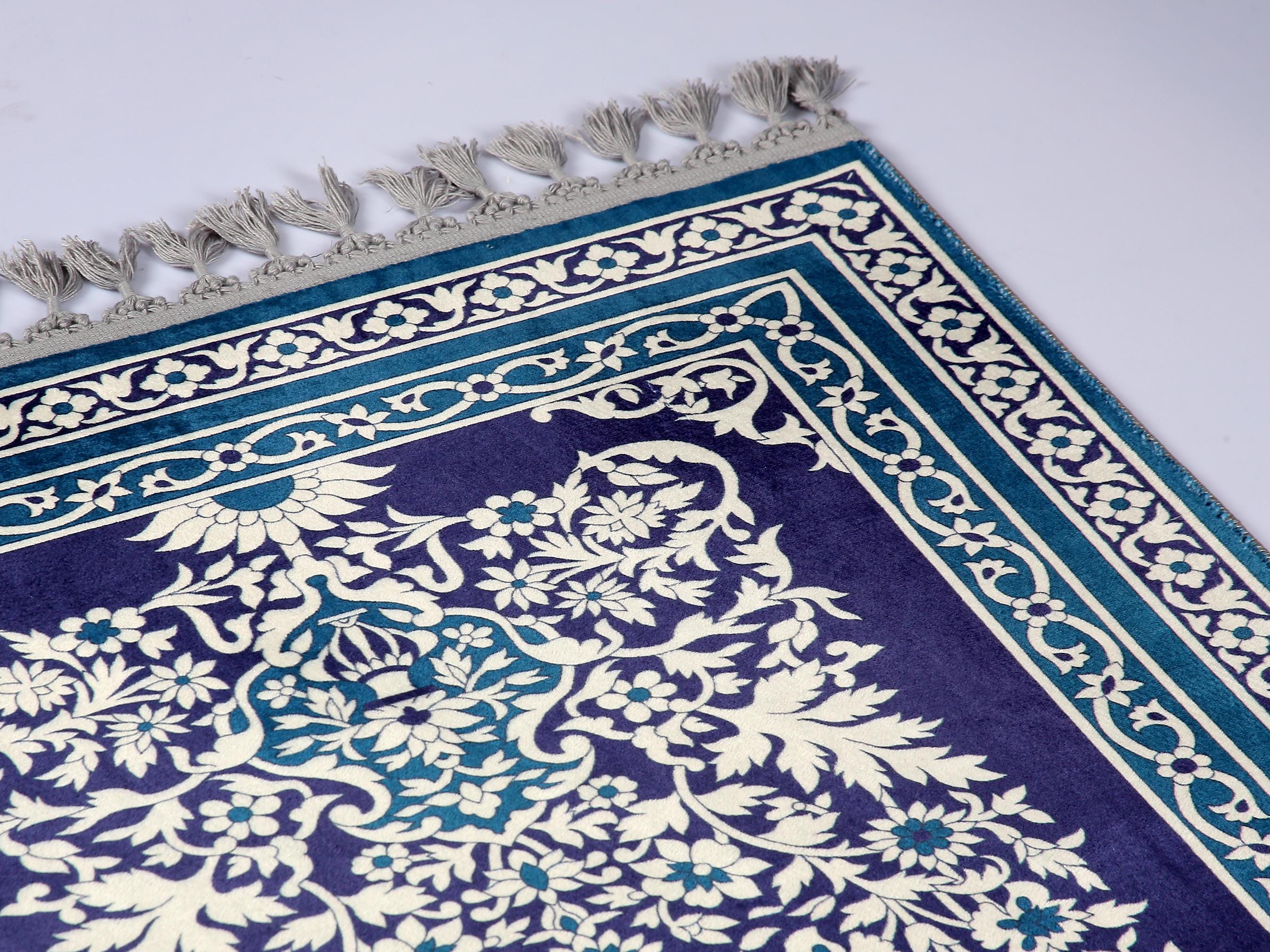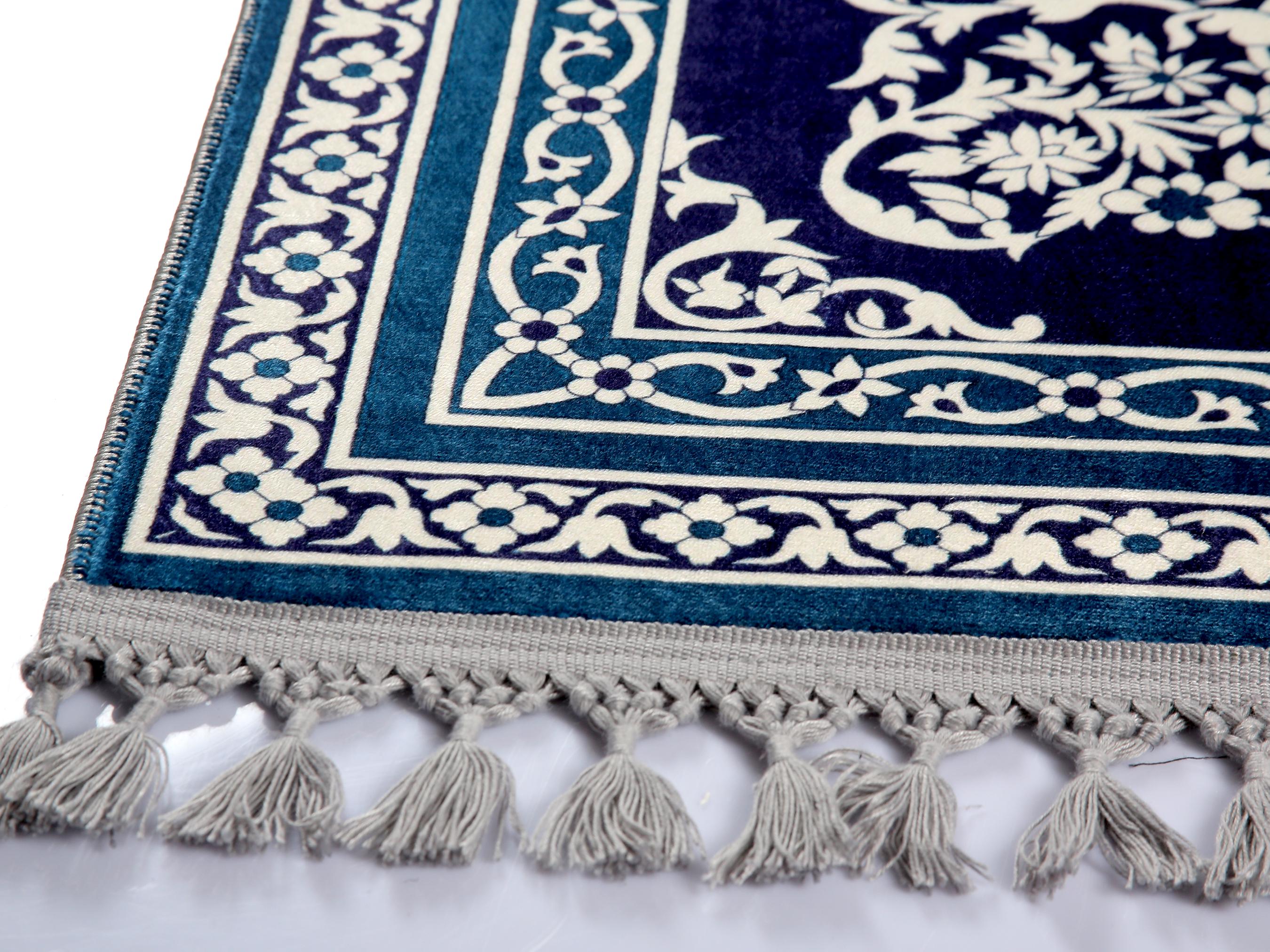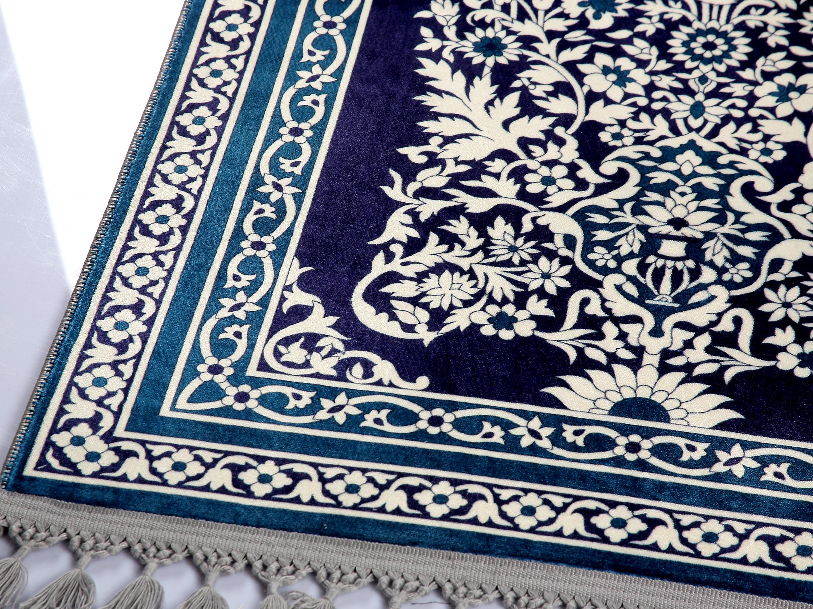 🤲 Luxury Prayer Rug – Elegant Turkish Blue Floral Carpet for Muslim Home