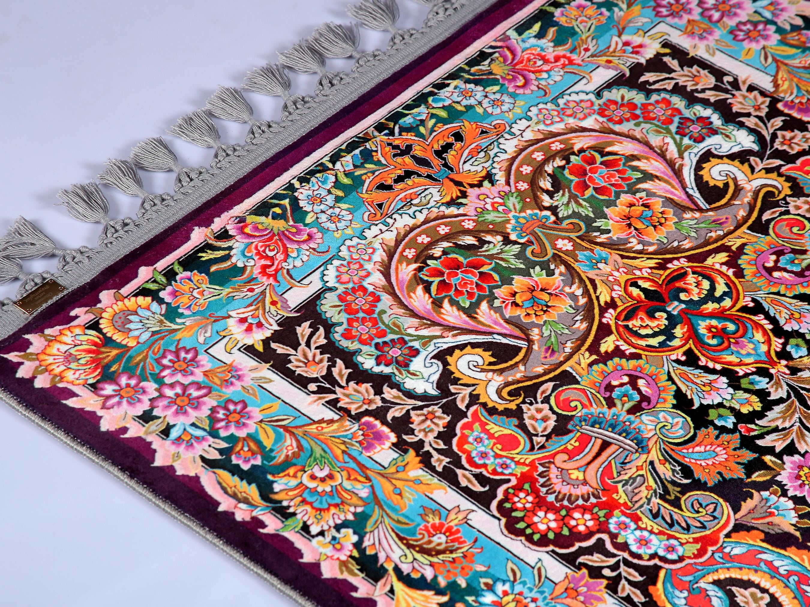 What a gorgeous, gorgeous prayer rug! It is so soft and beautiful, and certainly one of the finest things I own. The brand tag is metal, high quality and small. The colors are vibrant. It was packaged with a personal note and a very pretty tasbih. I cannot recommend them enough for prayer mats. Certainly worth the cost.