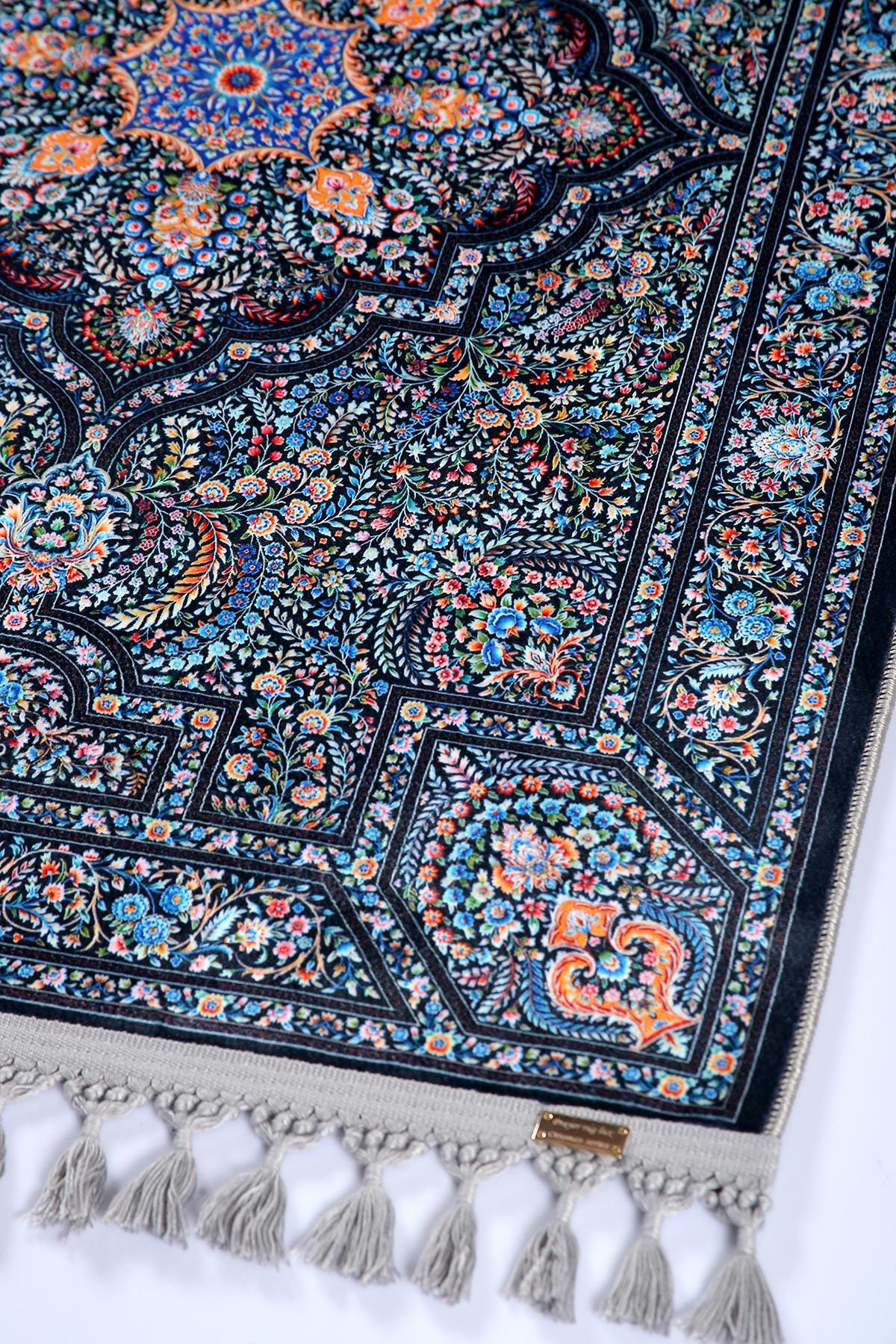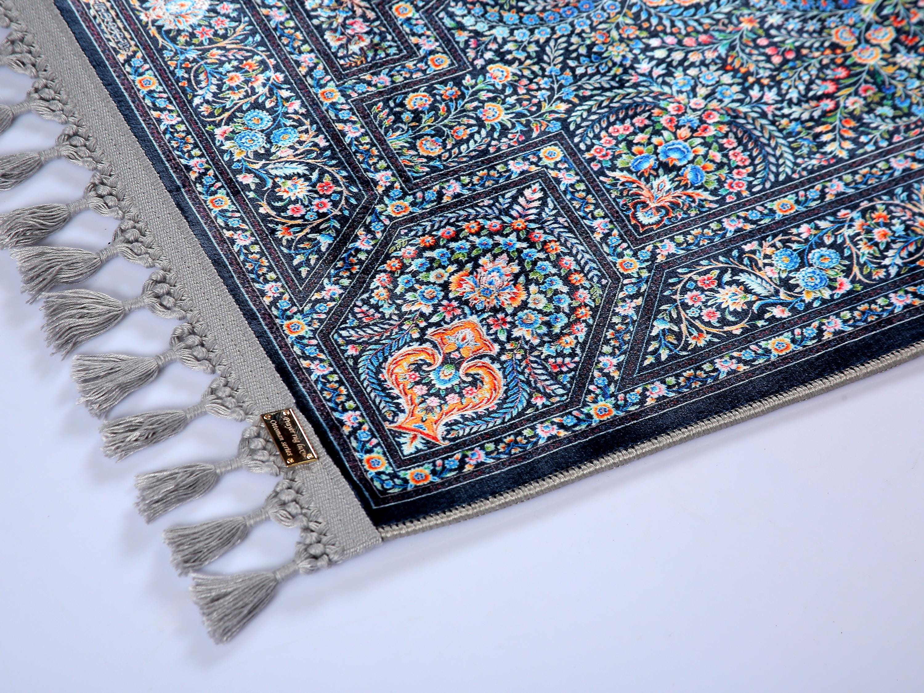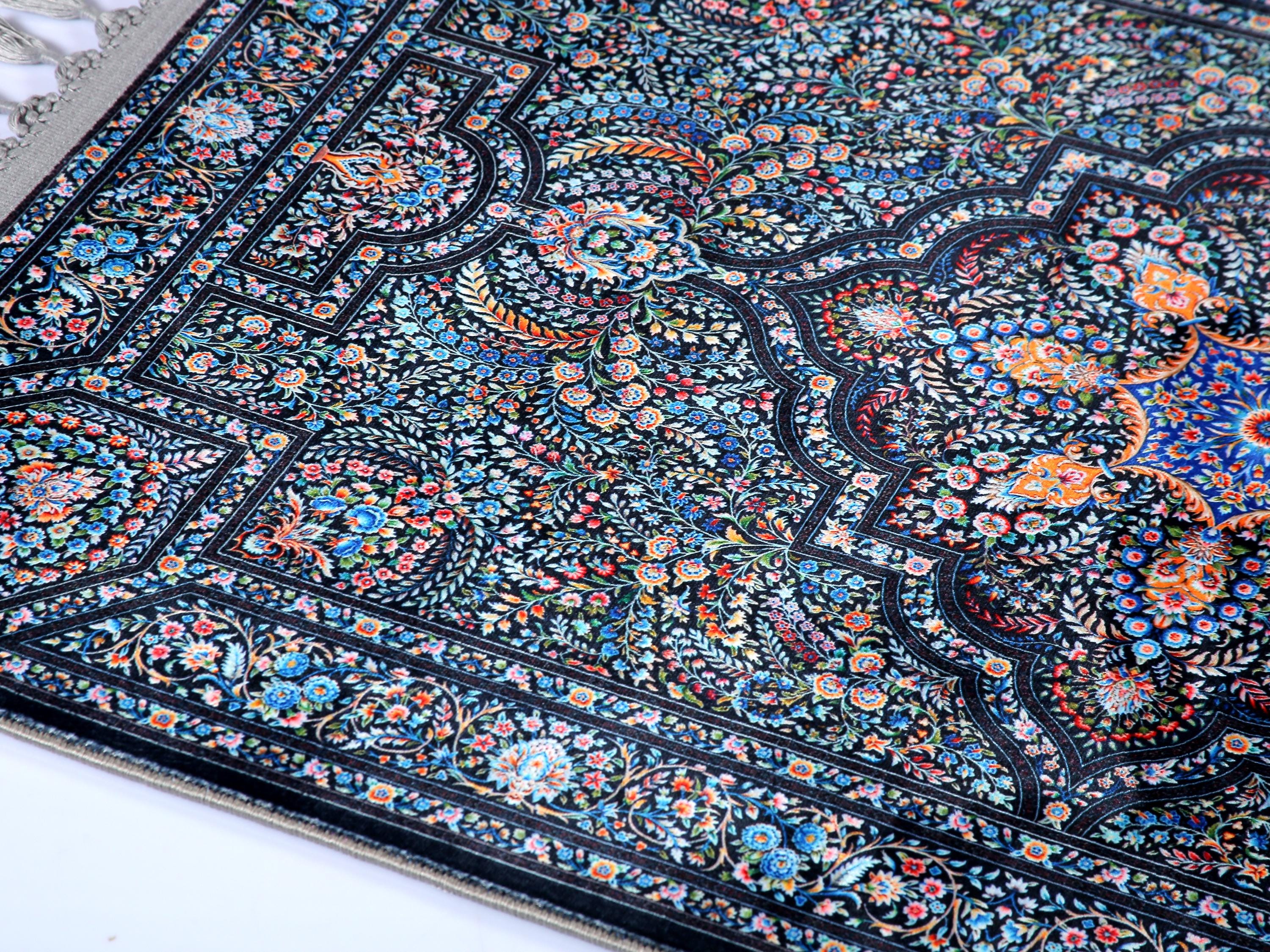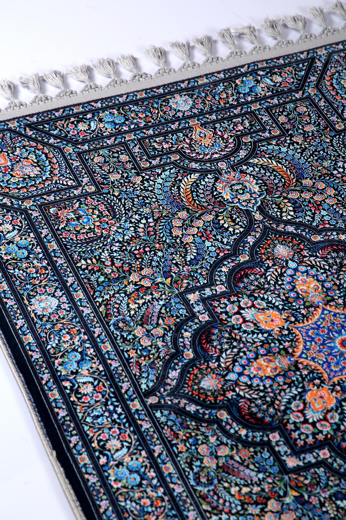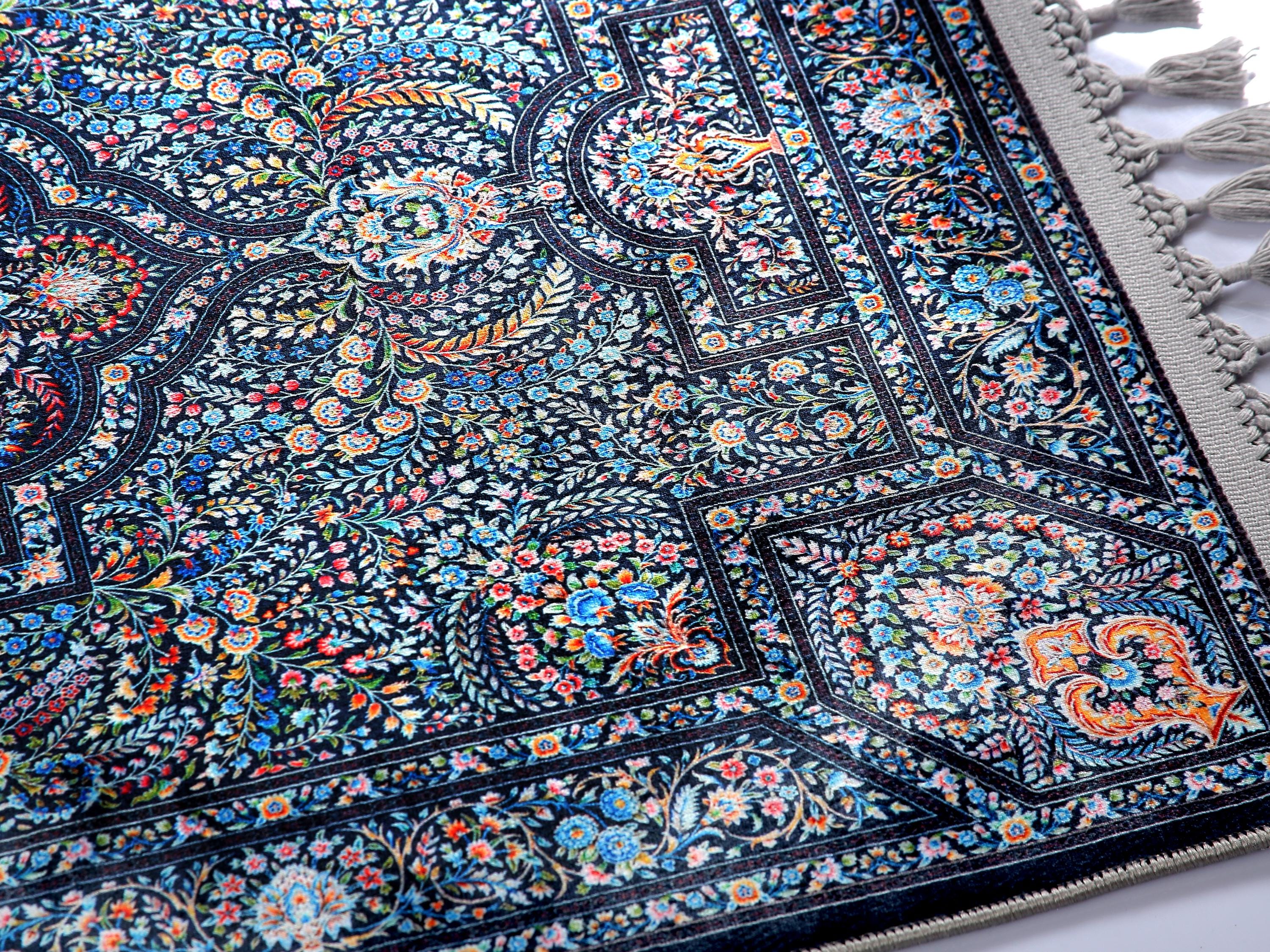 Luxury Prayer Rug – Dark Blue Floral Turkish Carpet for Living Room, Bedroom, Entryway, and Prayer Room