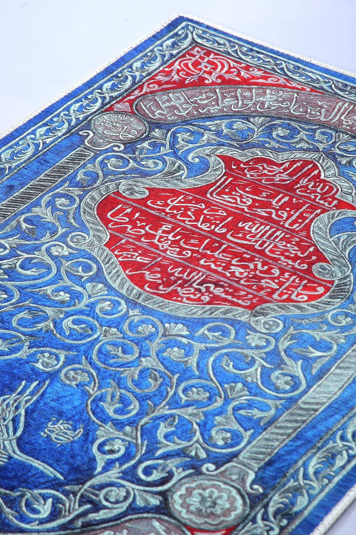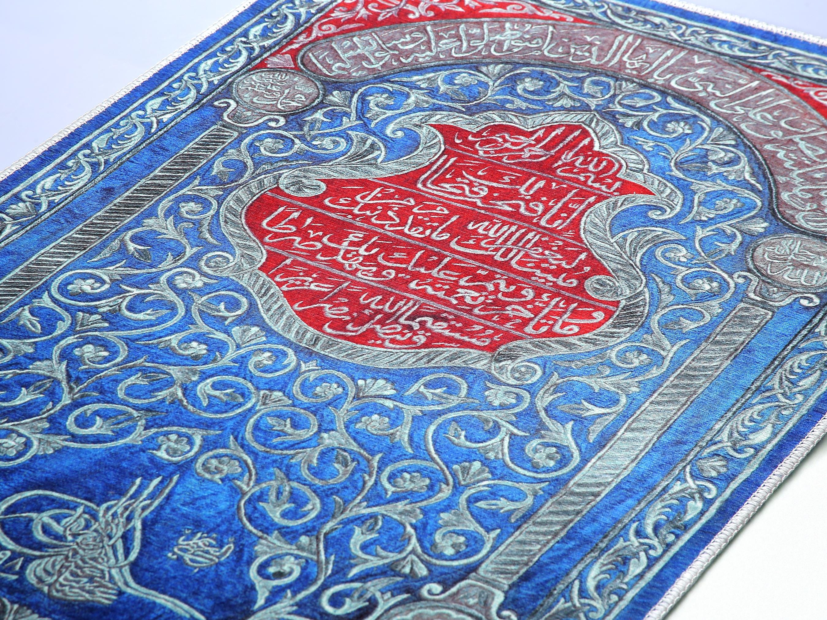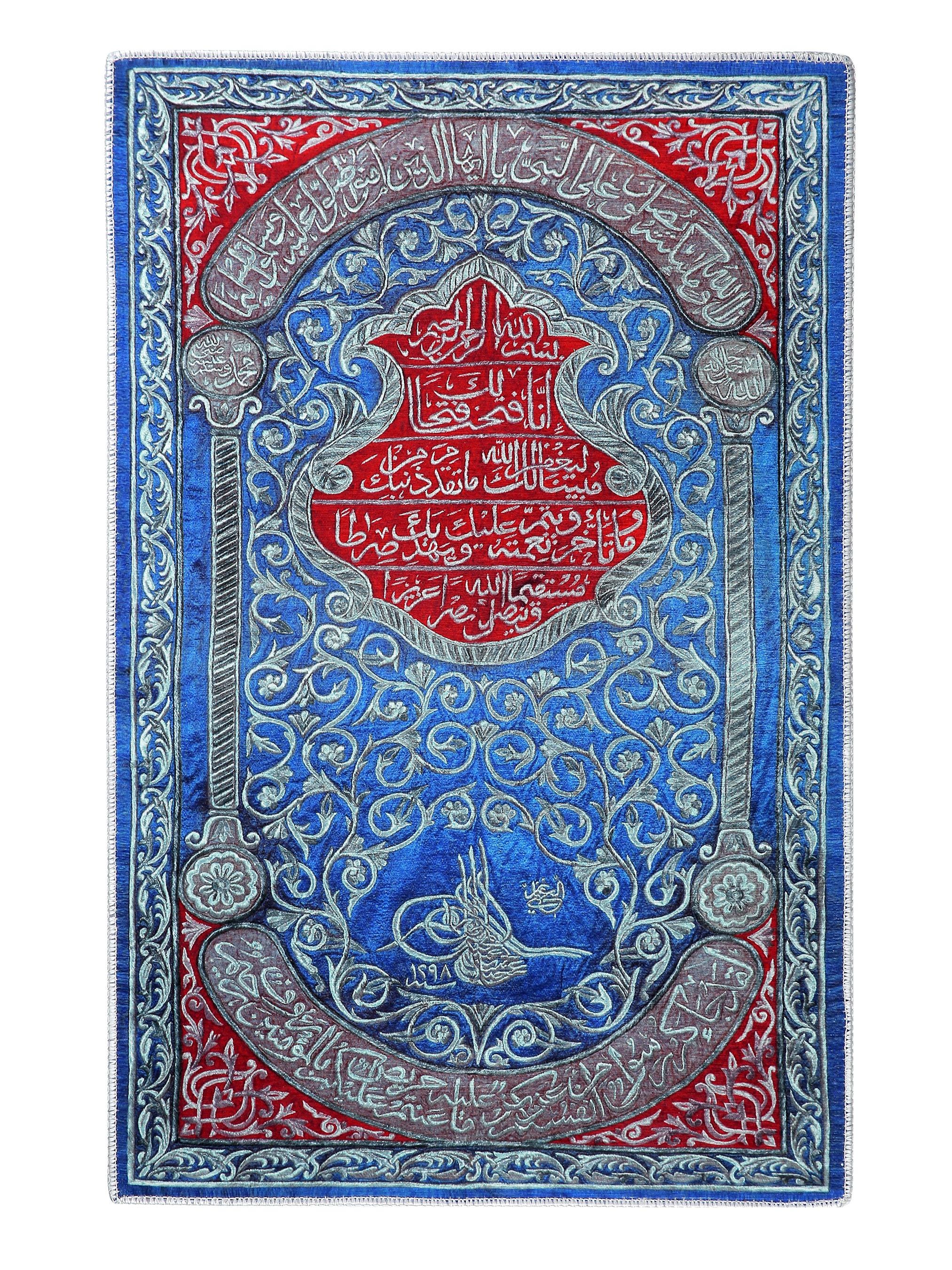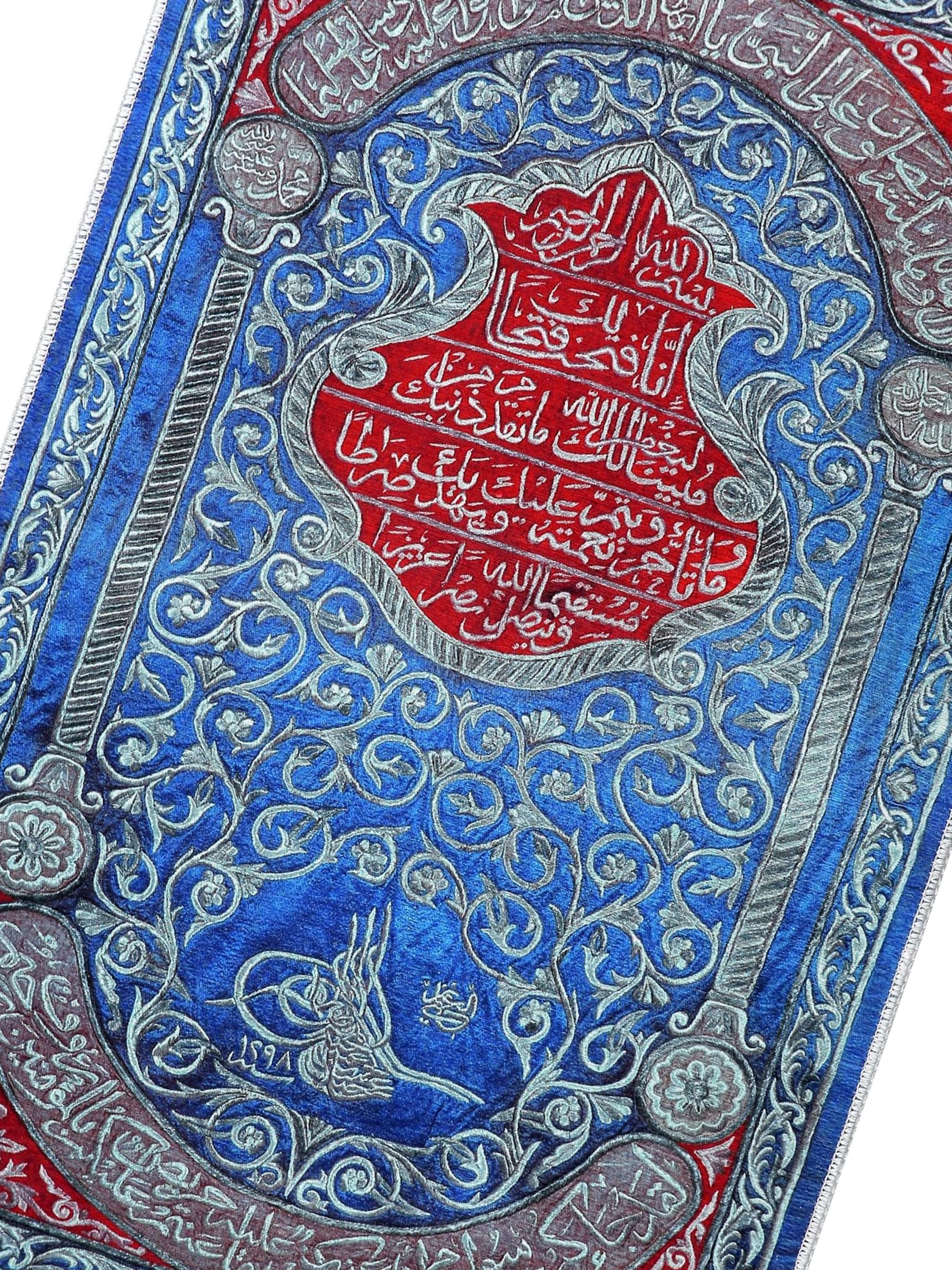 This exquisite Islamic wall hanging features rich Arabic calligraphy in bold red over a deep blue floral background. At the center, verses from the Qur’an are beautifully inscribed, surrounded by intricate floral patterns and an Ottoman tughra at the base. The border features silver-toned vines and script panels, creating a refined and spiritual visual experience.