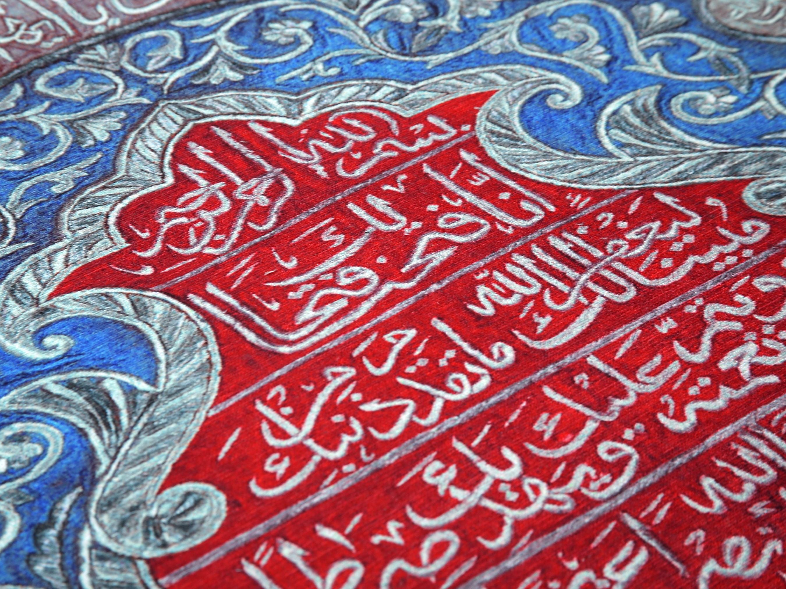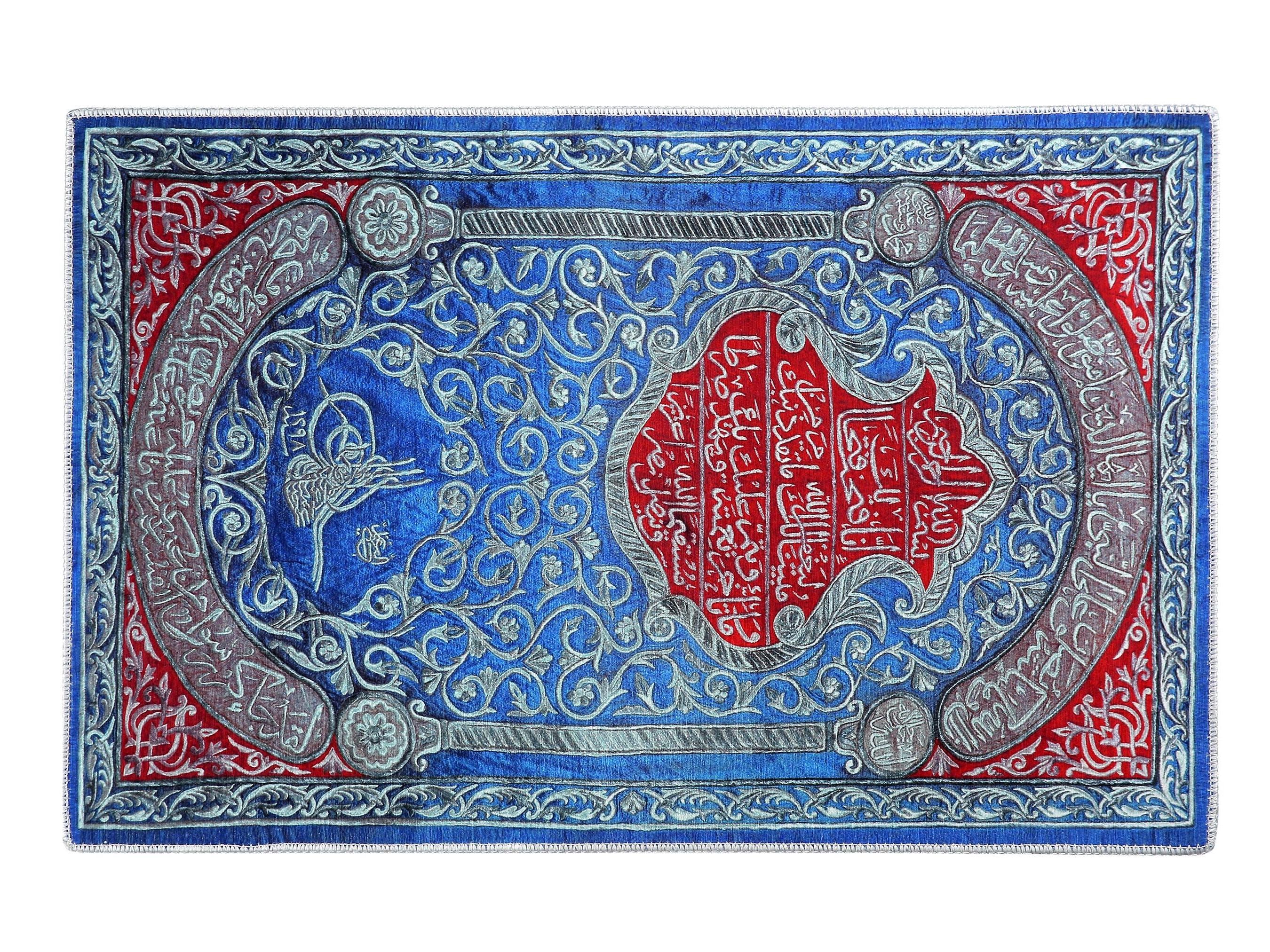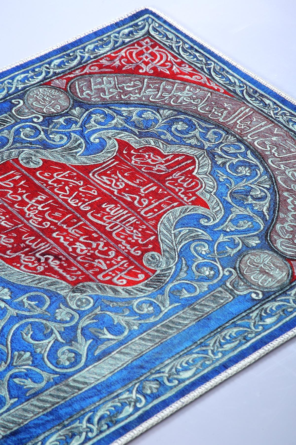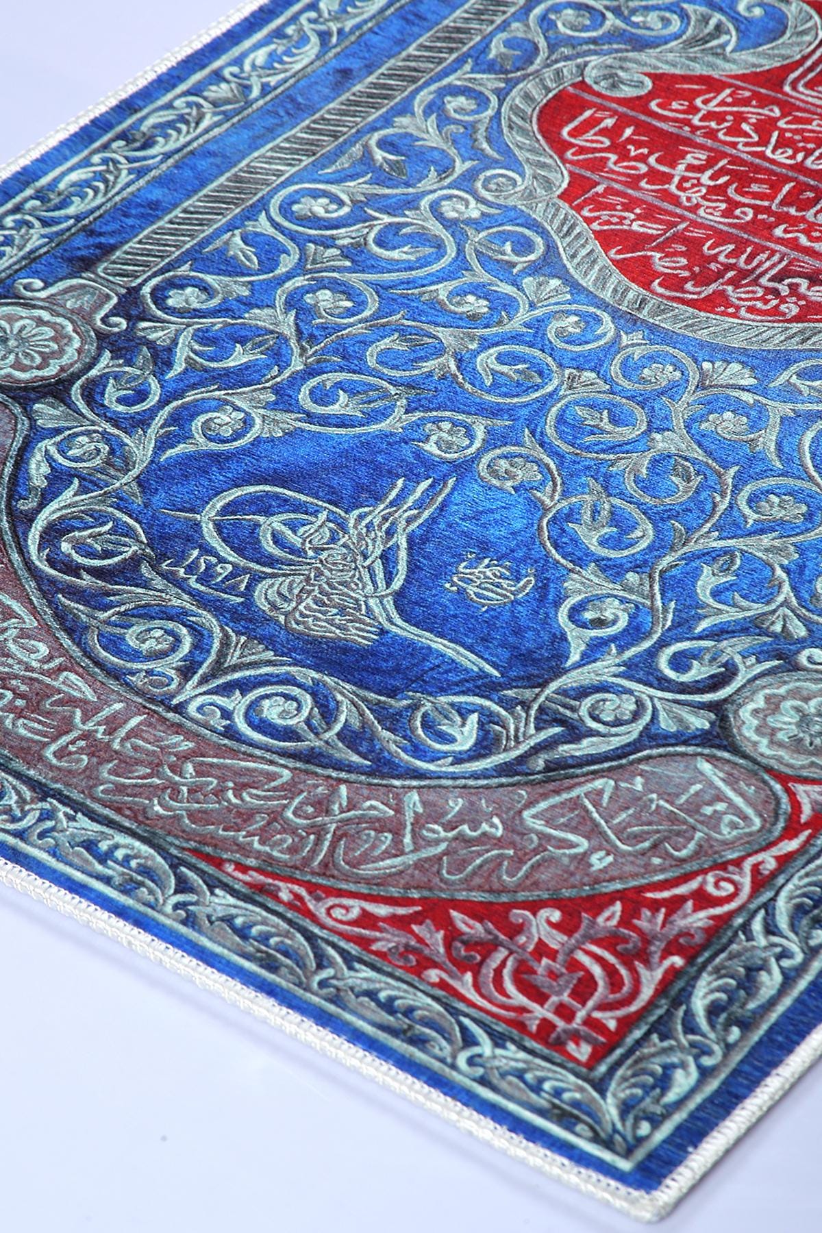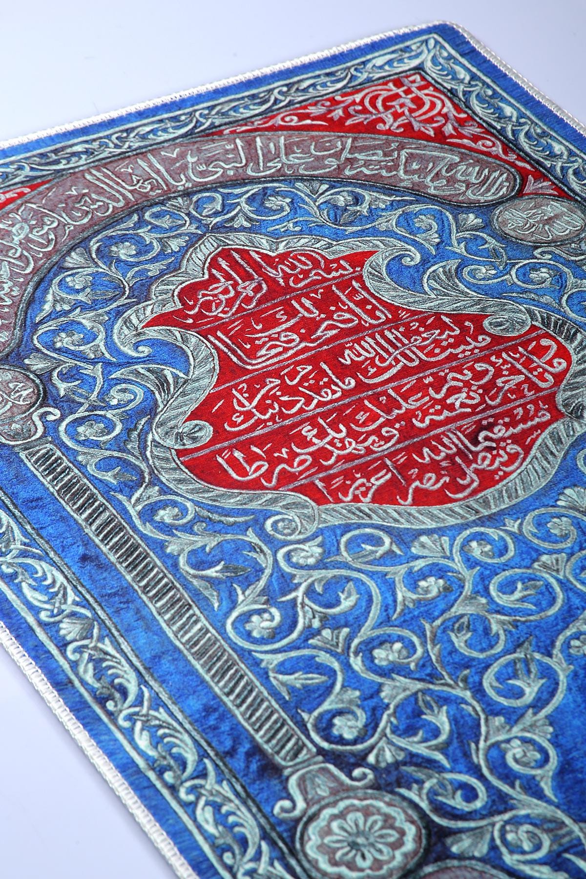 This exquisite Islamic wall hanging features rich Arabic calligraphy in bold red over a deep blue floral background. At the center, verses from the Qur’an are beautifully inscribed, surrounded by intricate floral patterns and an Ottoman tughra at the base. The border features silver-toned vines and script panels, creating a refined and spiritual visual experience.