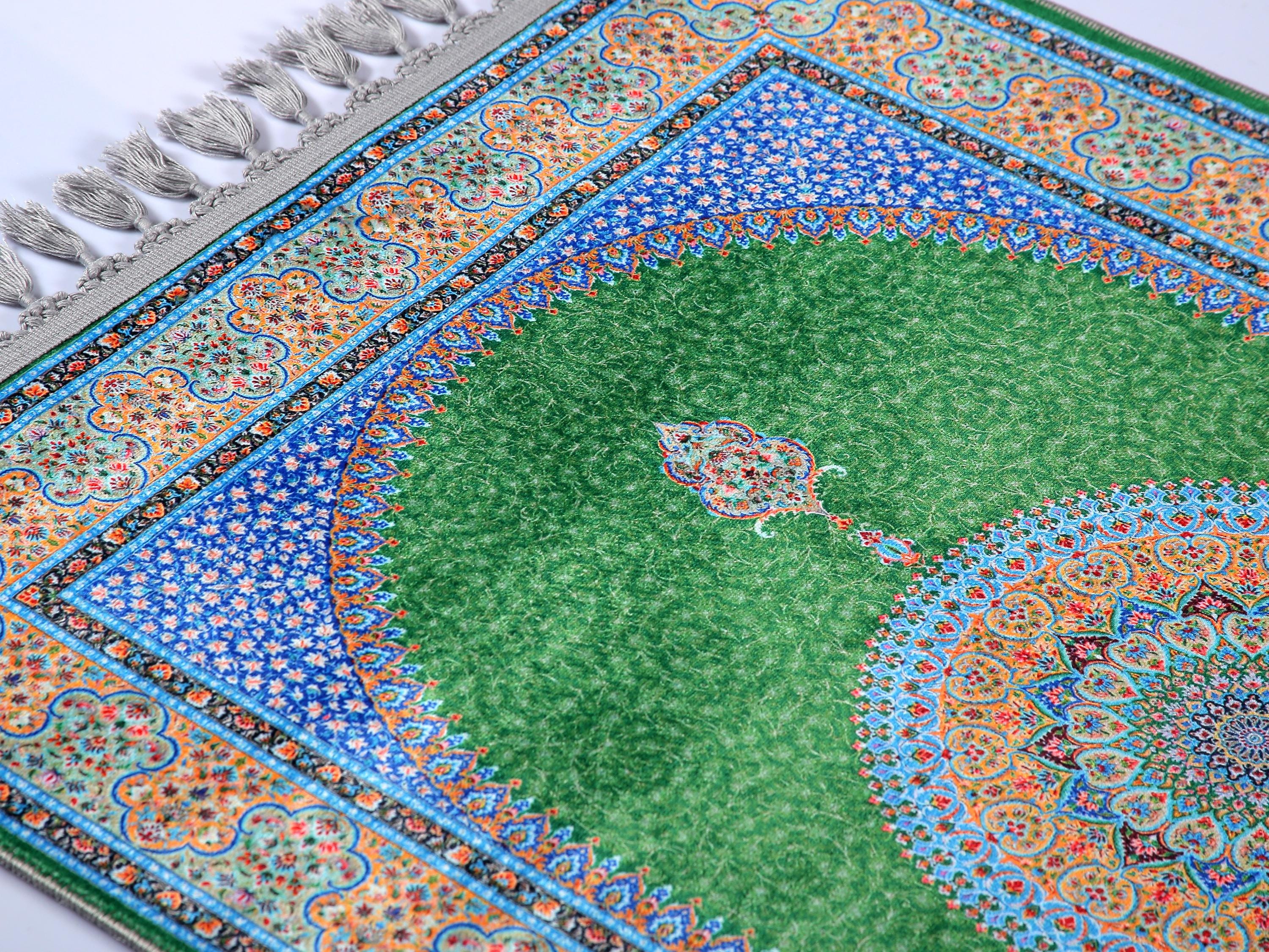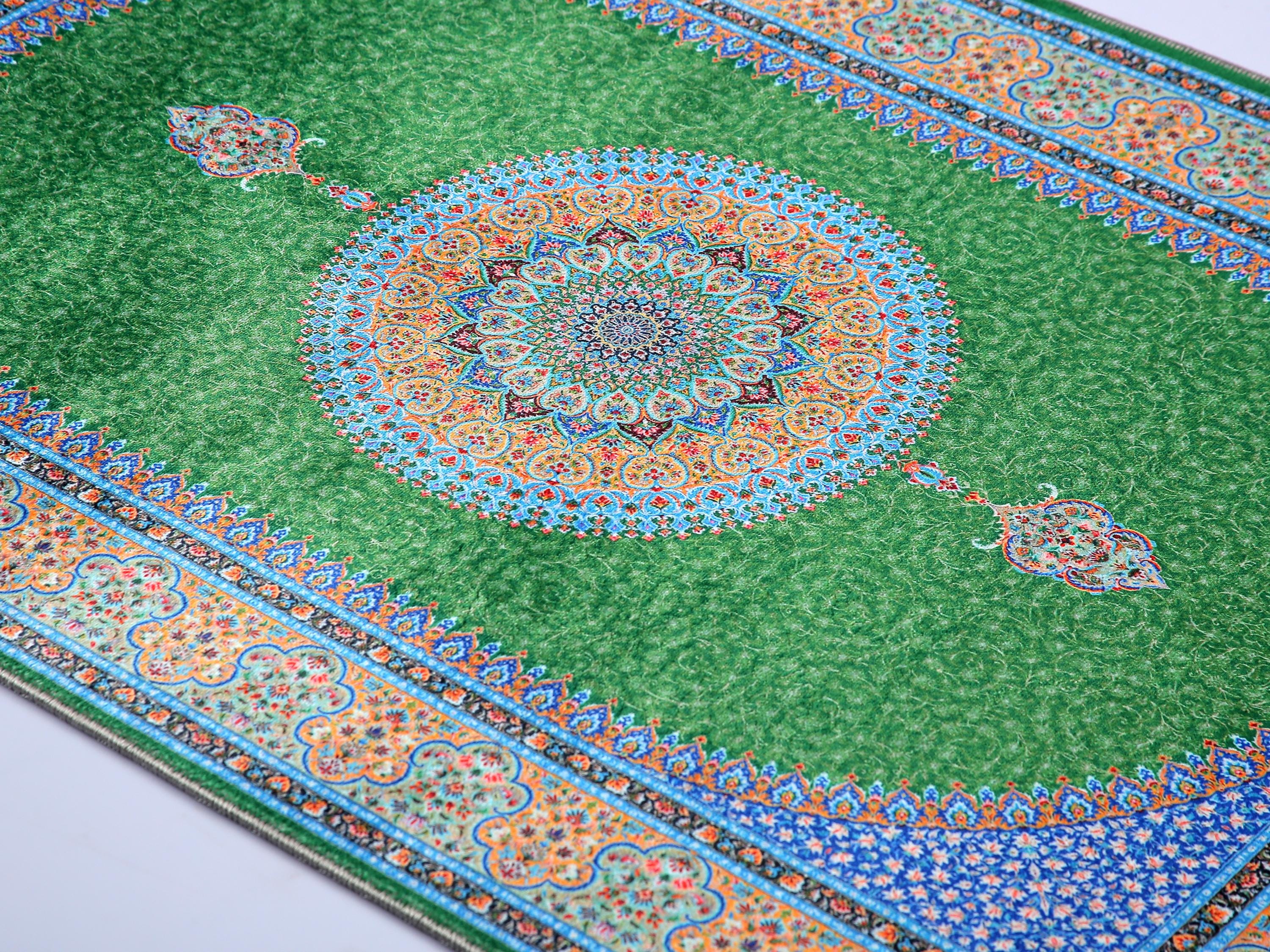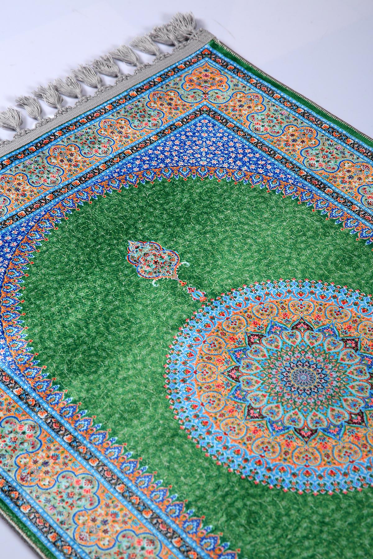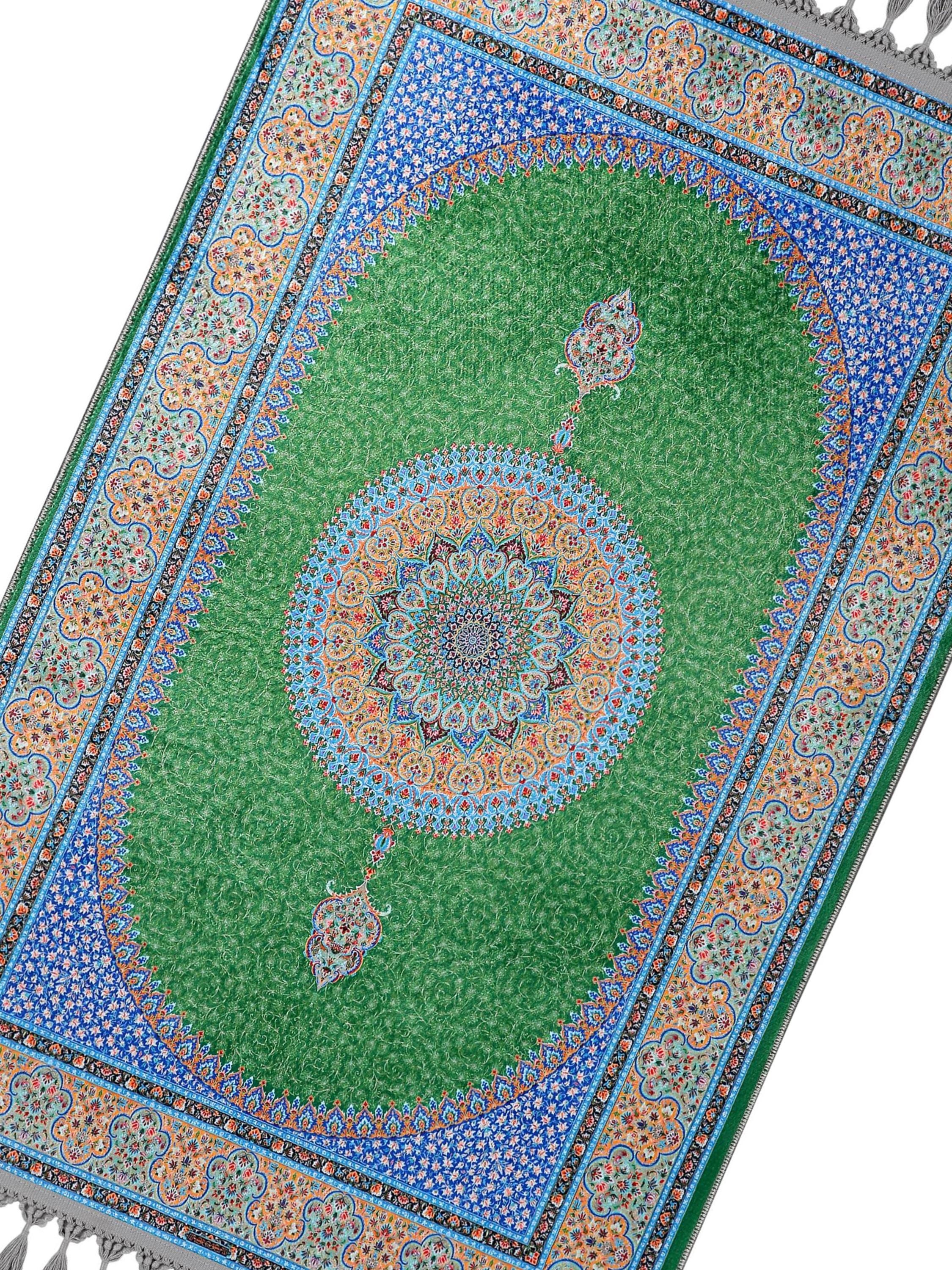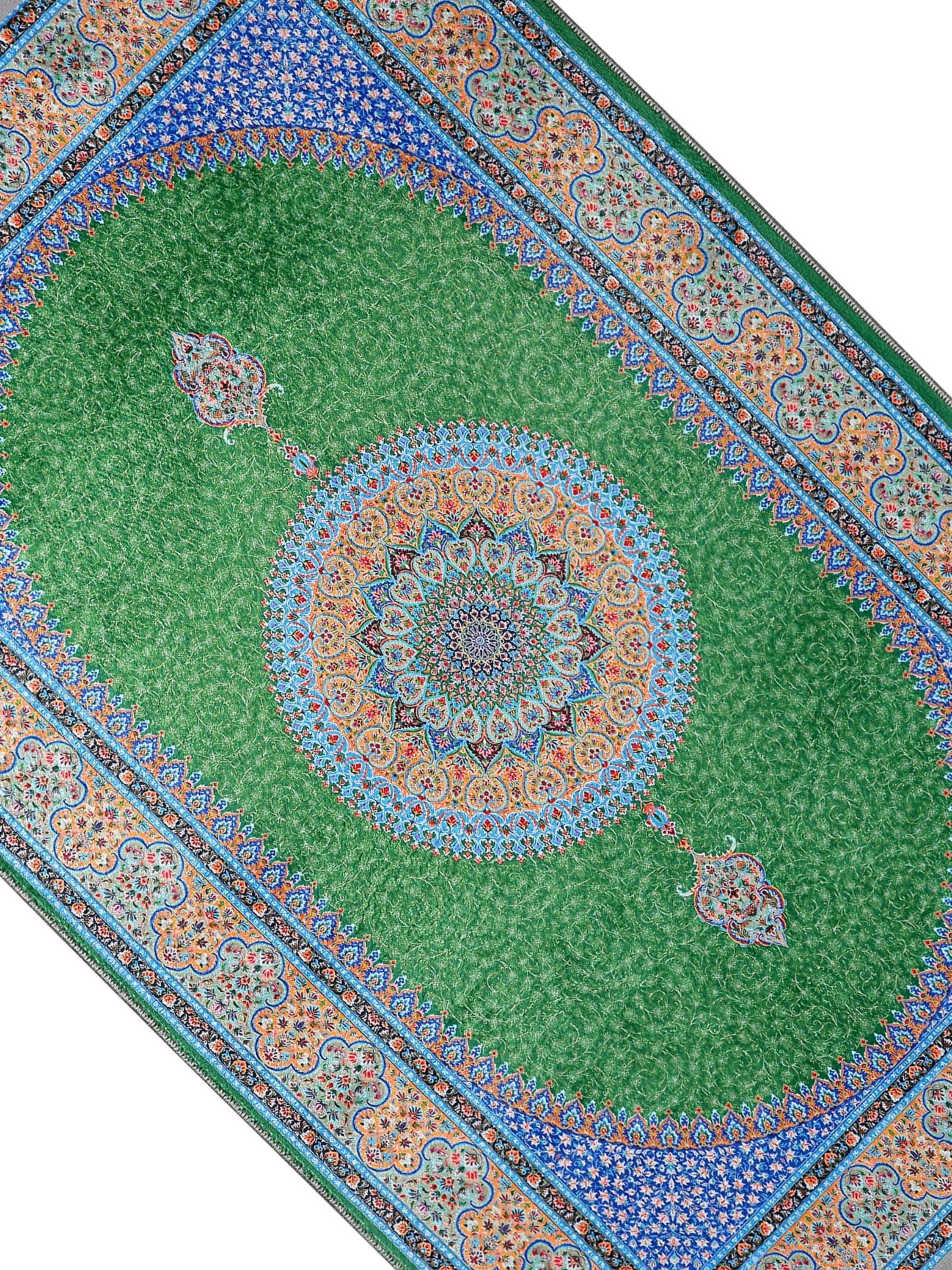 Luxury Turkish Prayer Rug – Green Medallion Islamic Carpet for Living Room and Home Decor