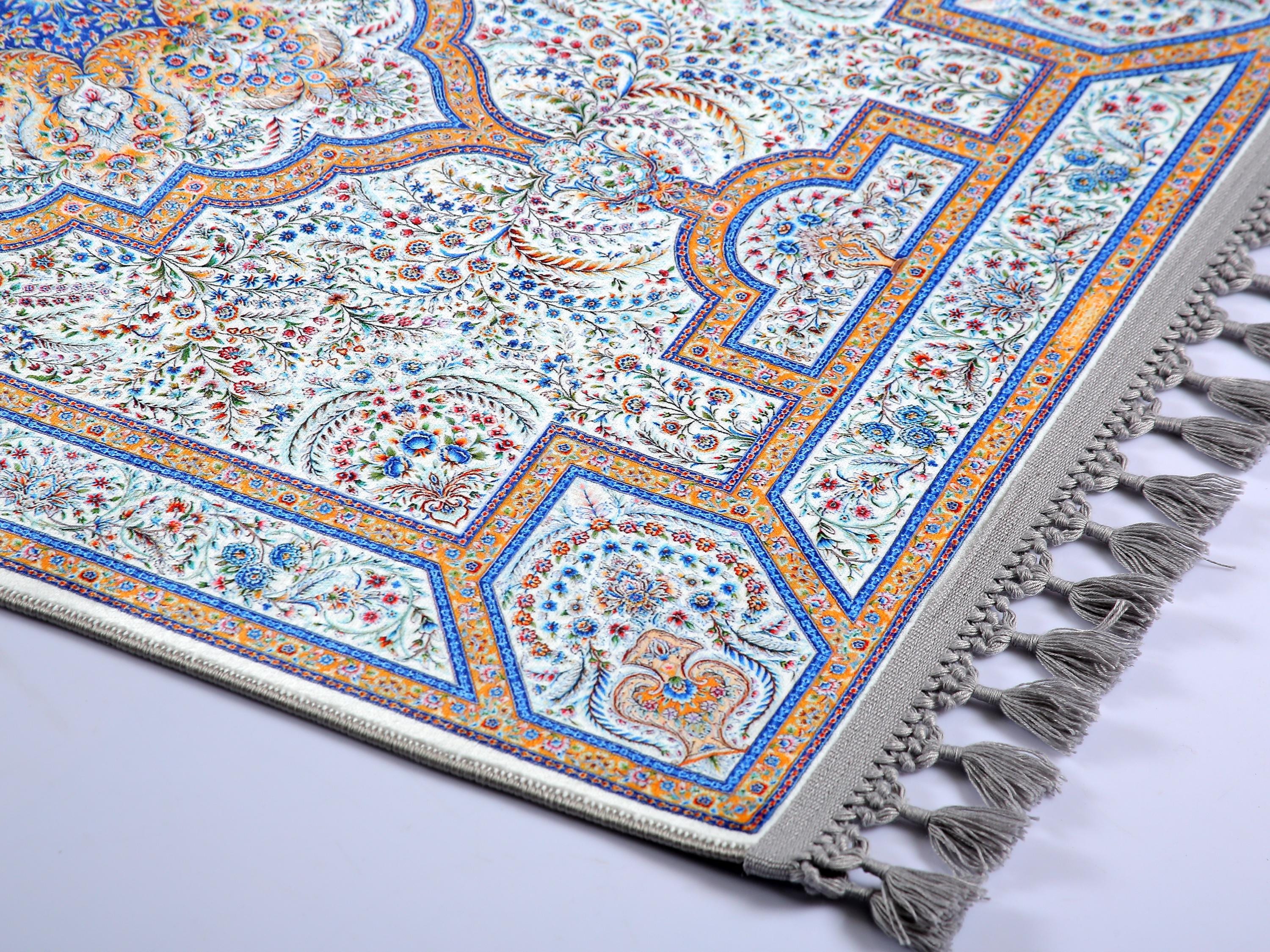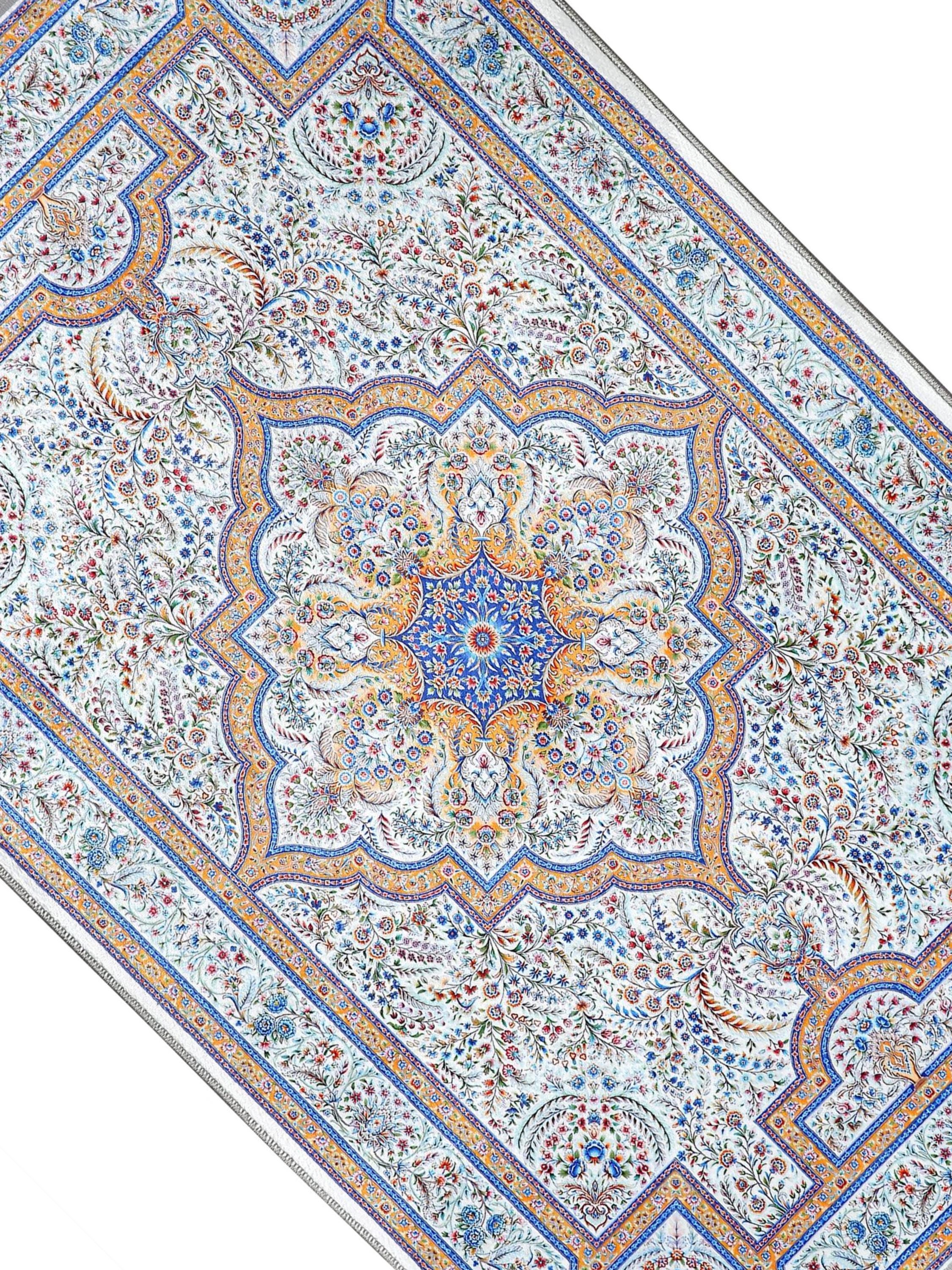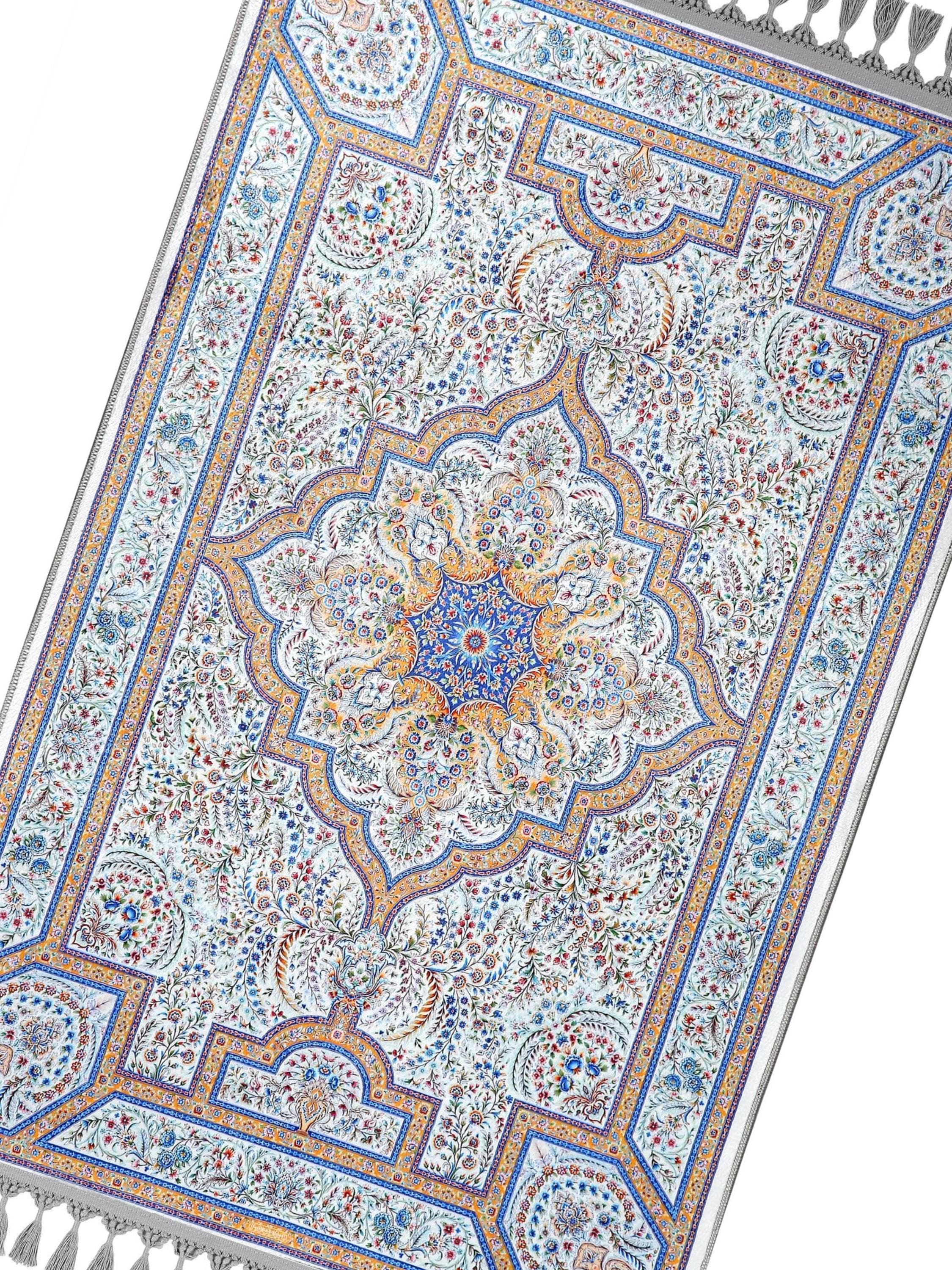🕌 Luxury White & Blue Turkish Area Rug – Islamic Floral Medallion Carpet for Elegant Home Décor
