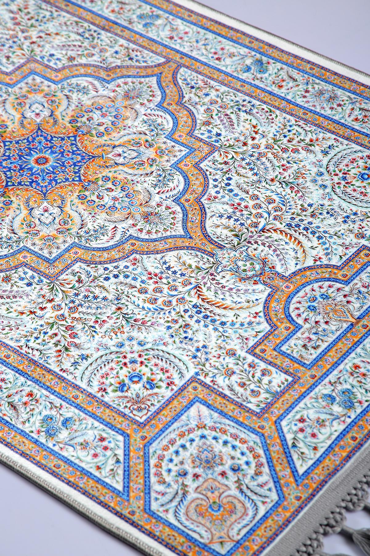 This elegant Turkish rug features a white and blue floral medallion design, blending traditional Islamic artistry with modern craftsmanship. Perfect for living rooms, bedrooms, dining areas, entryways, or prayer corners.