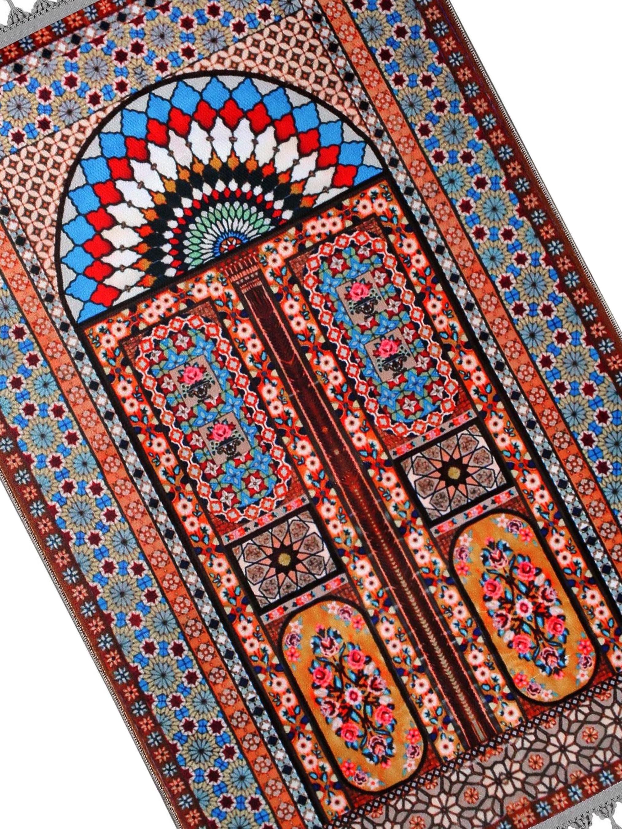 Vibrant red and blue floral mihrab design blends sacred tradition with refined Turkish artistry. Crafted for comfort and elegance, perfect for daily prayer or displayed as an Islamic wall tapestry.