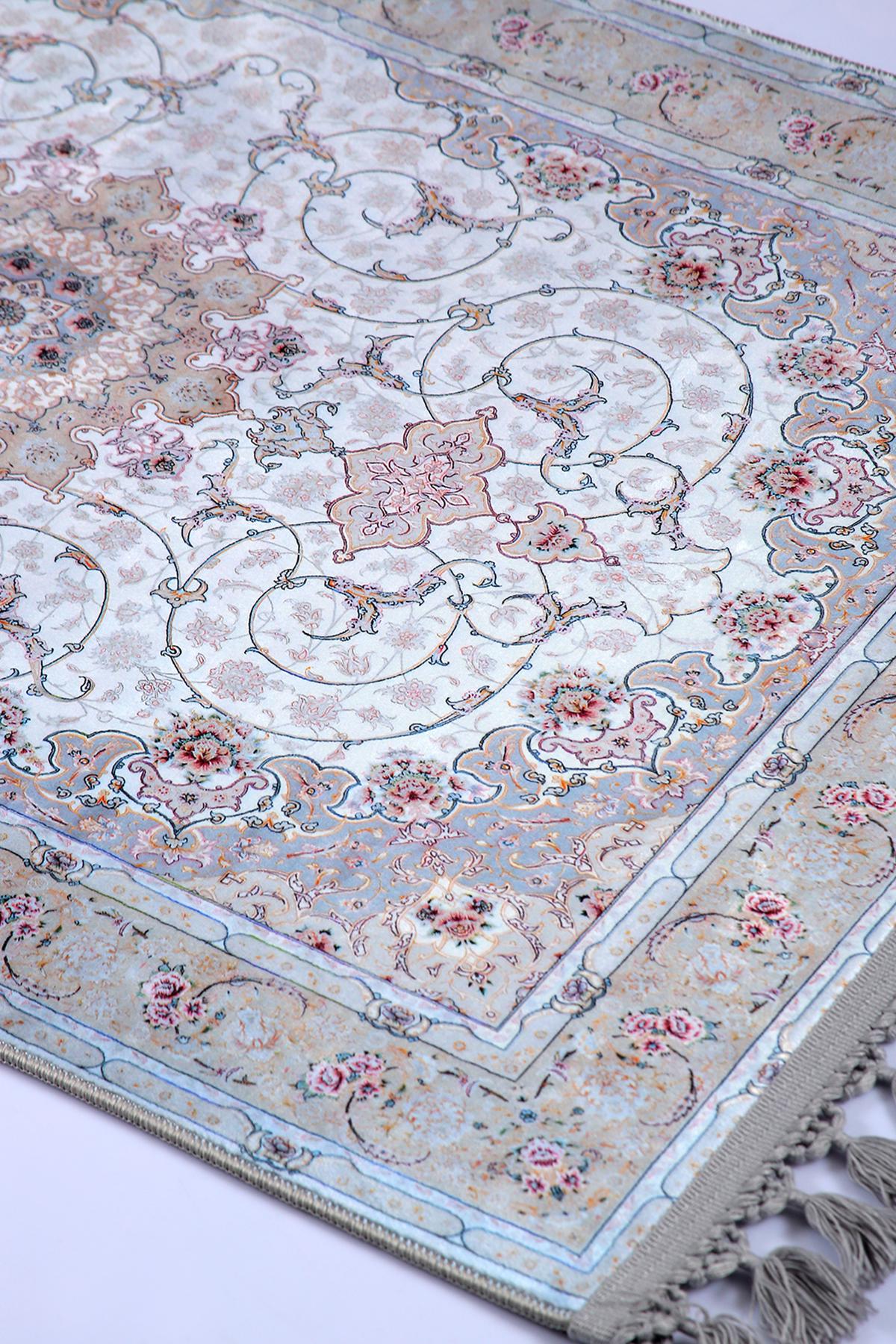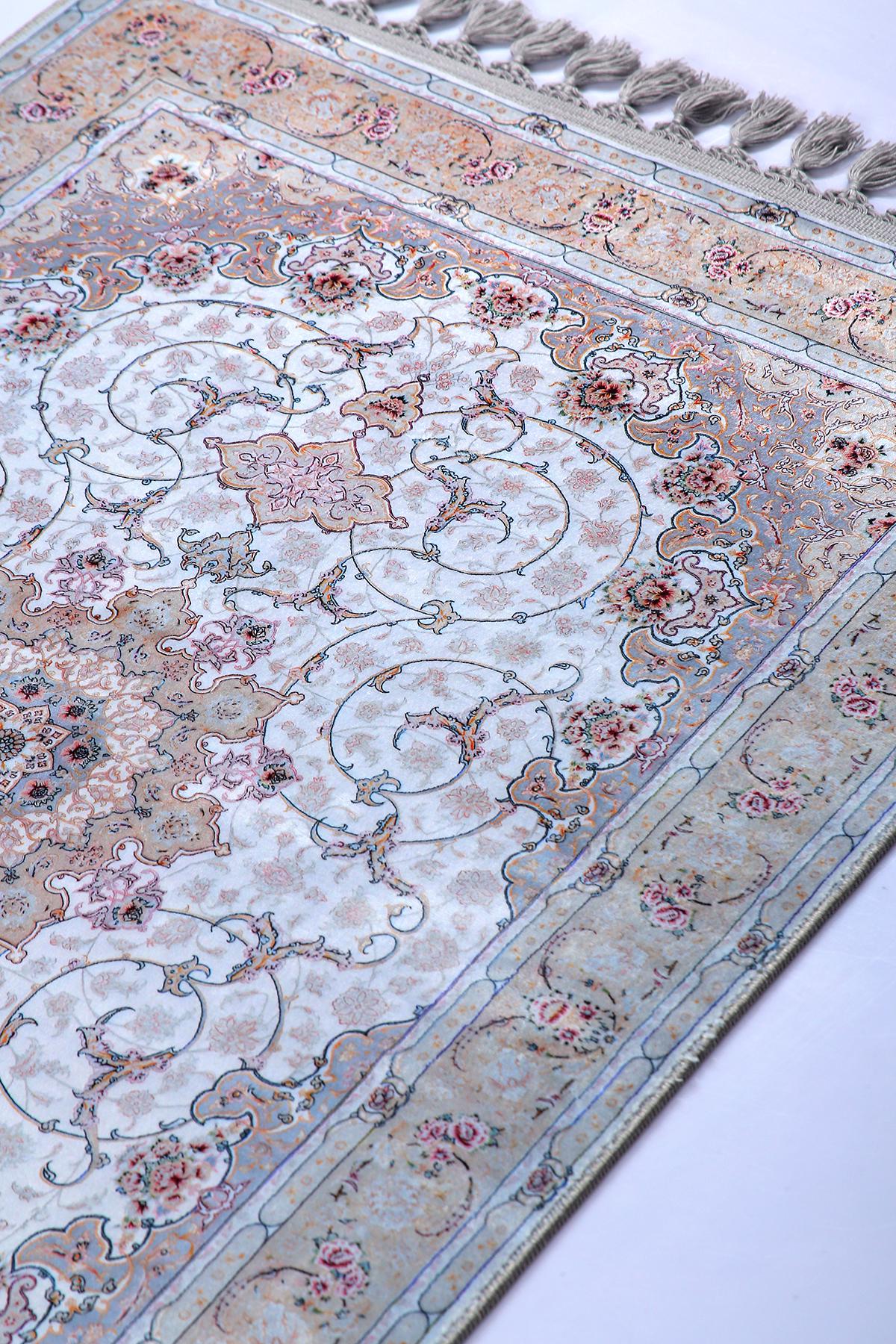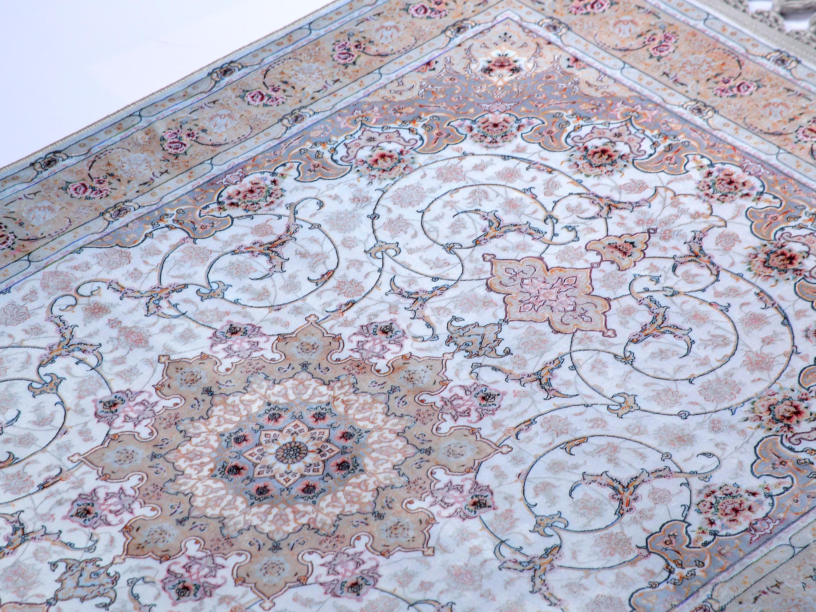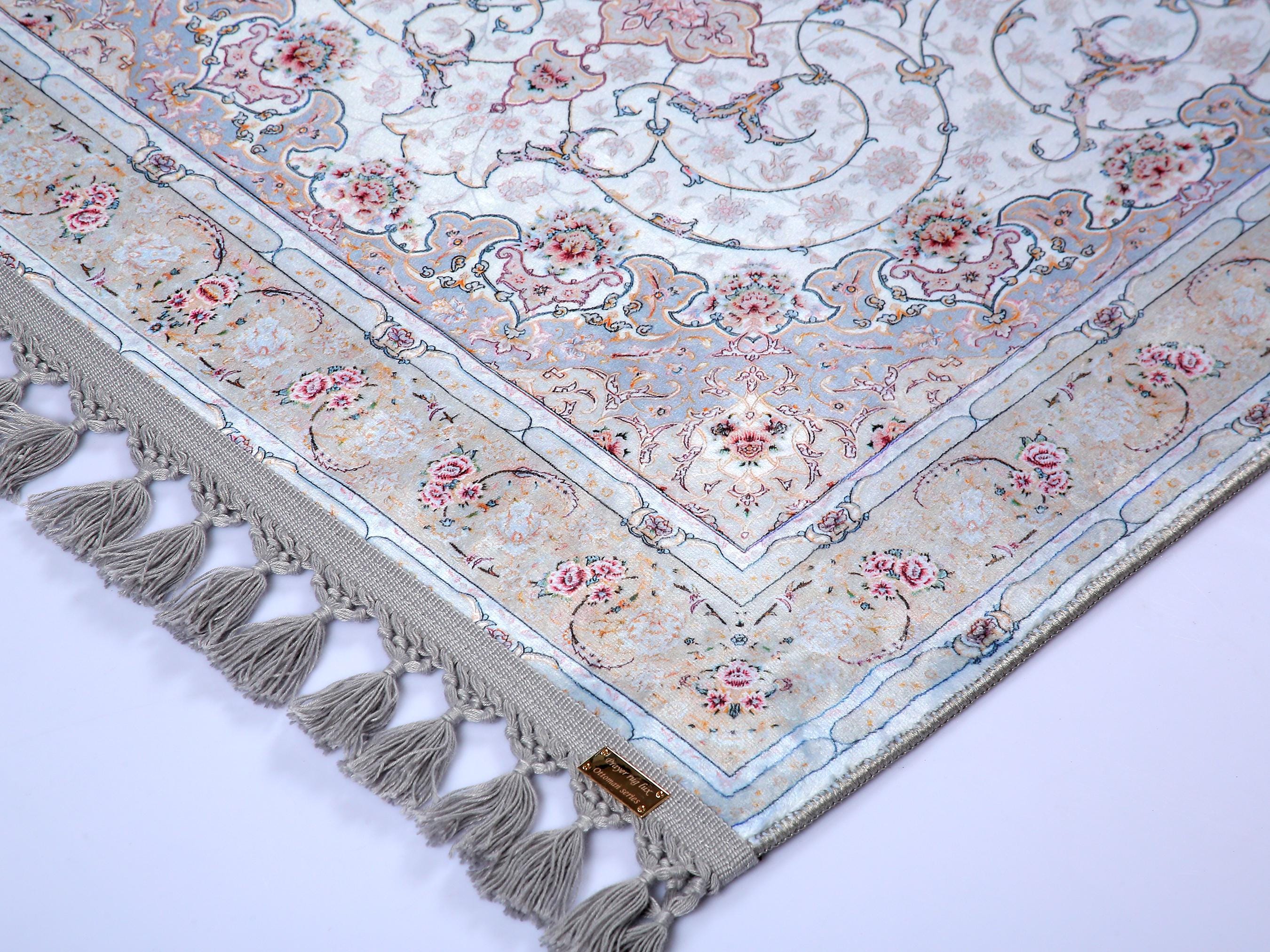 This elegant light blue Persian-style rug is a perfect blend of classical charm and modern elegance. Featuring a central floral medallion with delicate rose accents and a silk-touch texture, it brings serenity and sophistication to any prayer space or living area.