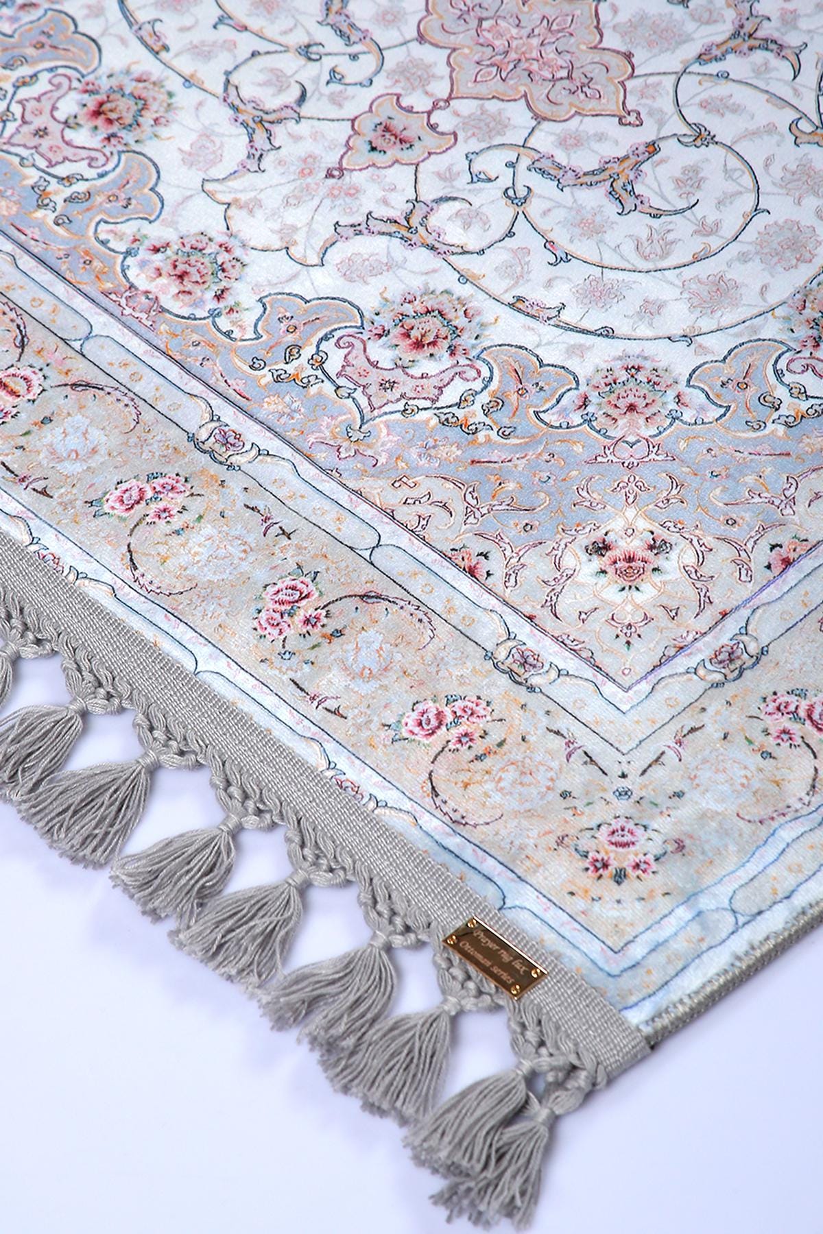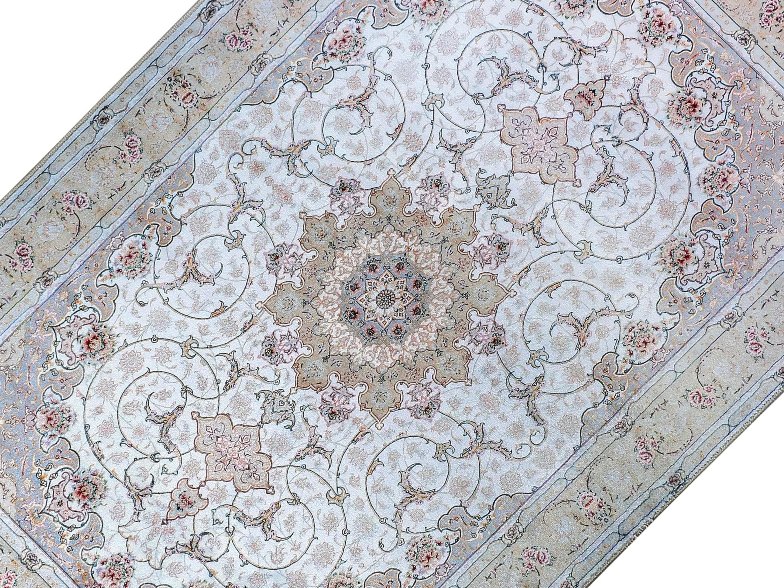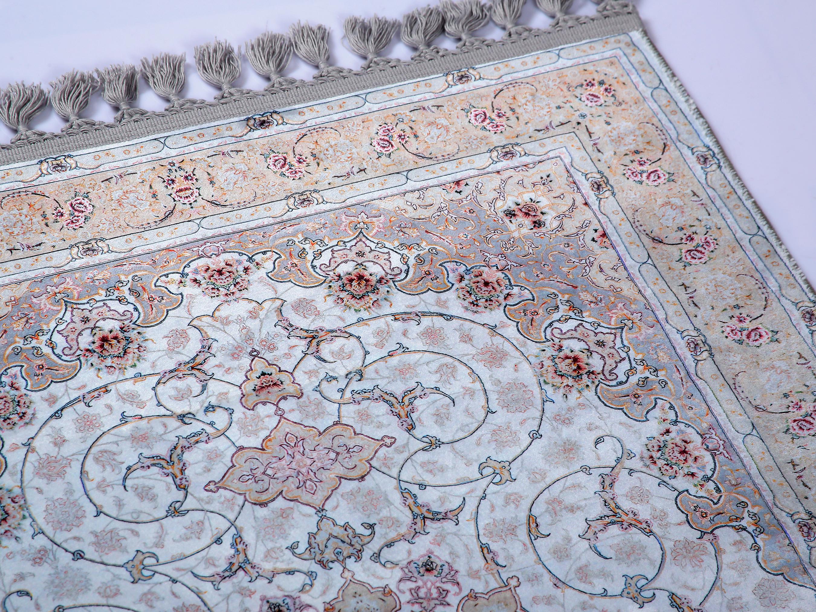 This elegant light blue Persian-style rug is a perfect blend of classical charm and modern elegance. Featuring a central floral medallion with delicate rose accents and a silk-touch texture, it brings serenity and sophistication to any prayer space or living area.