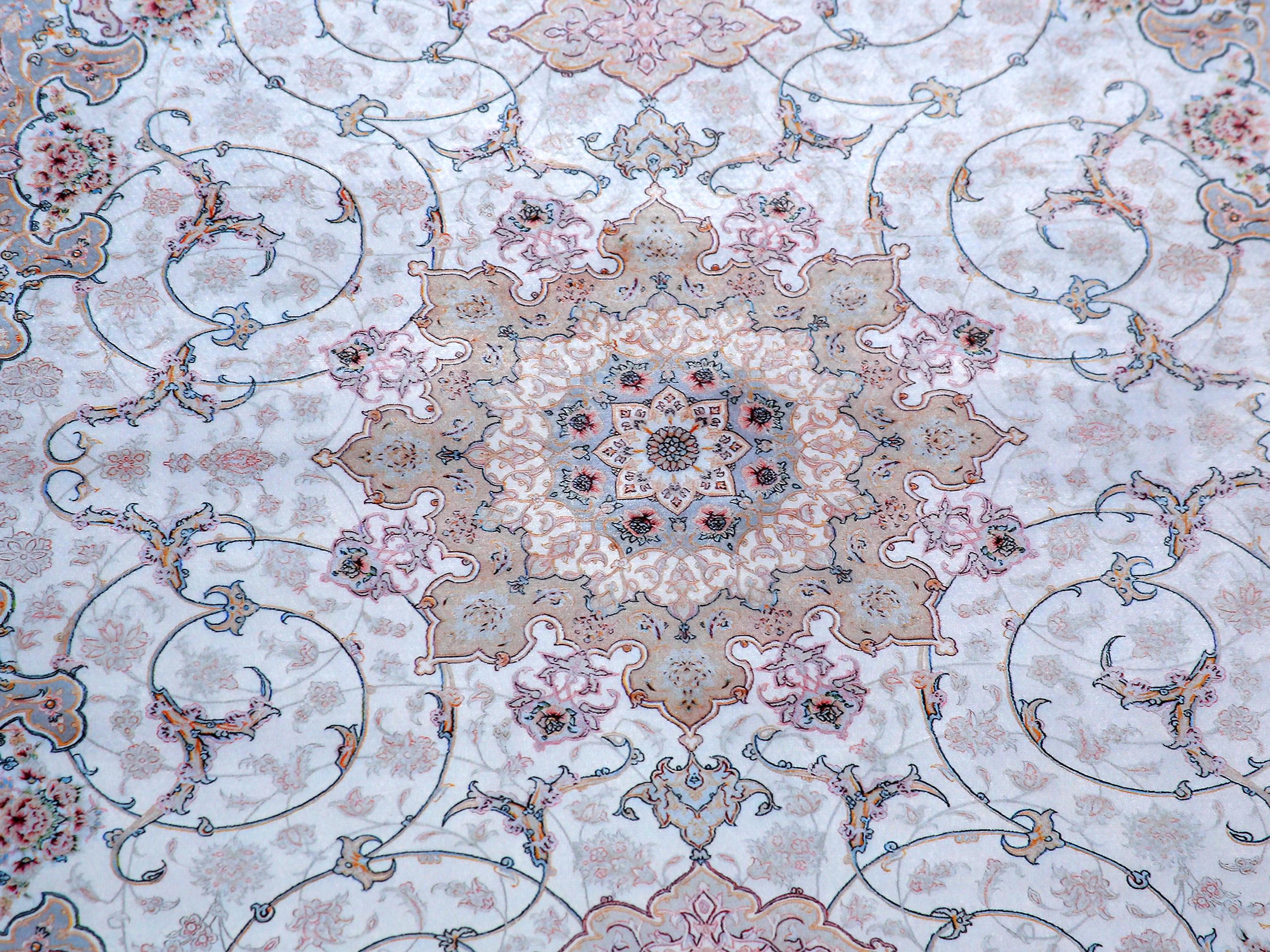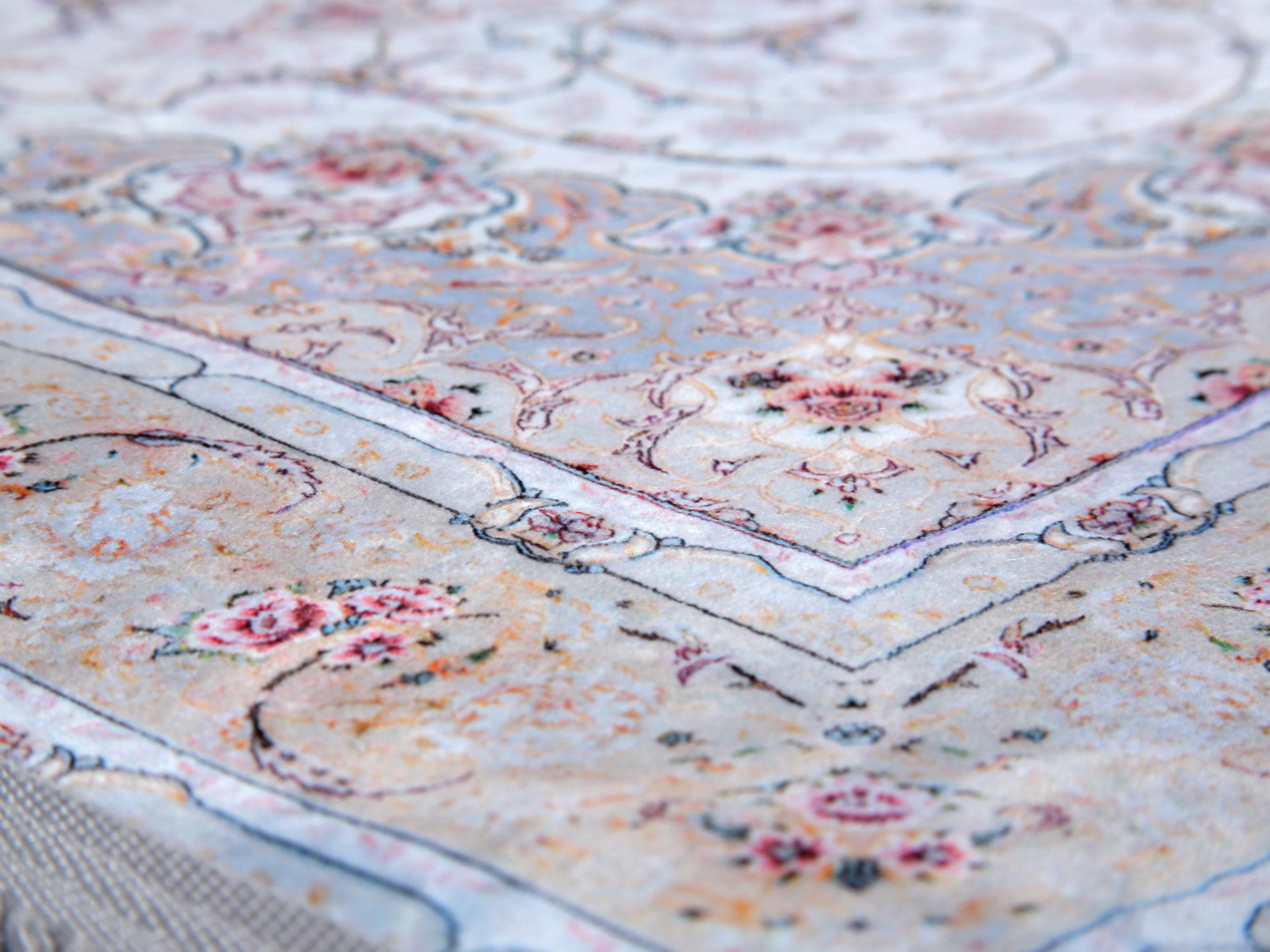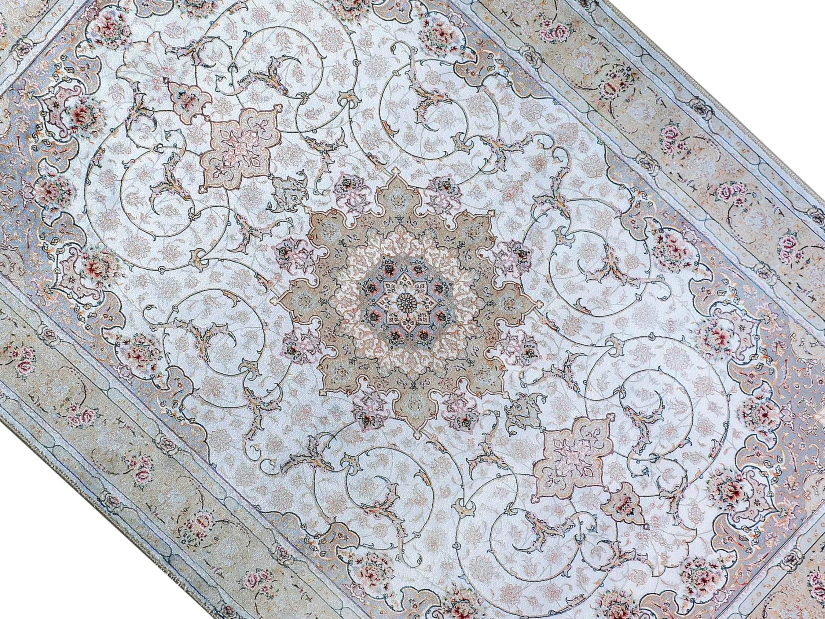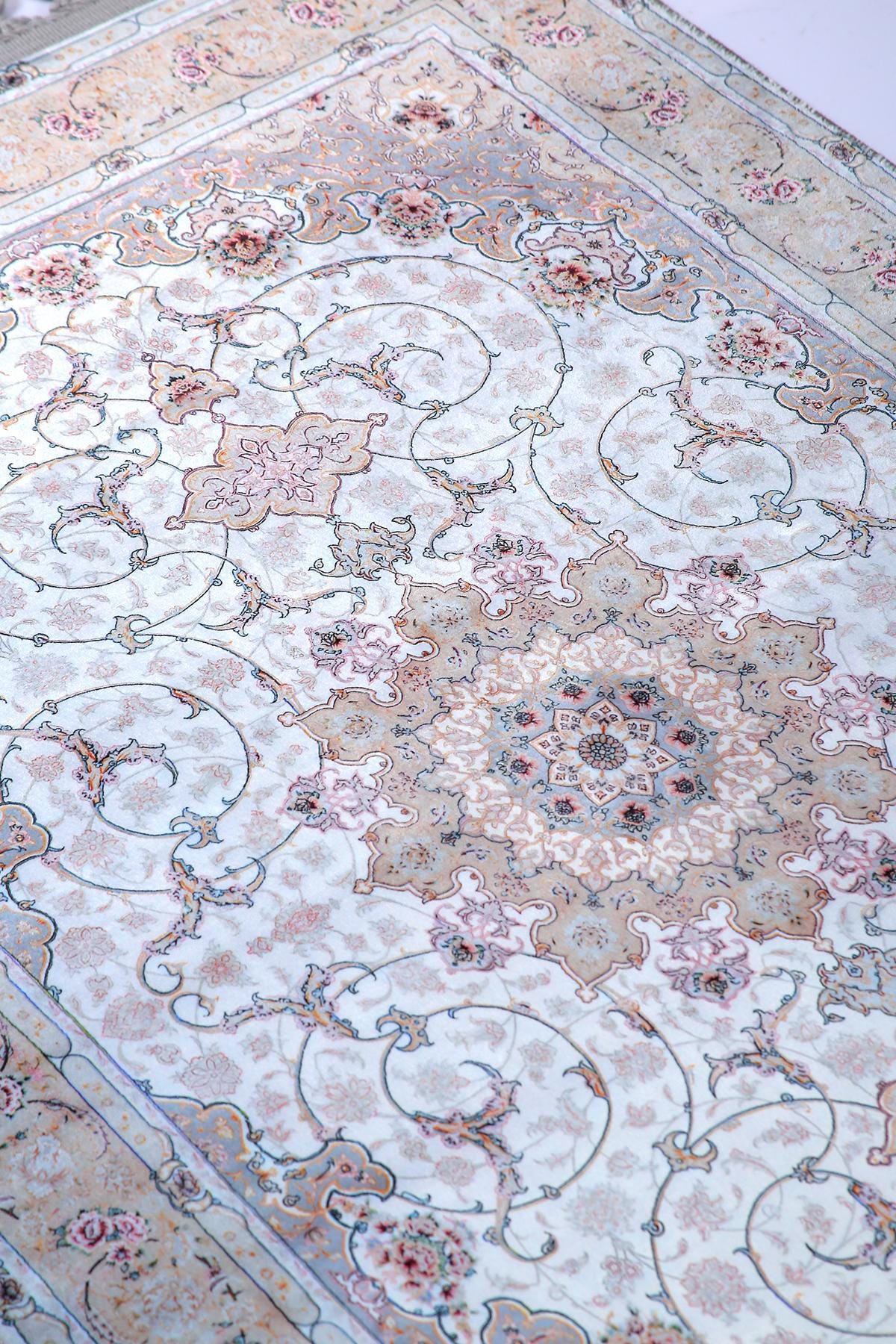 This elegant light blue Persian-style rug is a perfect blend of classical charm and modern elegance. Featuring a central floral medallion with delicate rose accents and a silk-touch texture, it brings serenity and sophistication to any prayer space or living area.