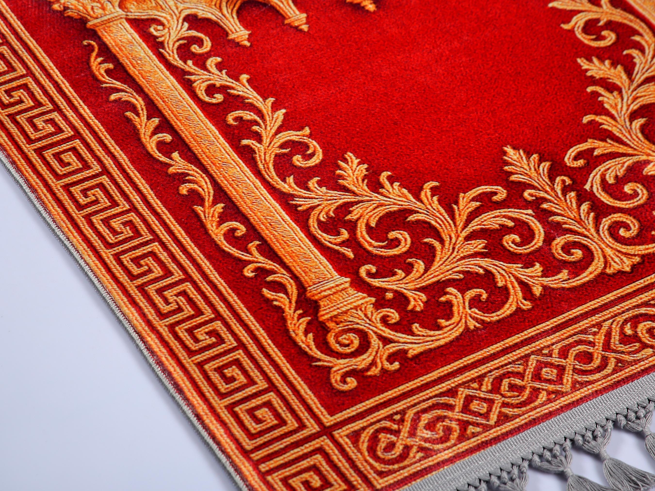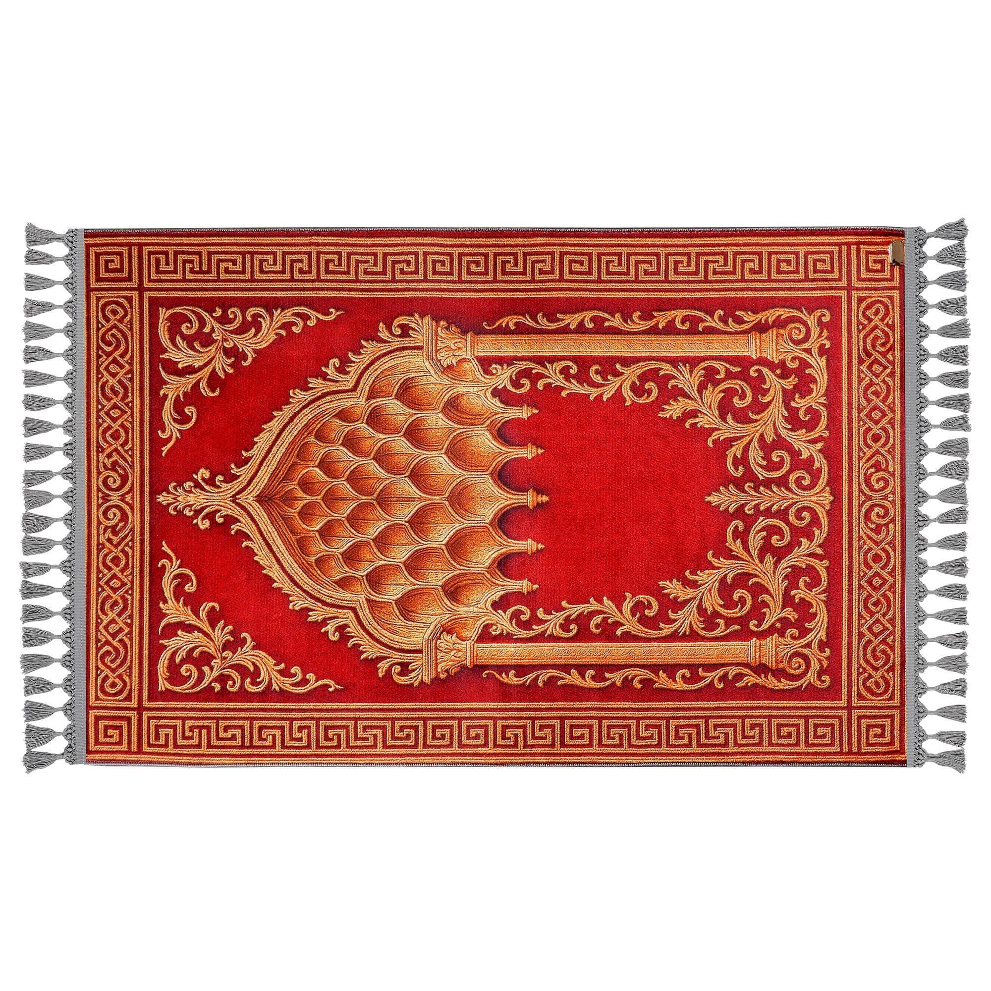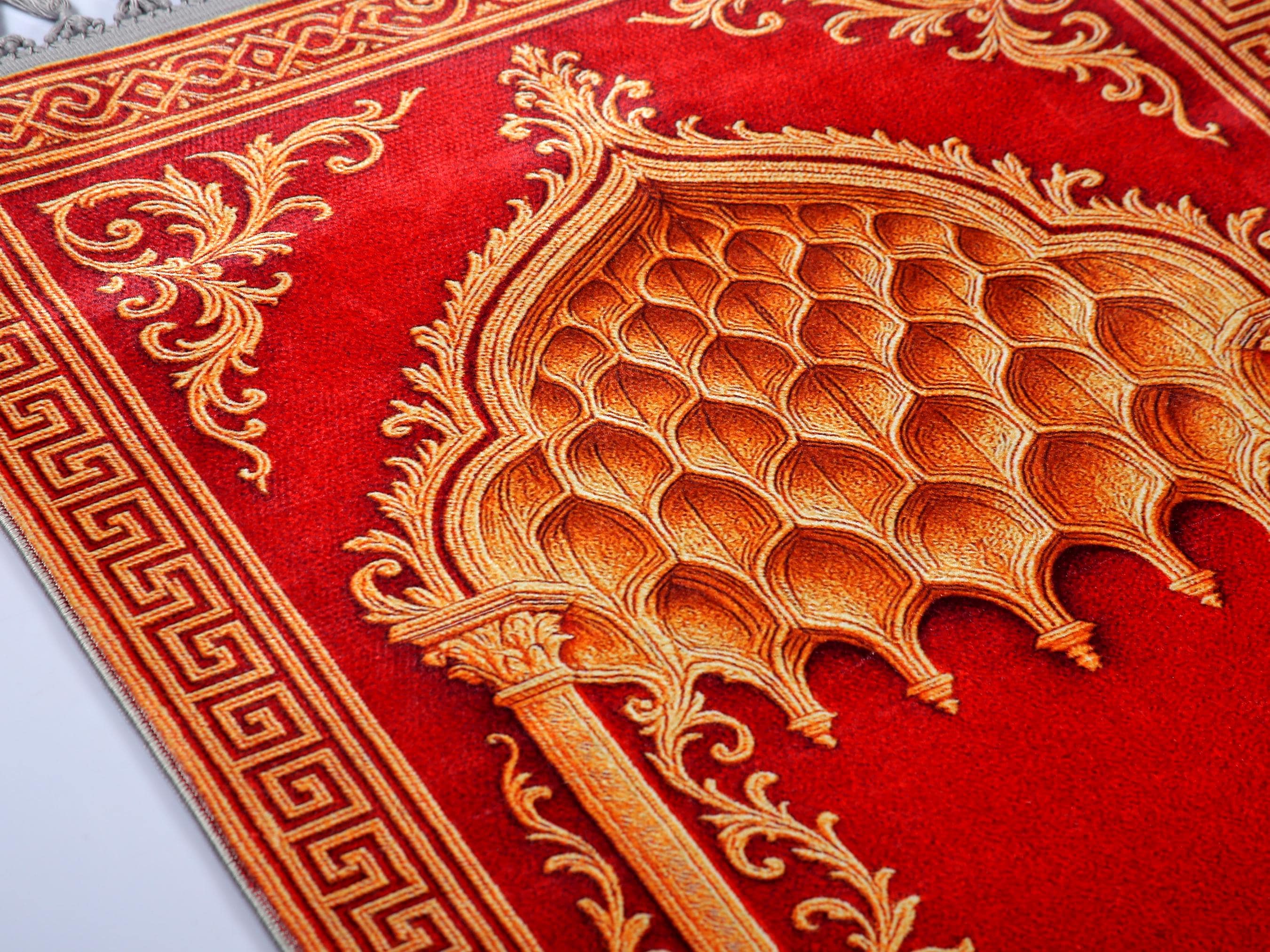 Elevate your space with this luxurious Red Golden Islamic Prayer Rug, adorned with intricate Ottoman-inspired patterns. Perfect for daily prayers or as a decorative wall hanging in your prayer room or living space.