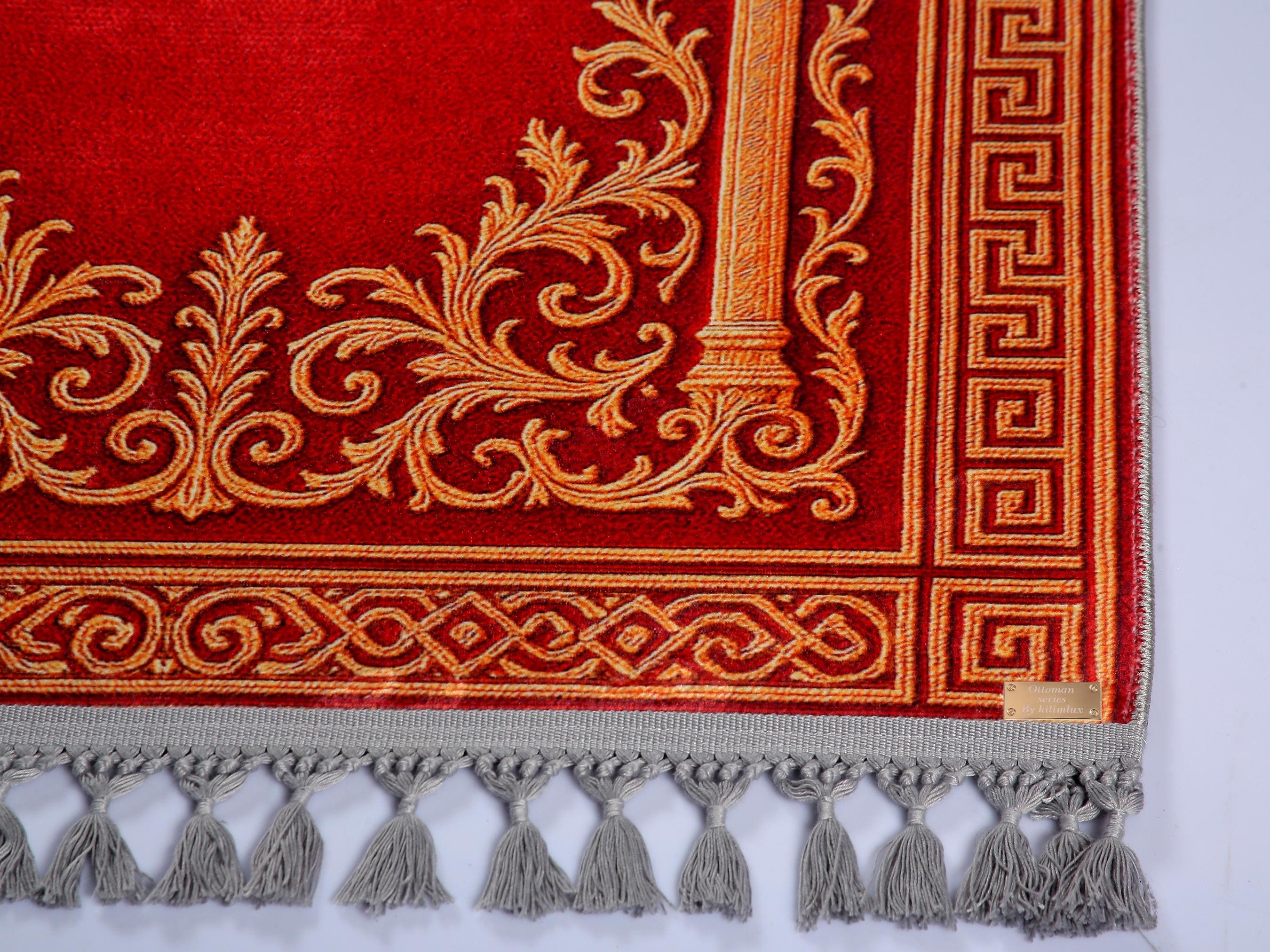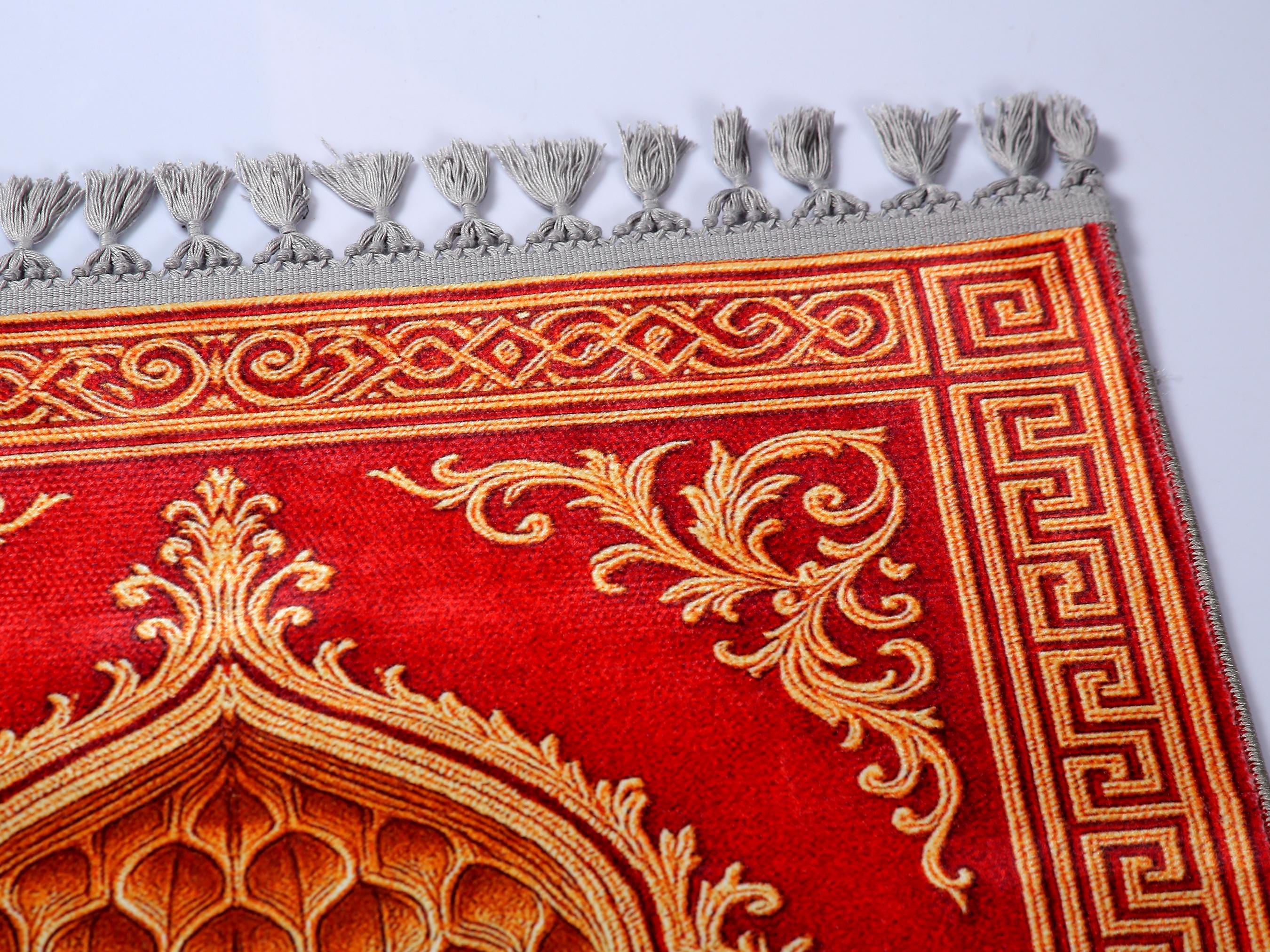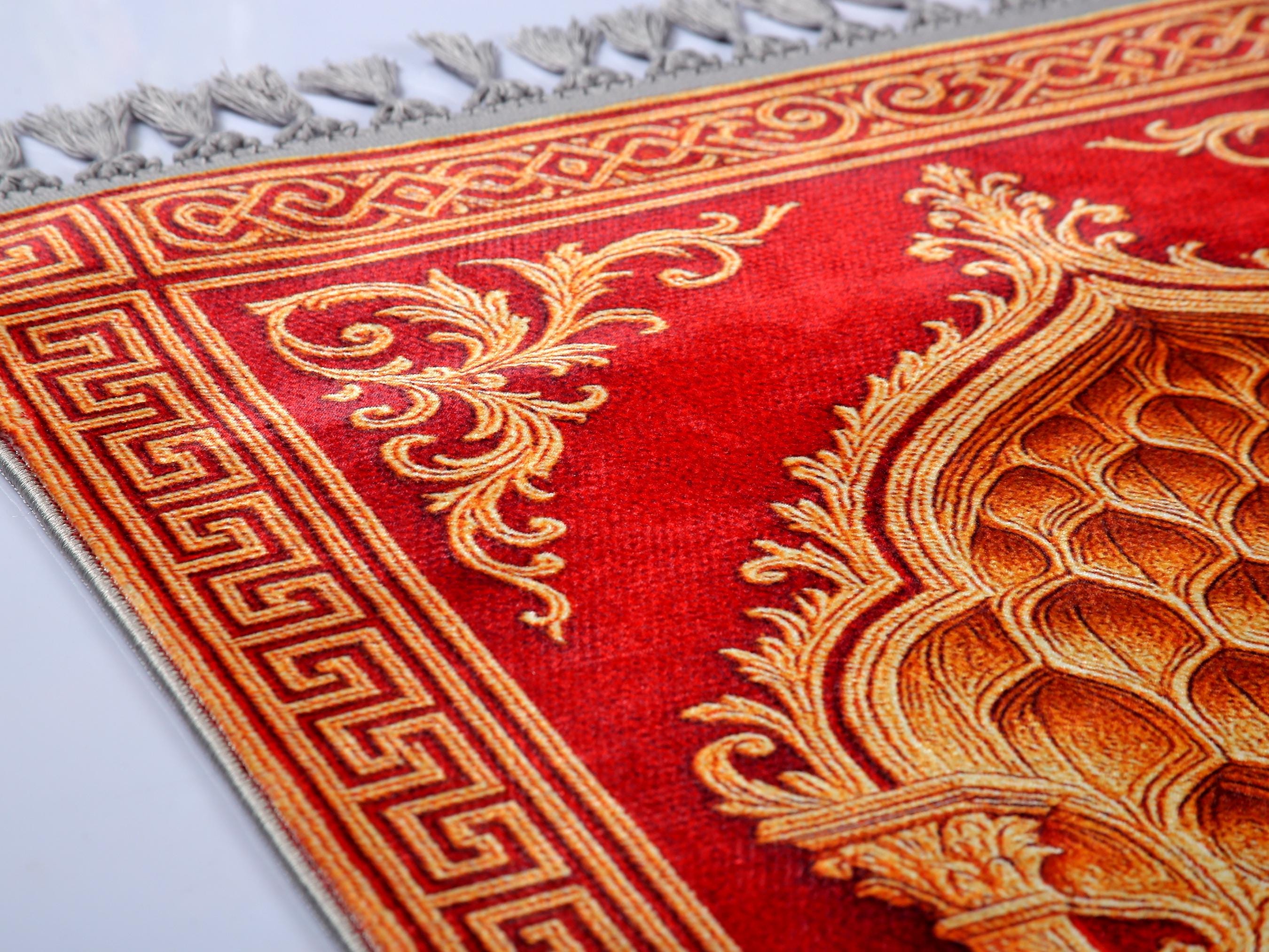 Elevate your space with this luxurious Red Golden Islamic Prayer Rug, adorned with intricate Ottoman-inspired patterns. Perfect for daily prayers or as a decorative wall hanging in your prayer room or living space.