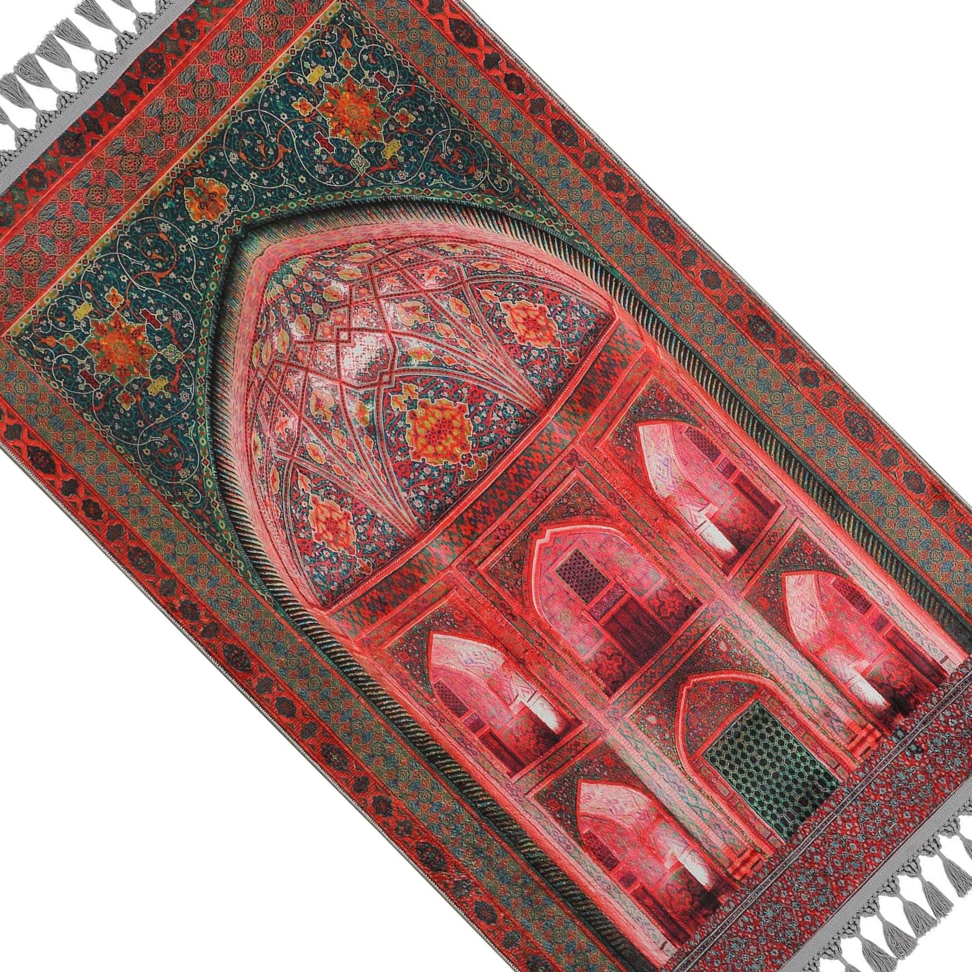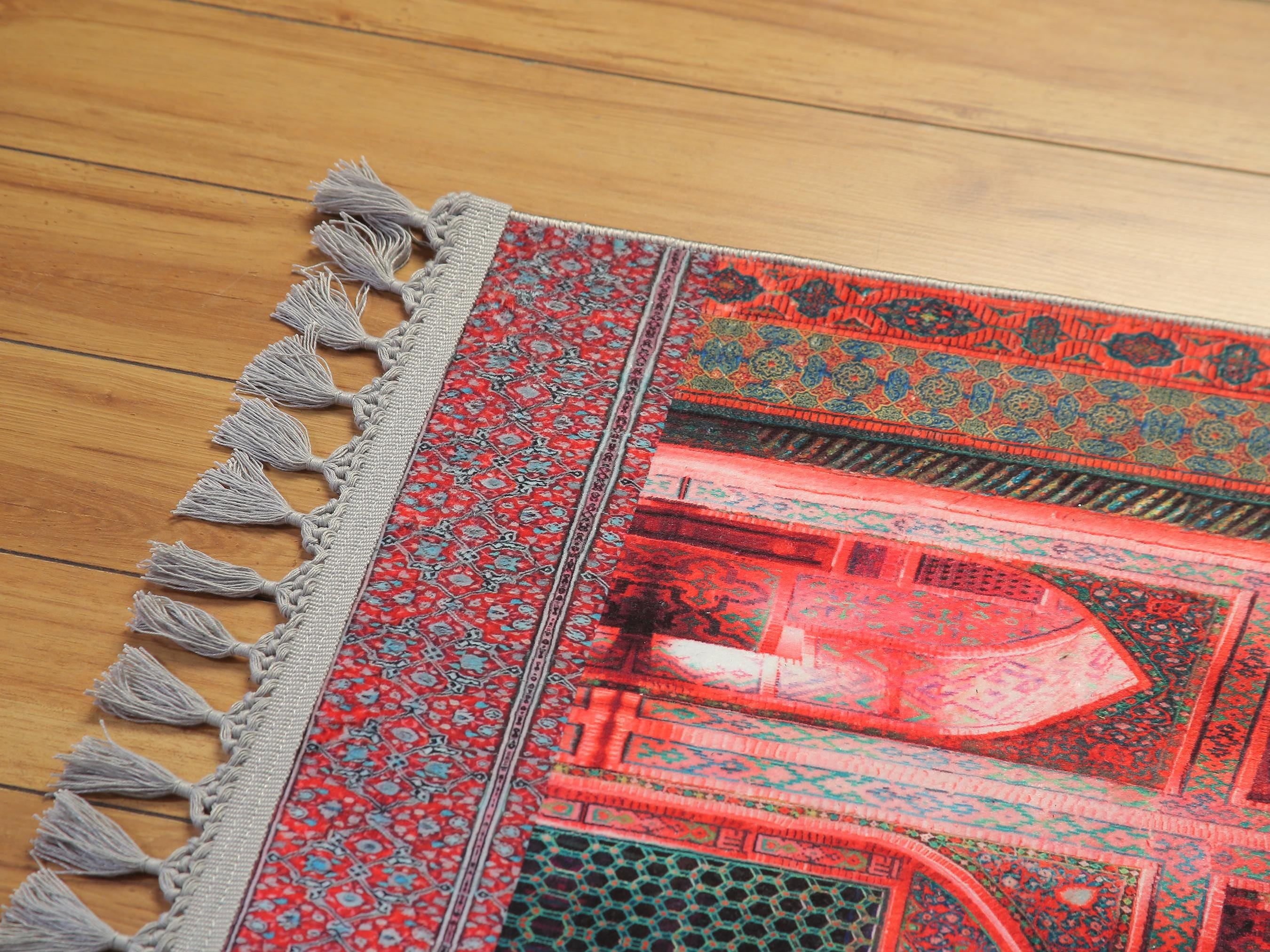 🎨 Color Palette: Deep Red Field with Emerald Green Mihrab & Cream Accents – Bold, Peaceful & Elegant