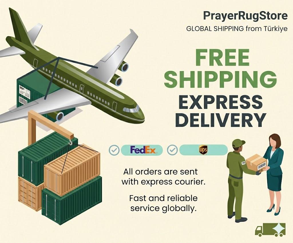 Yes, we ship Turkish prayer rugs worldwide with free tracked shipping. Delivery usually takes 5–12 business days depending on your location. All orders include secure packaging to protect your rug in transit.