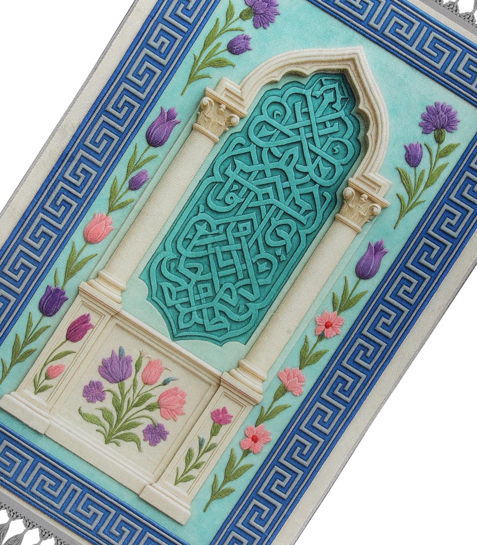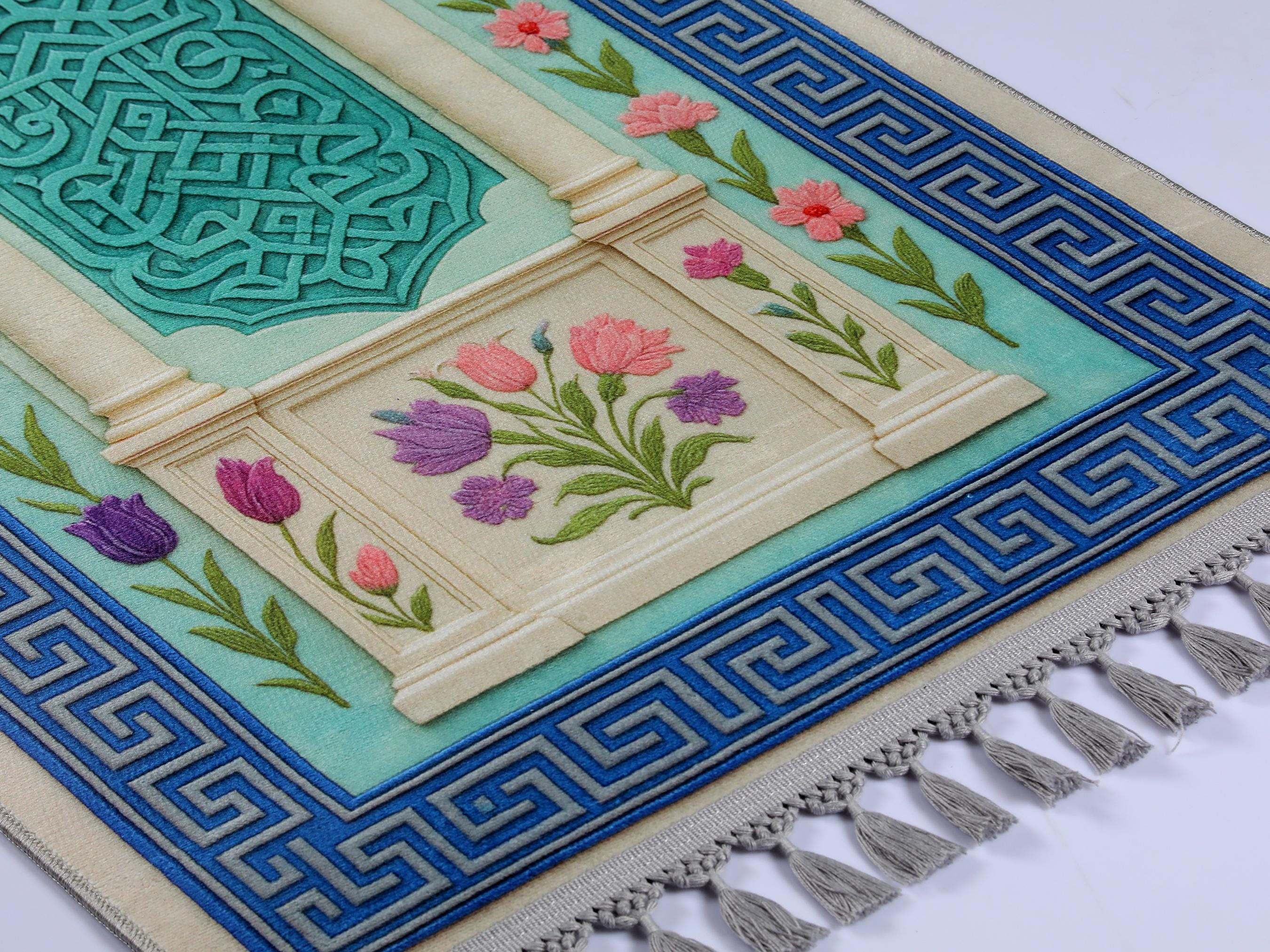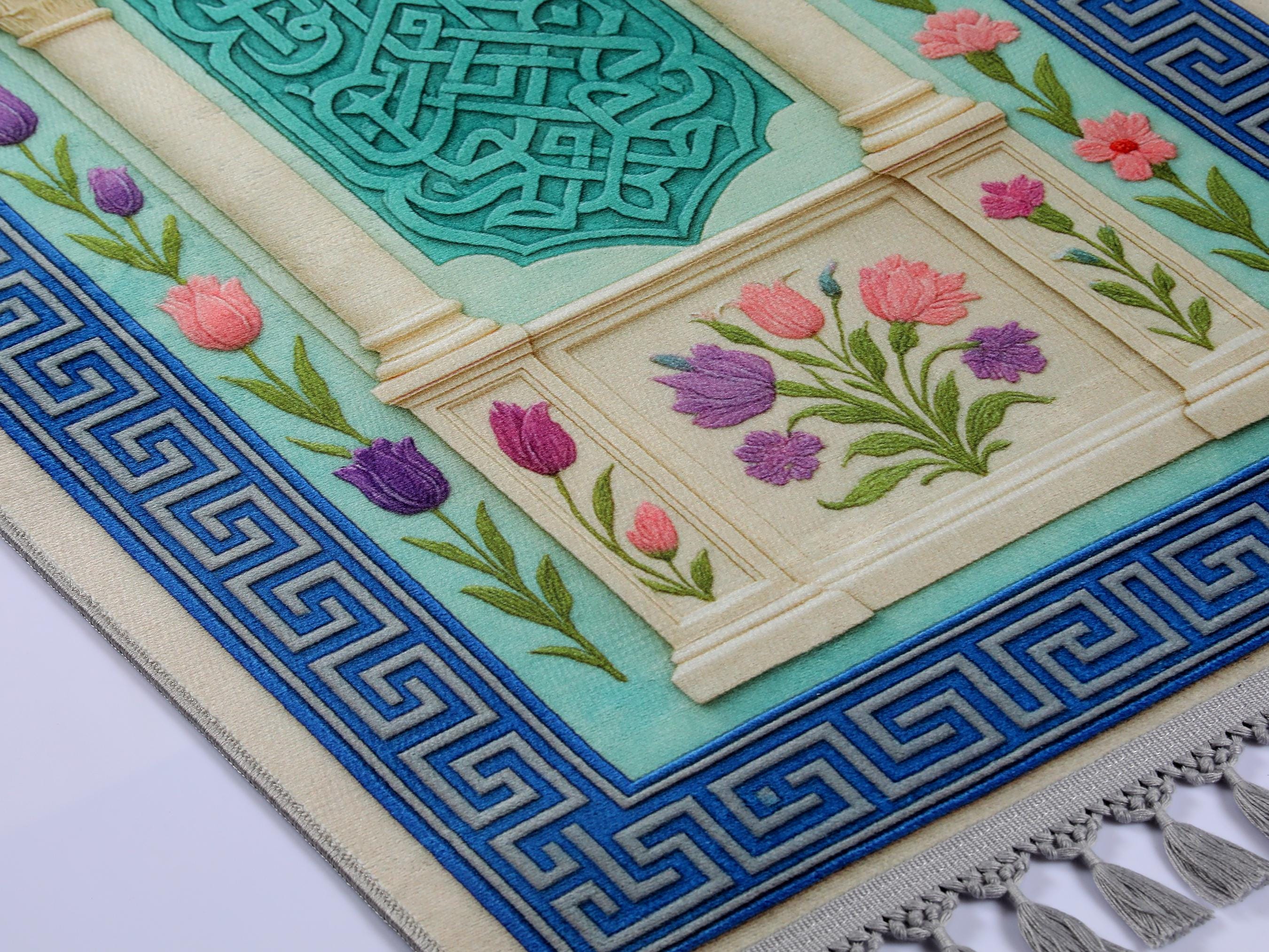 This striking prayer rug features a **mihrab rendered in a unique shade of turquoise**, framed by **pink floral Ottoman border motifs**, evoking the serene majesty of Islamic architecture. With geometric balance and symmetrical composition, it transforms any prayer space into a place of elegance and peace.
